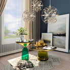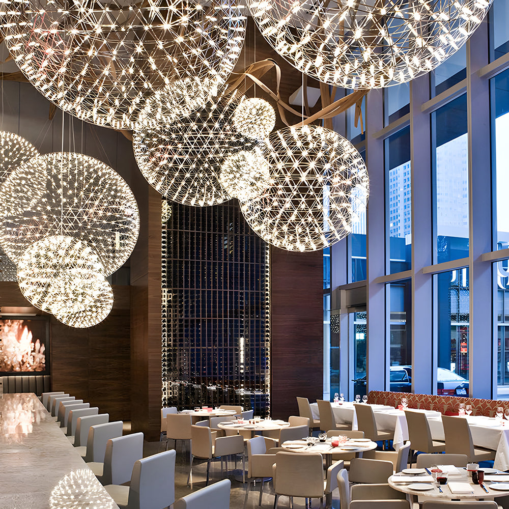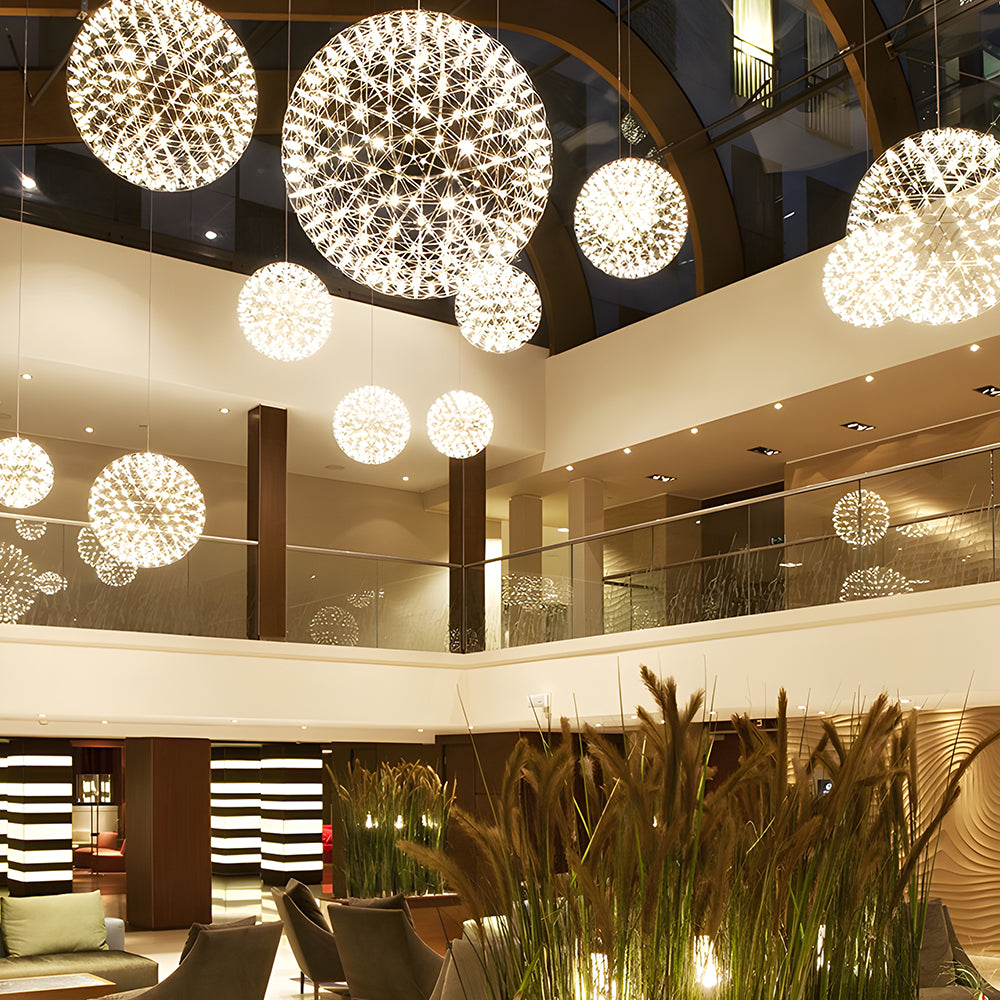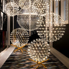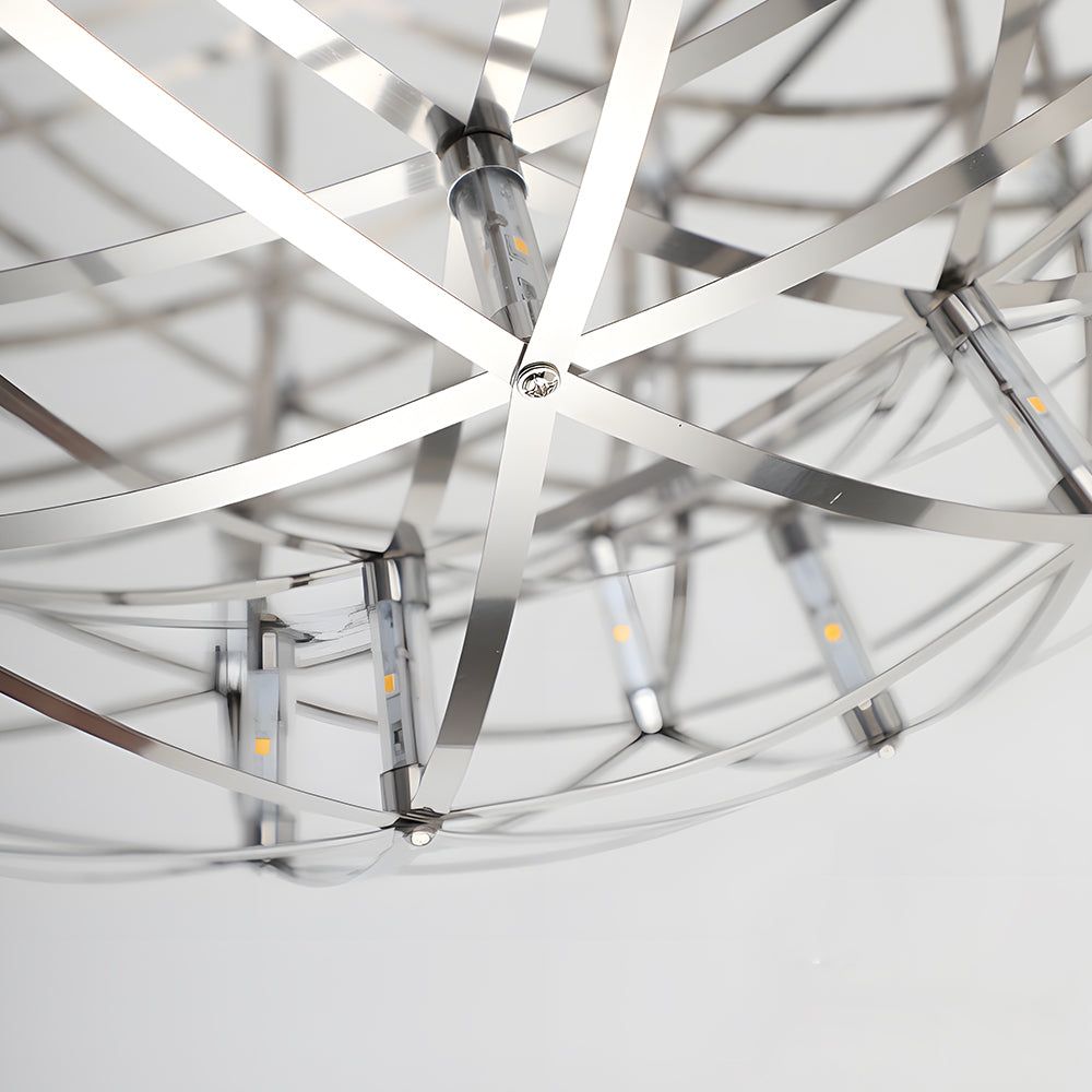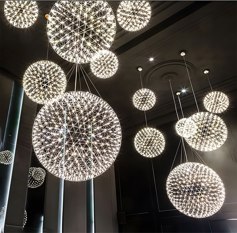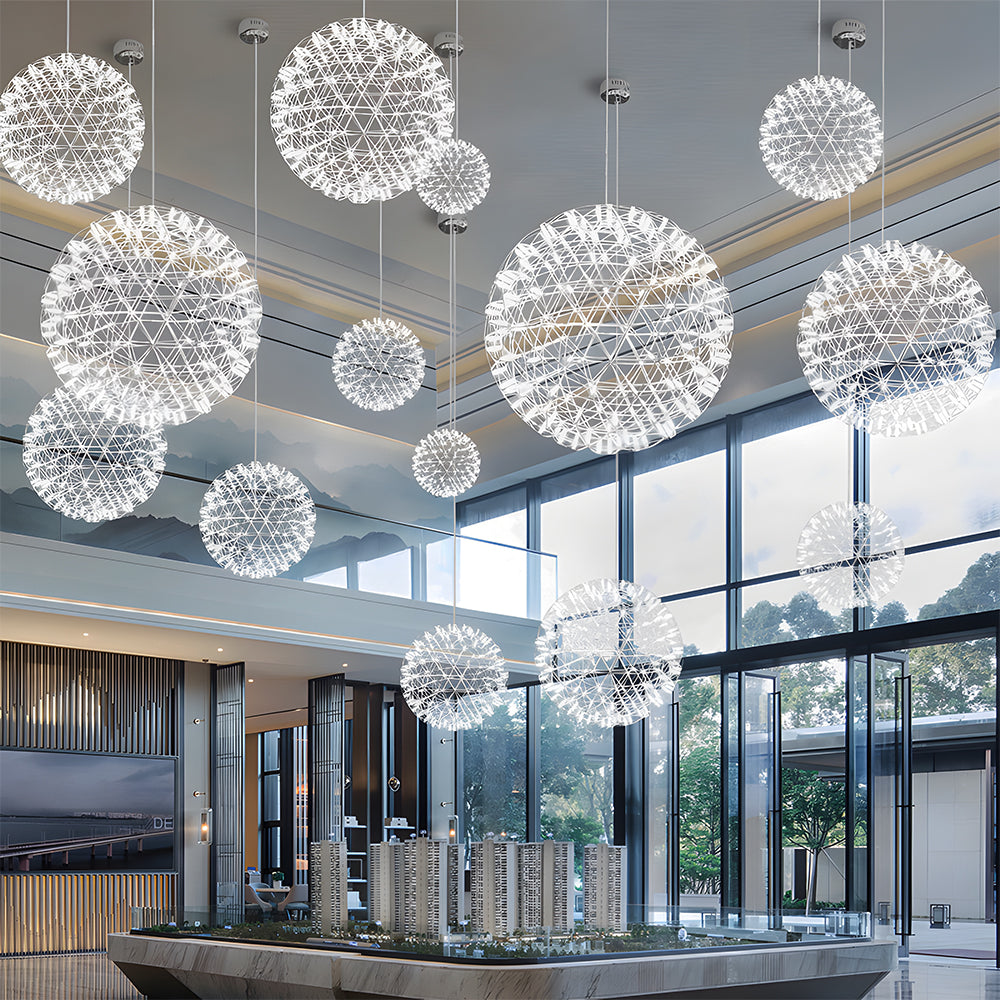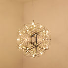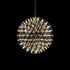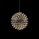 This pendant light forms a sphere through geometric elements, dotted with delicate LED points on its surface. Its refined design evenly radiates light in all directions, as if bathing one in the shimmering glow of a starry night sky.