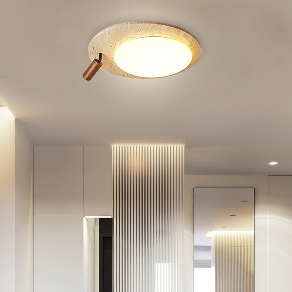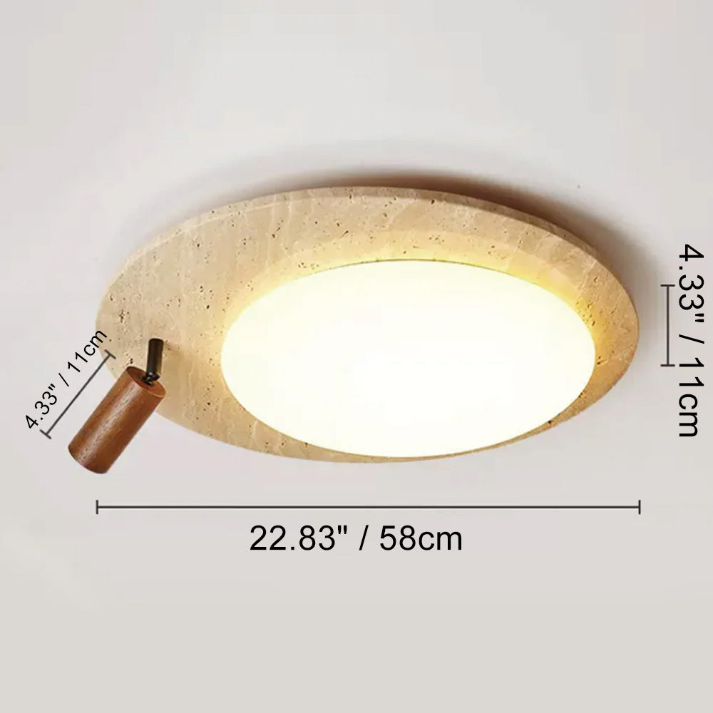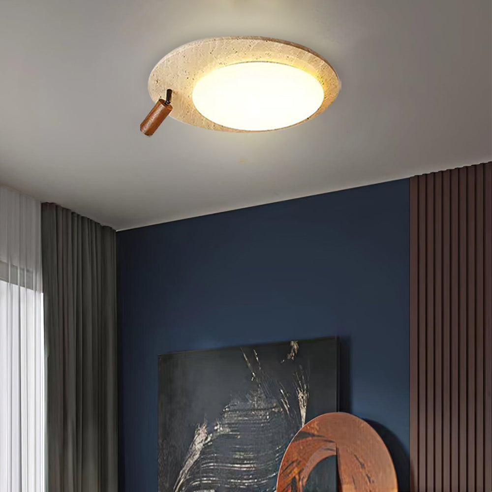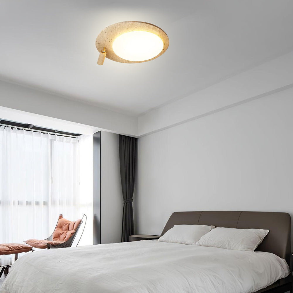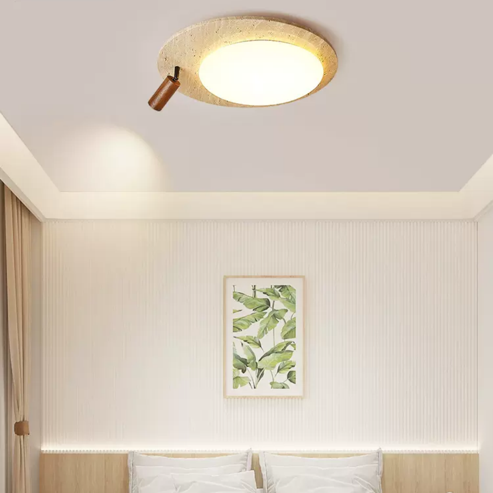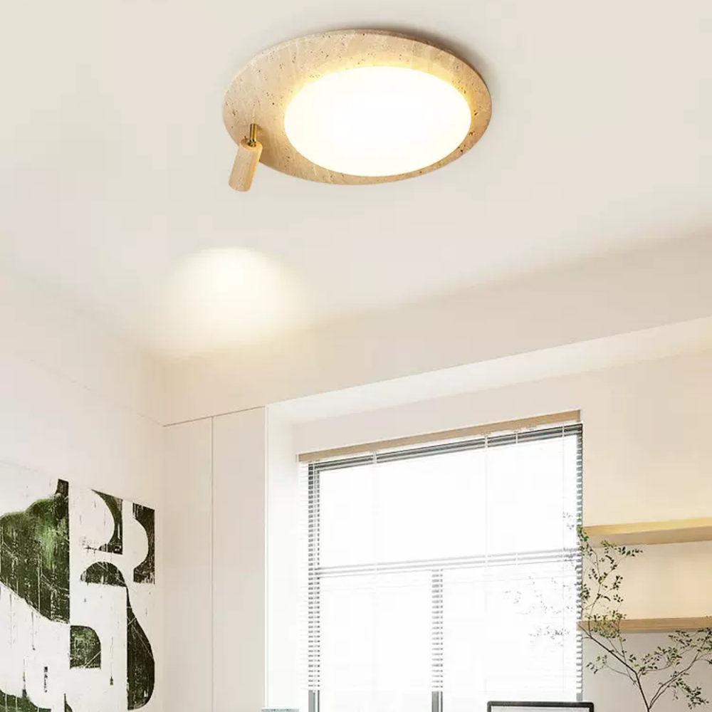 This ceiling lamp blends natural elements and minimalist design for a serene indoor ambiance. Crafted from off-white travertine and solid wood, it offers a warm texture and soft lighting effect. With its modern, simple style, it’s ideal for bedrooms, studies, and similar spaces, delivering a cozy lighting experience.