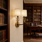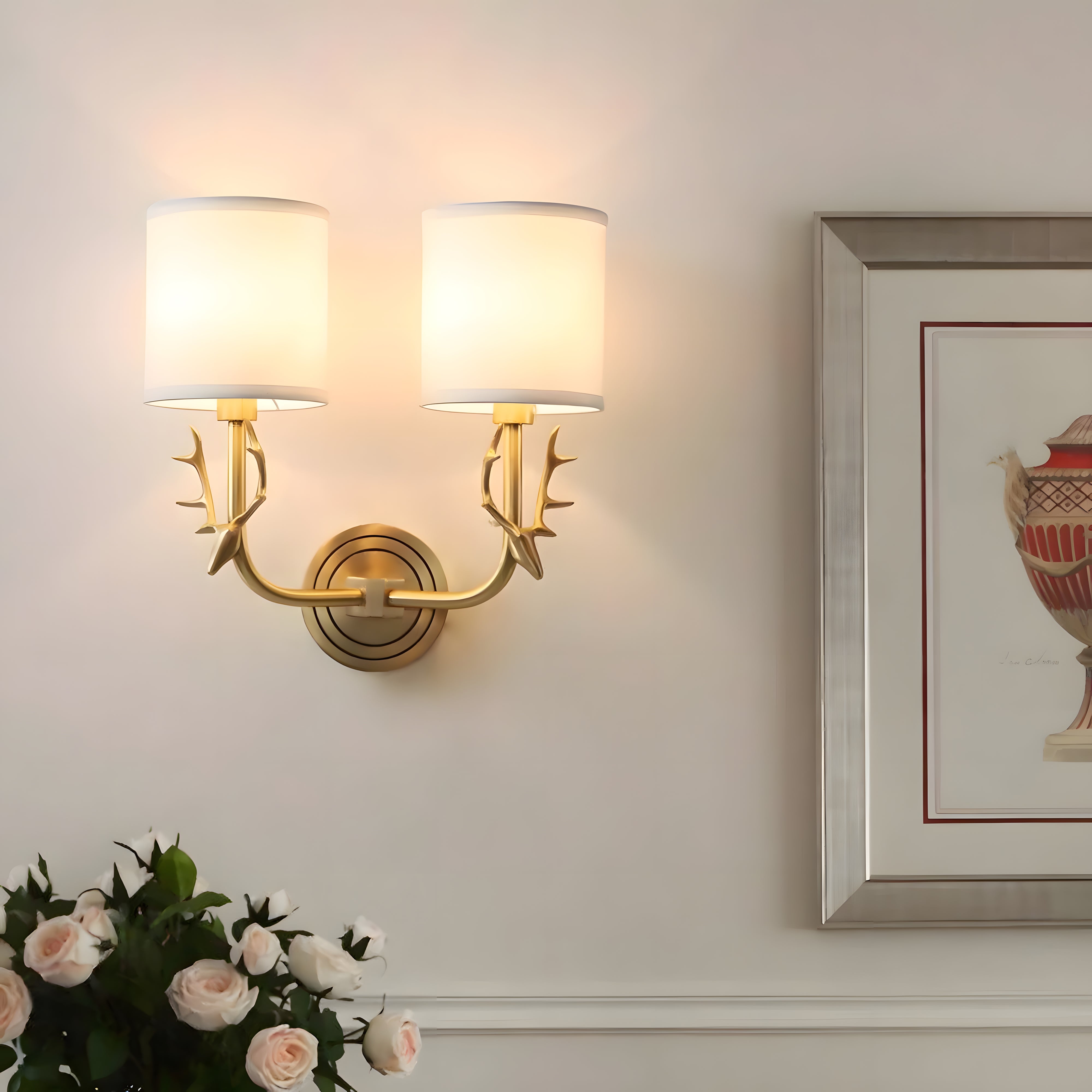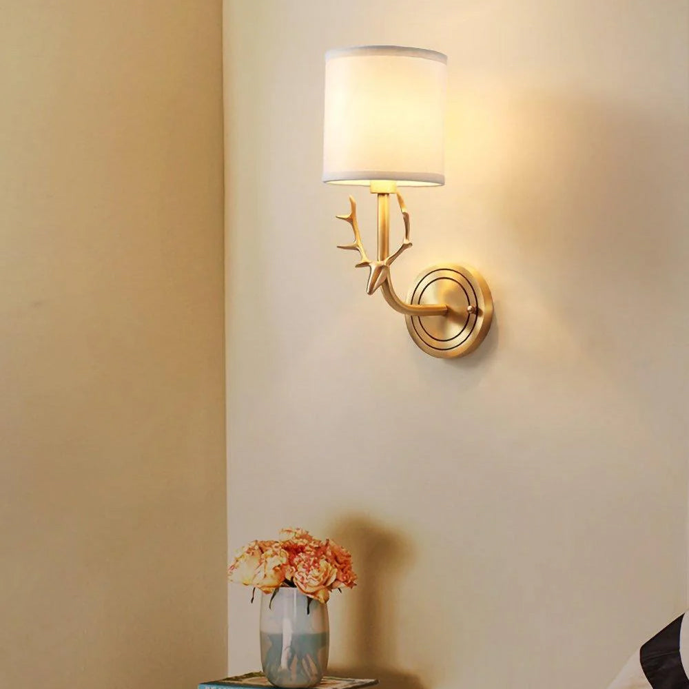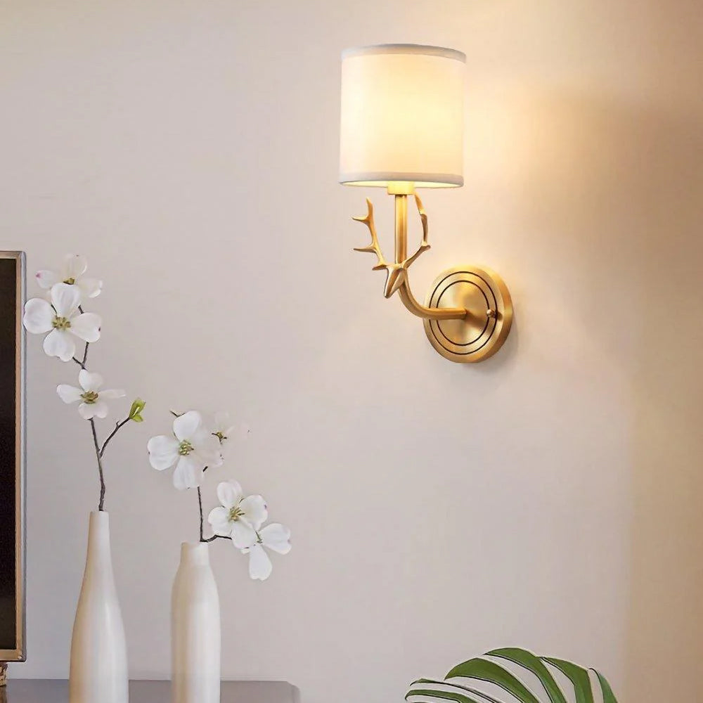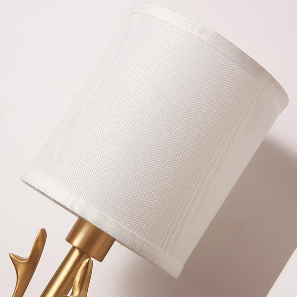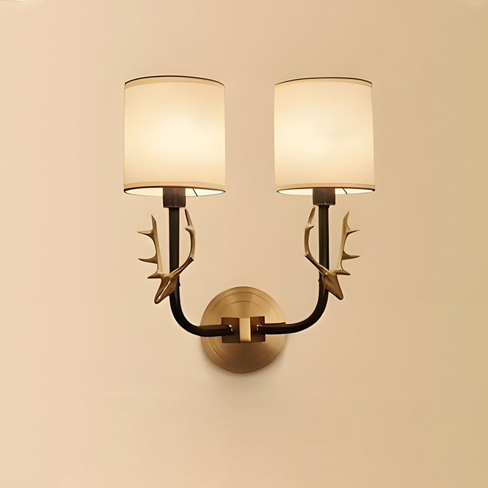 Highlights a charming deer head shape paired with ductile artificial silk lampshades. This double-head fixture has two light sources, each linked to a circular back panel—clean brass lines blend traditional warmth with modern style seamlessly.
