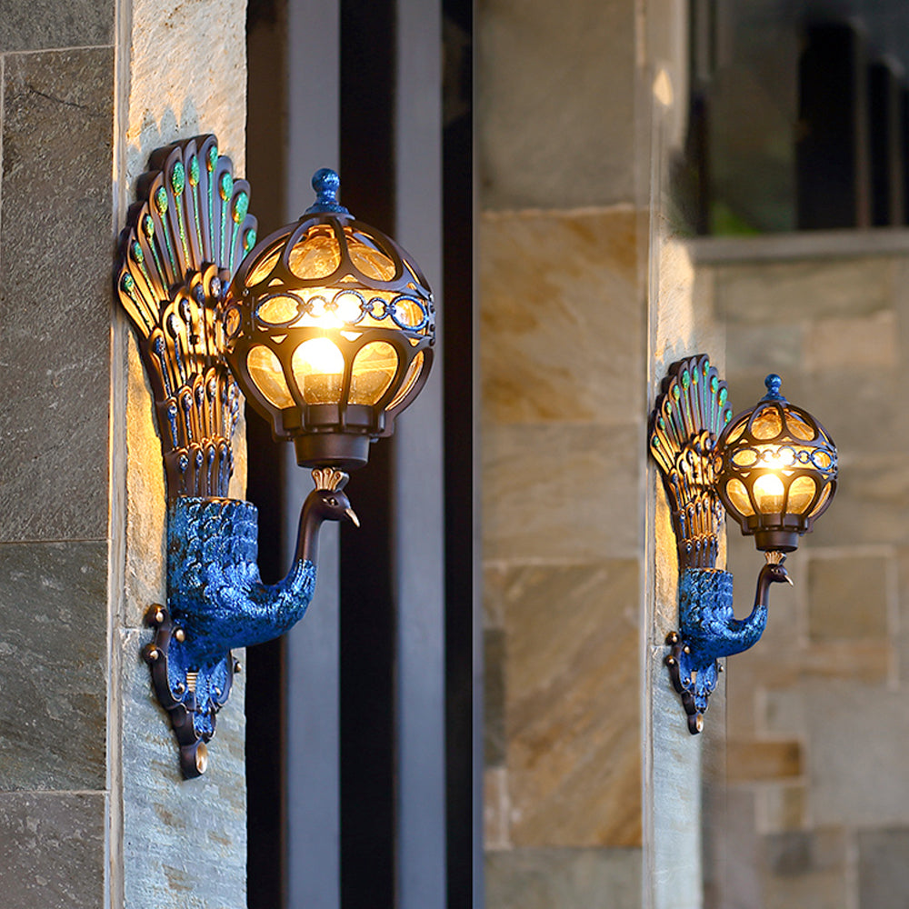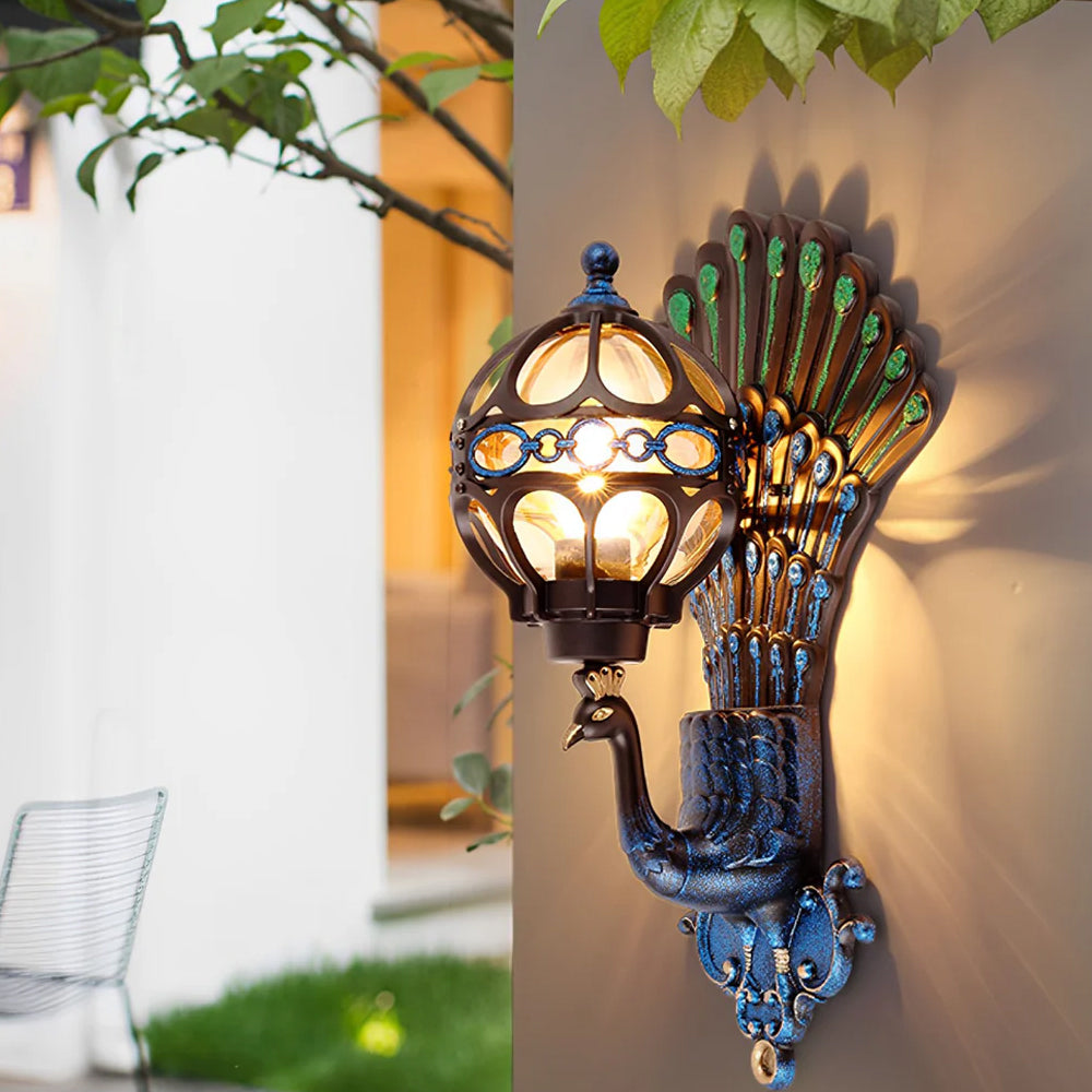 Vintage peacock outdoor wall light, crafted from die-cast aluminum and glass. Features hand-painted, fade-resistant feathers and three color finishes for durable, elegant ambiance.