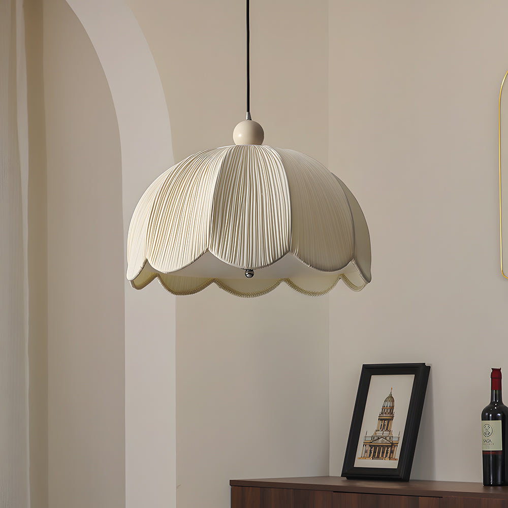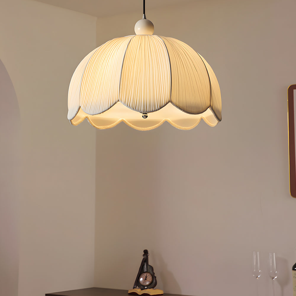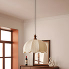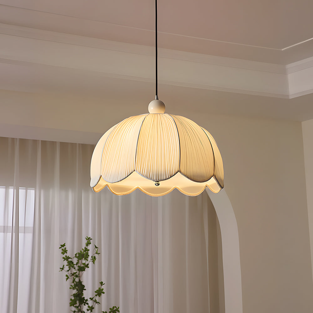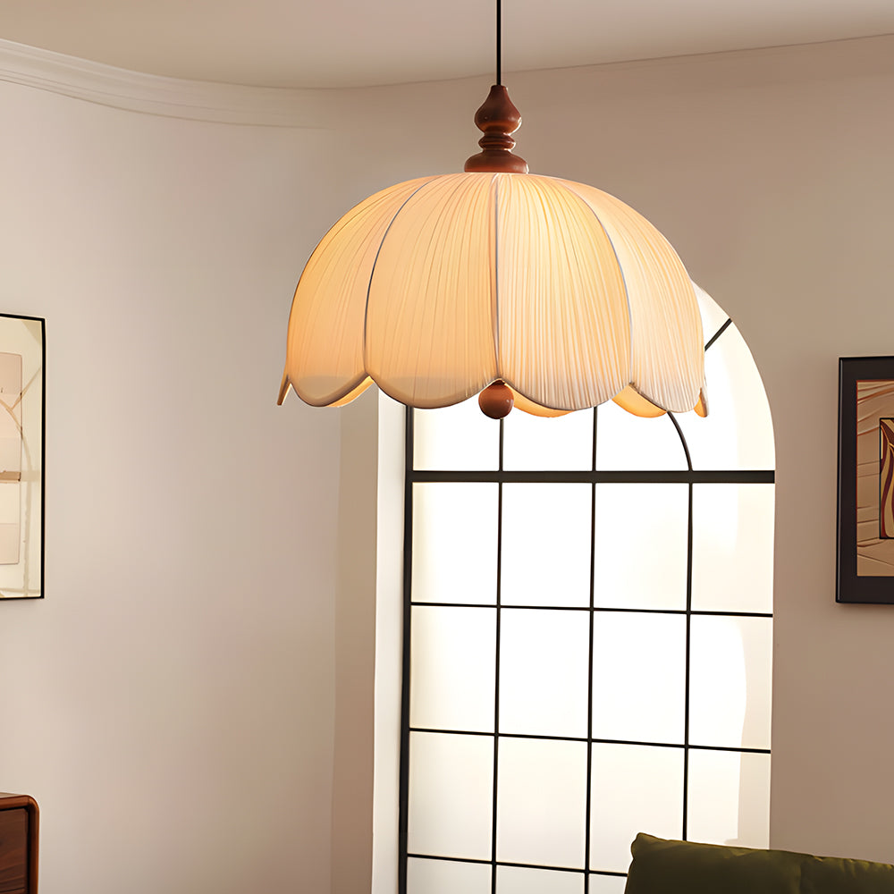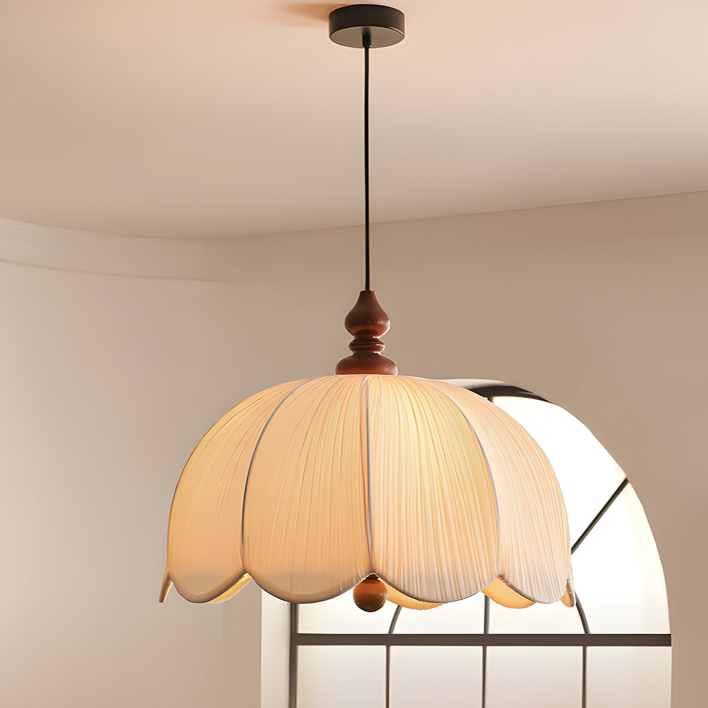 This pendant light draws inspiration from mid-century design aesthetics. The light softly diffuses through the fabric, creating a hazy and warm glow. It is suitable for retro cafes, guesthouses, bedrooms, and mid-century style spaces.
