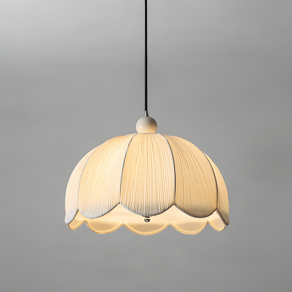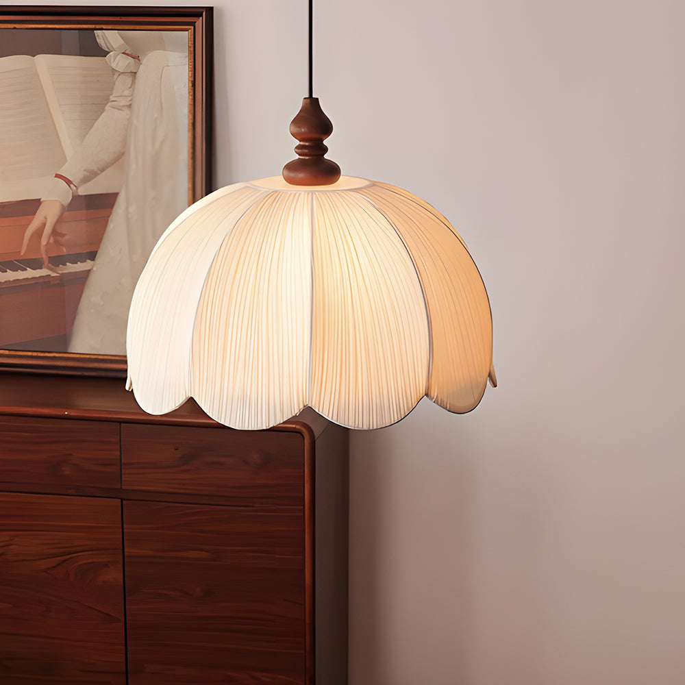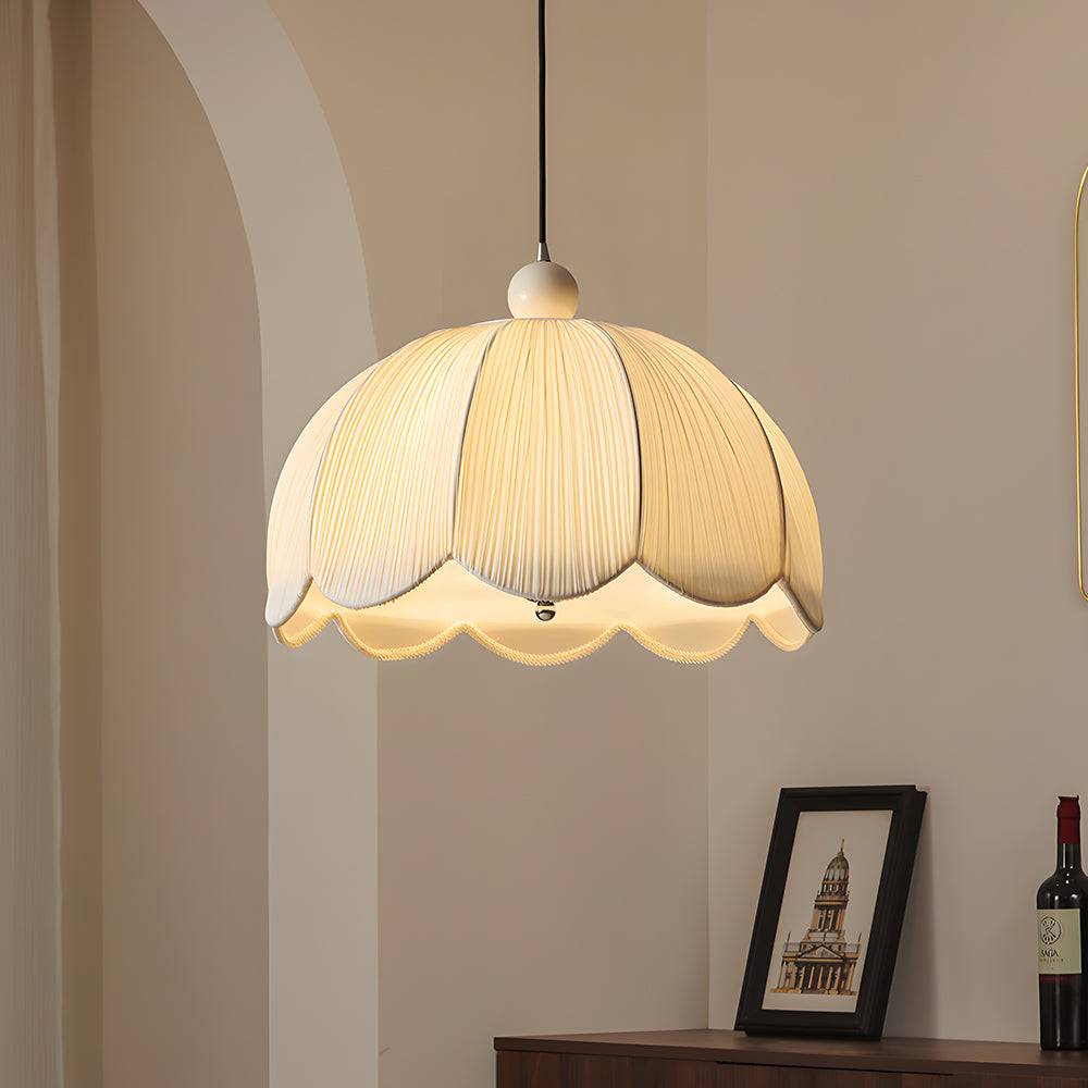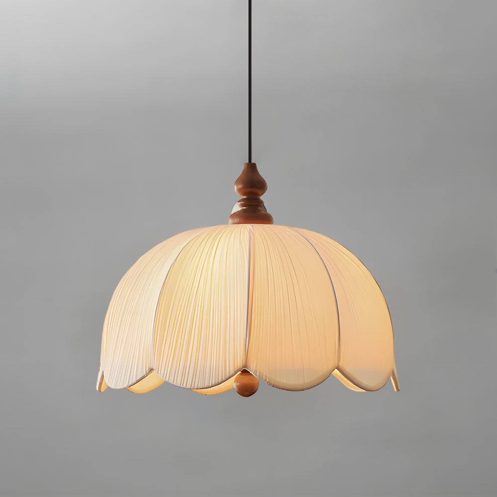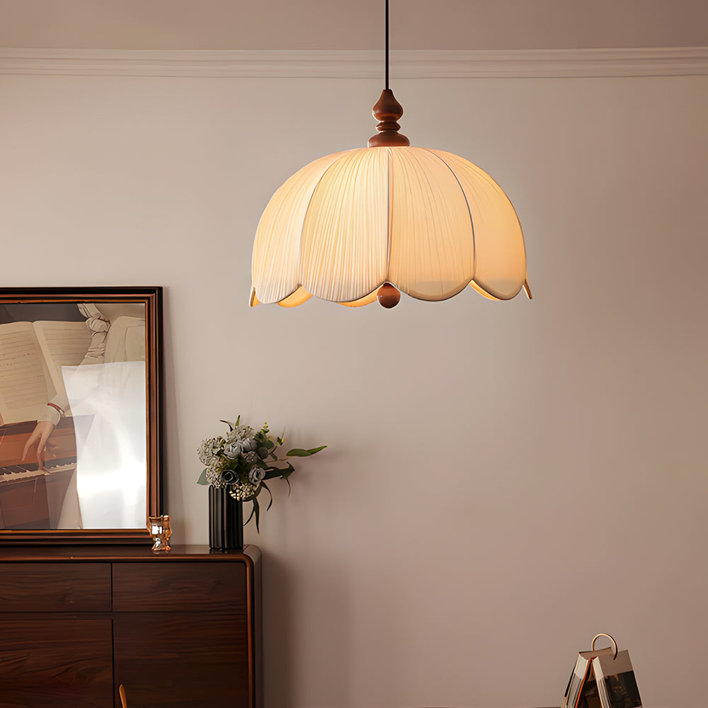 This pendant light draws inspiration from mid-century design aesthetics. The light softly diffuses through the fabric, creating a hazy and warm glow. It is suitable for retro cafes, guesthouses, bedrooms, and mid-century style spaces.