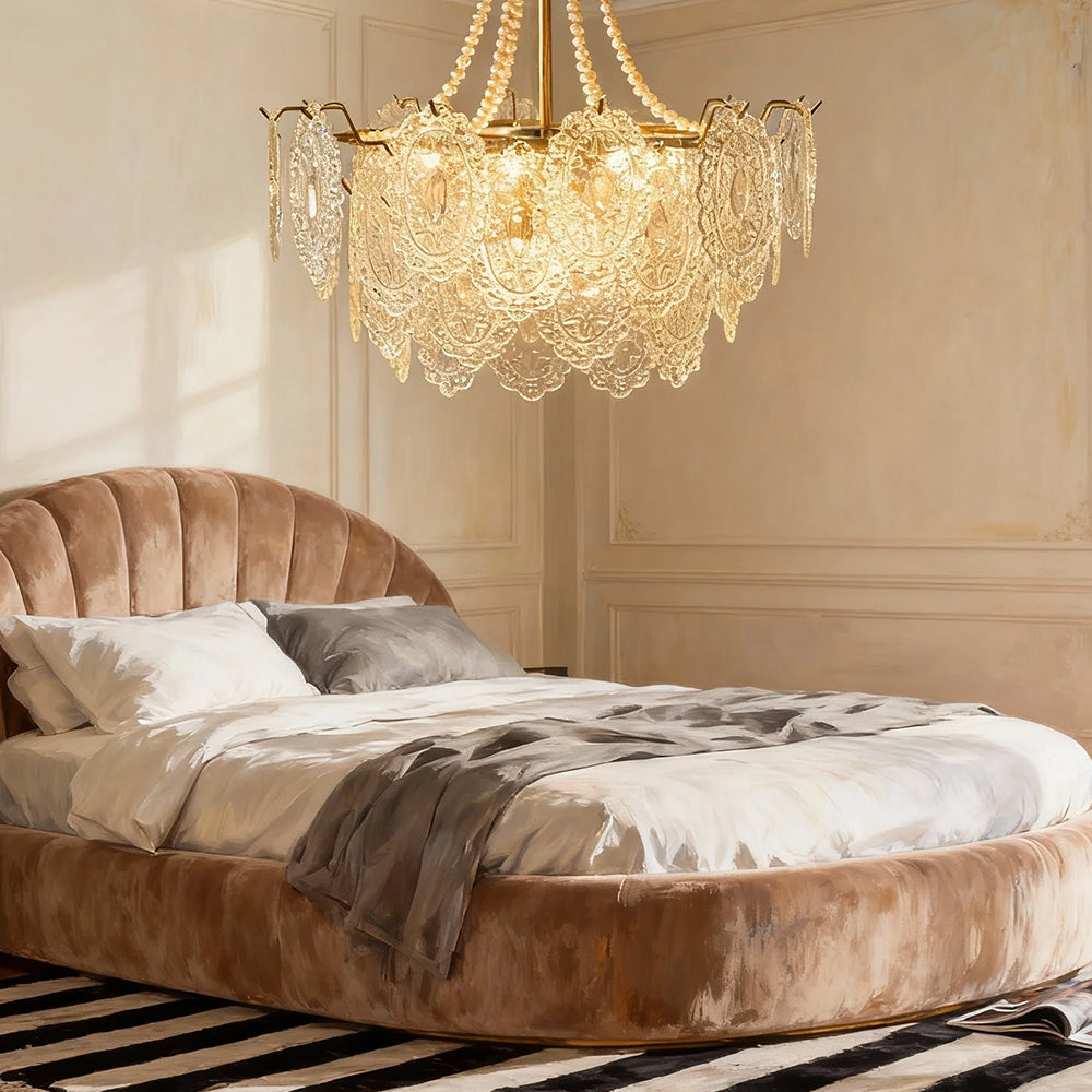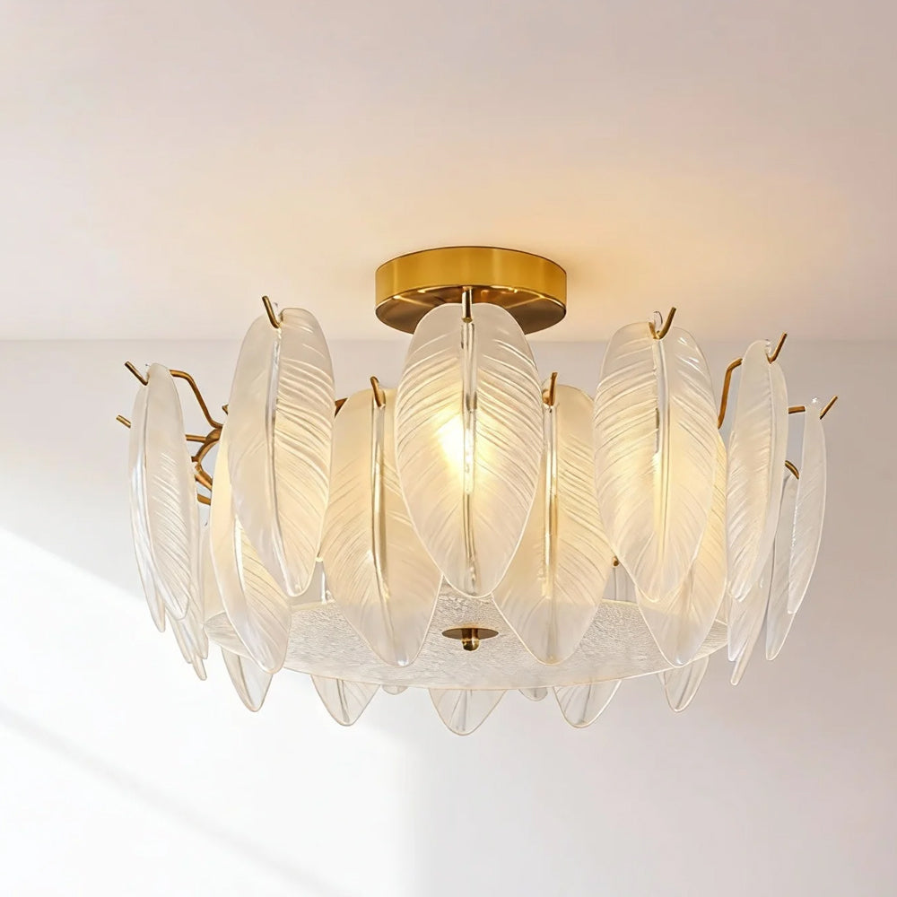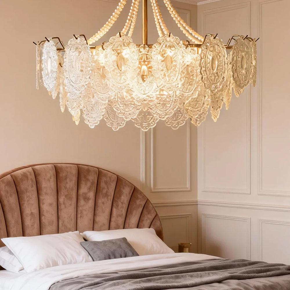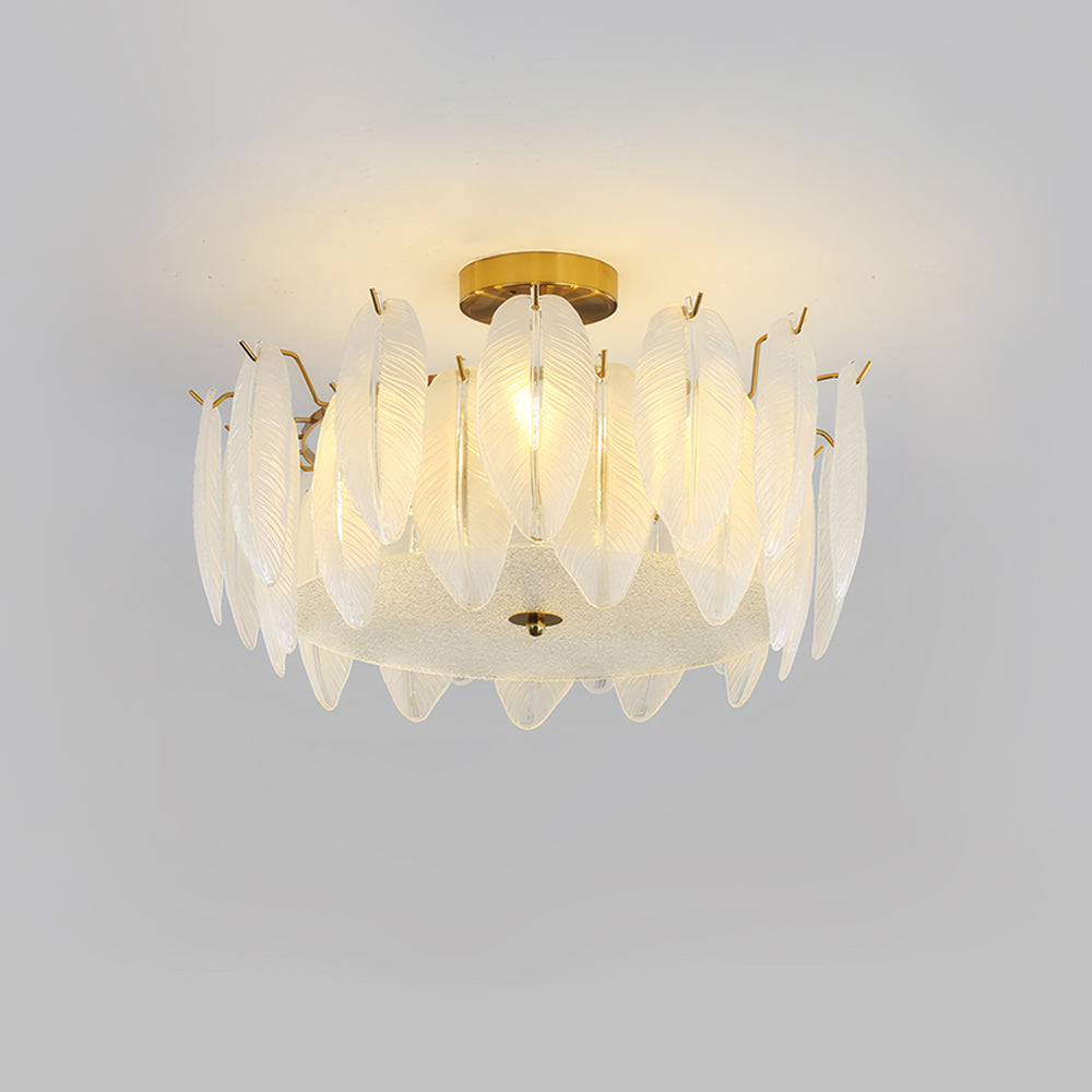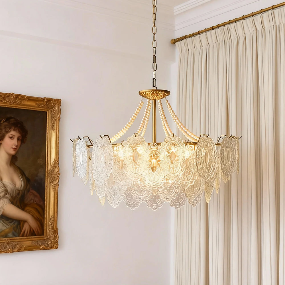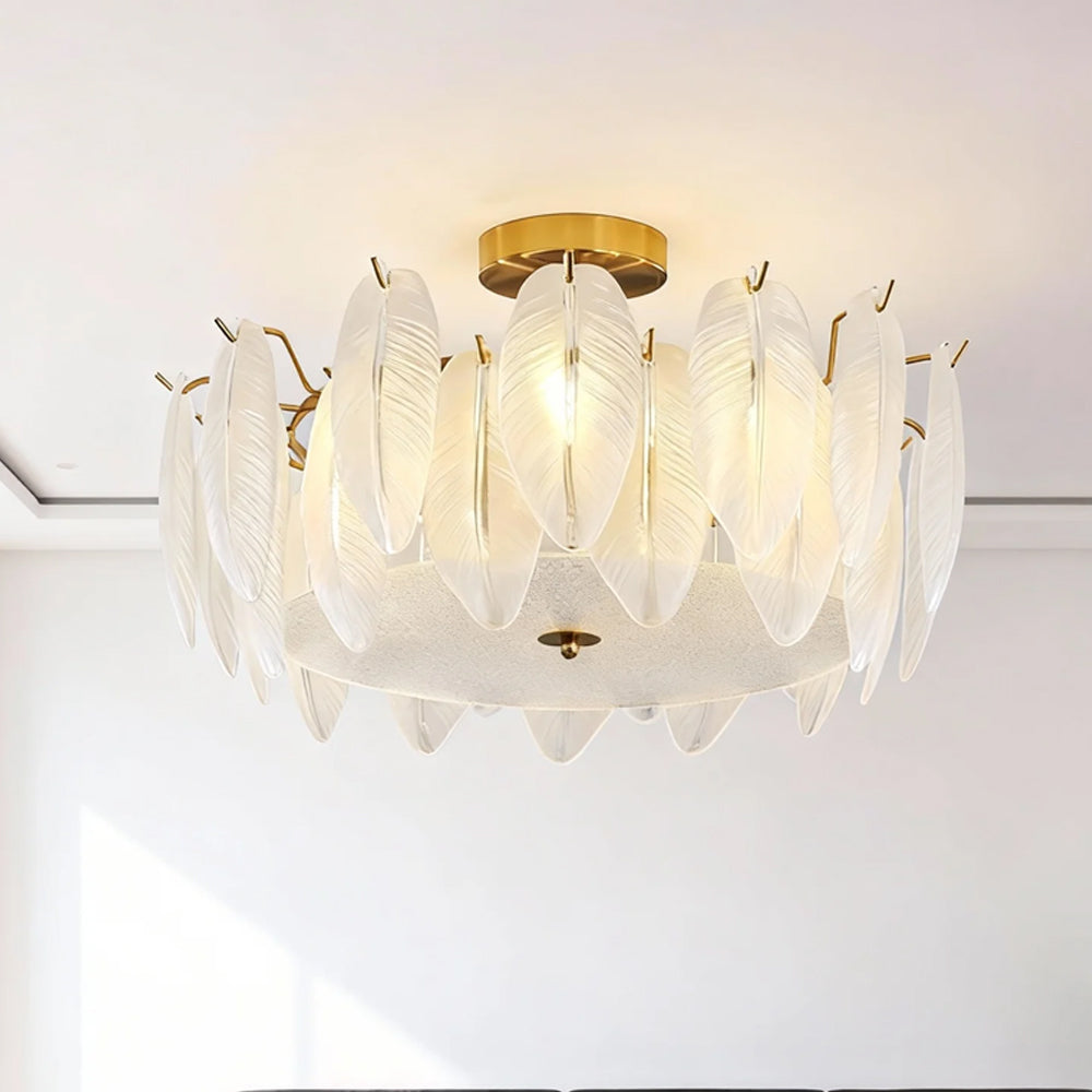 Light refracts through layered feather-textured glass, creating a soft, hazy glow. Suitable for banquet halls, vintage-style rooms, and lofty spaces like retro living rooms, it captures the romance and ethereal elegance of French court aesthetics.