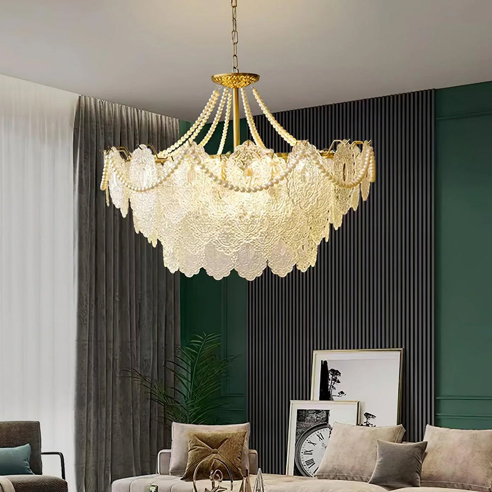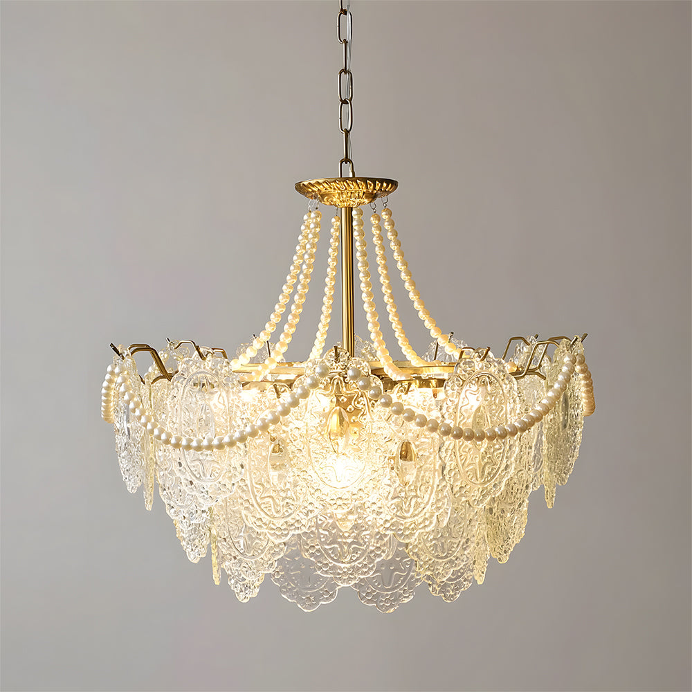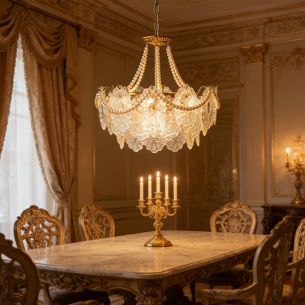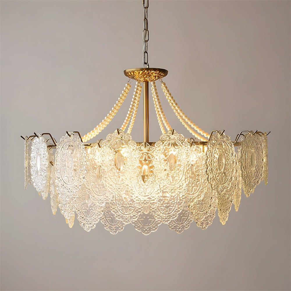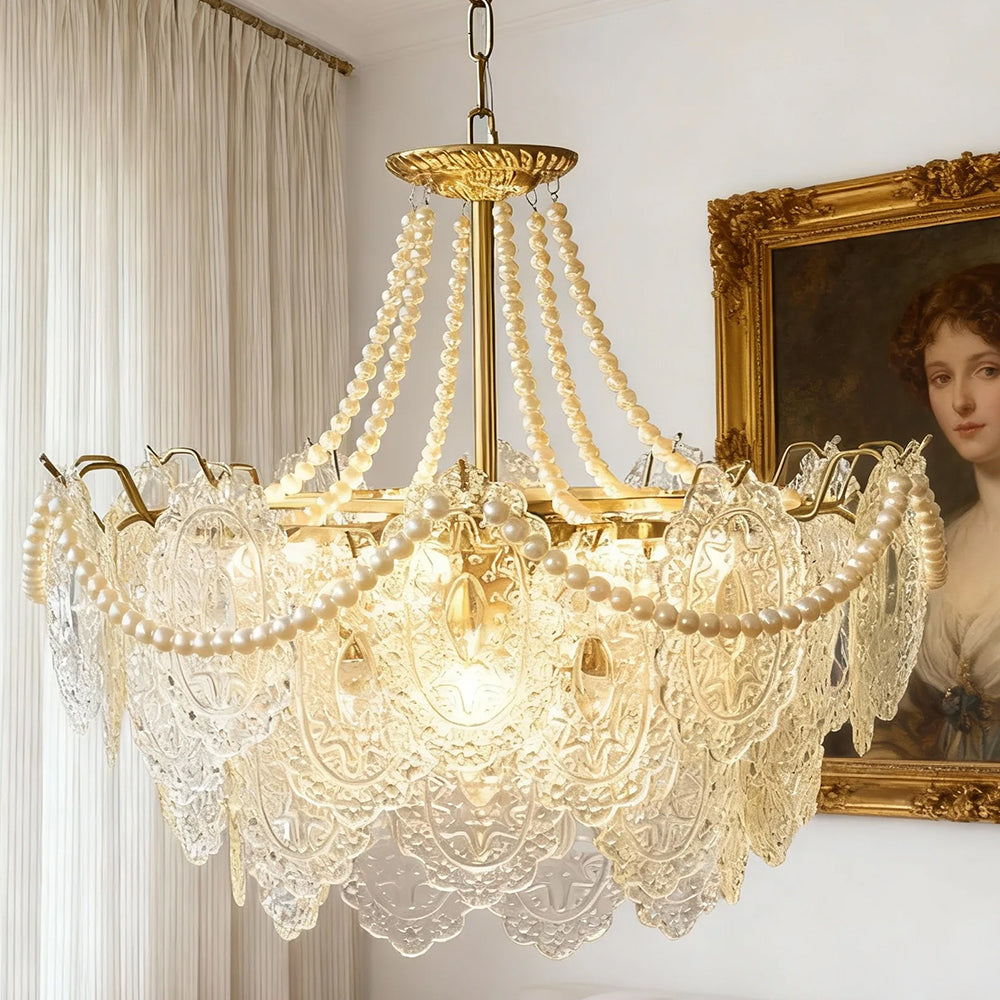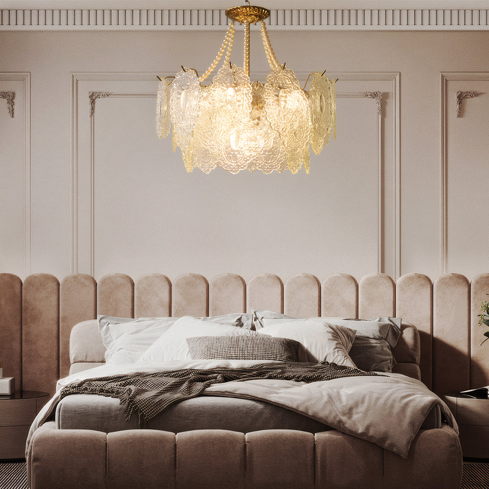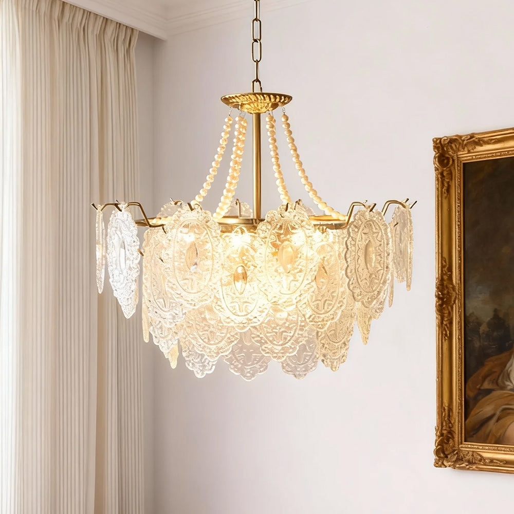Light refracts through layered feather-textured glass, creating a soft, hazy glow. Suitable for banquet halls, vintage-style rooms, and lofty spaces like retro living rooms, it captures the romance and ethereal elegance of French court aesthetics.
