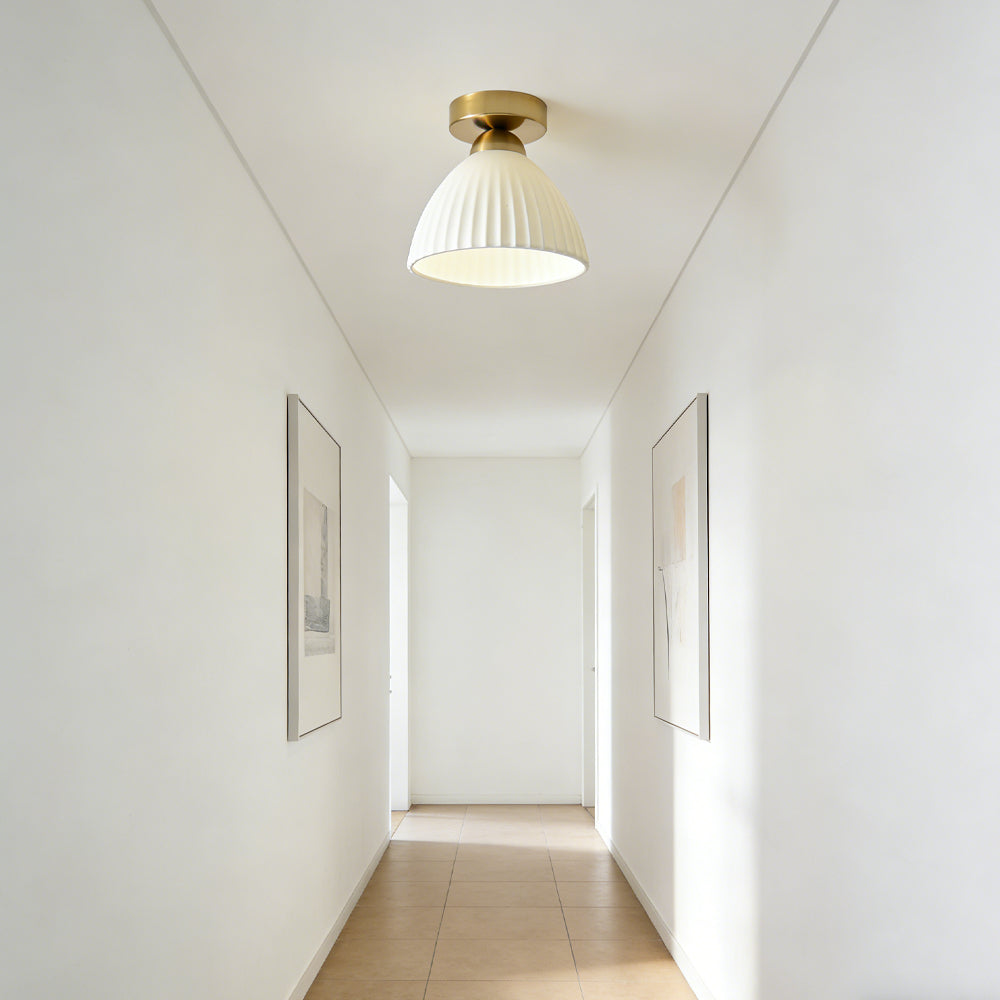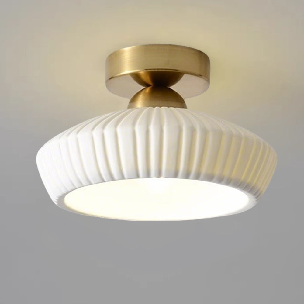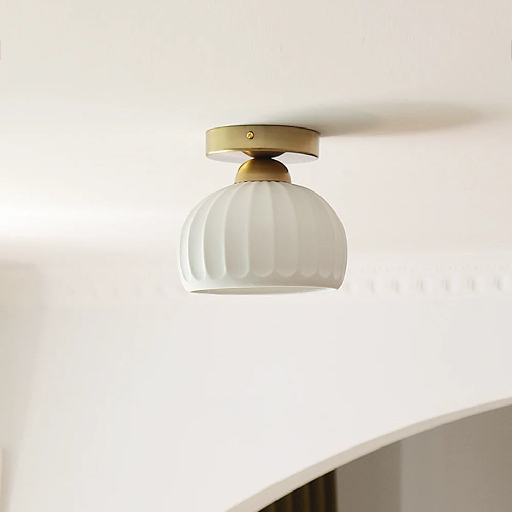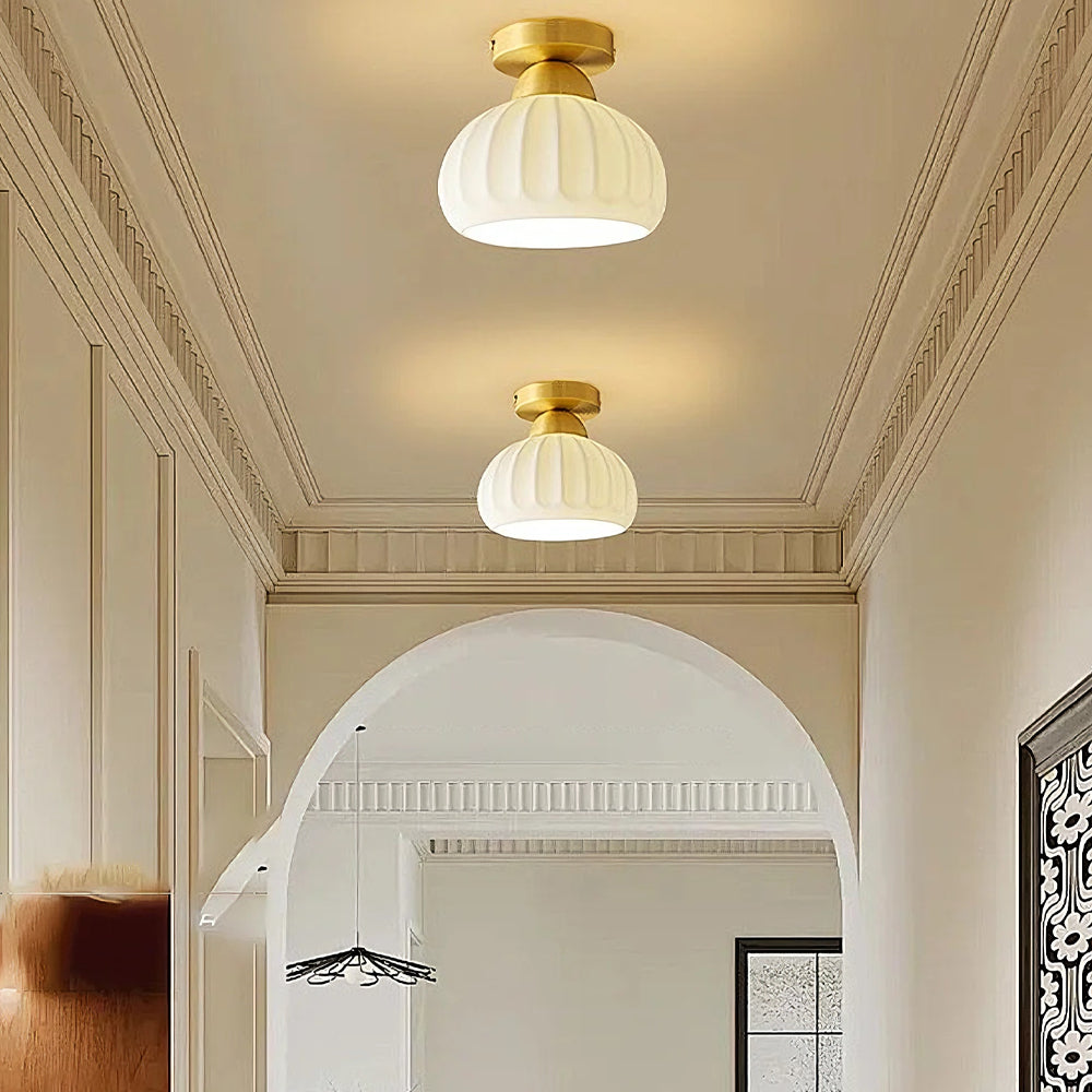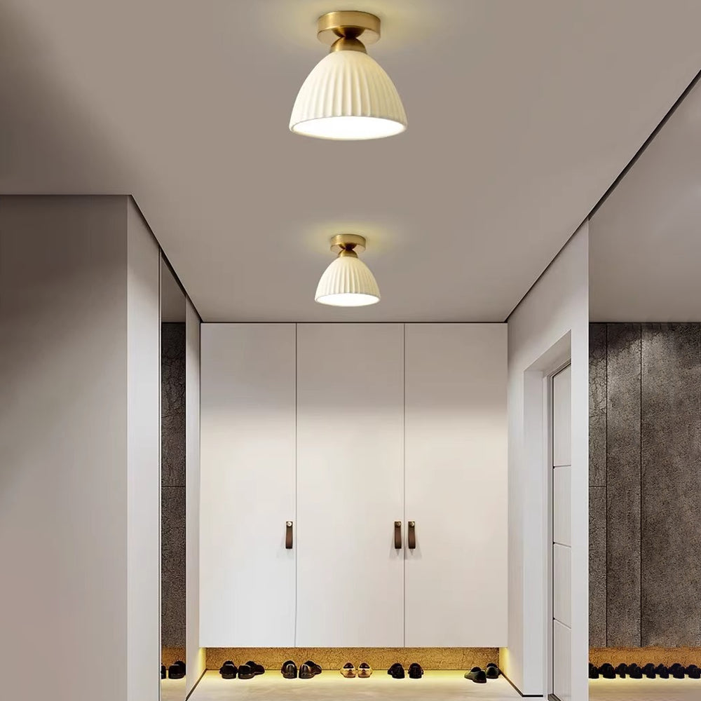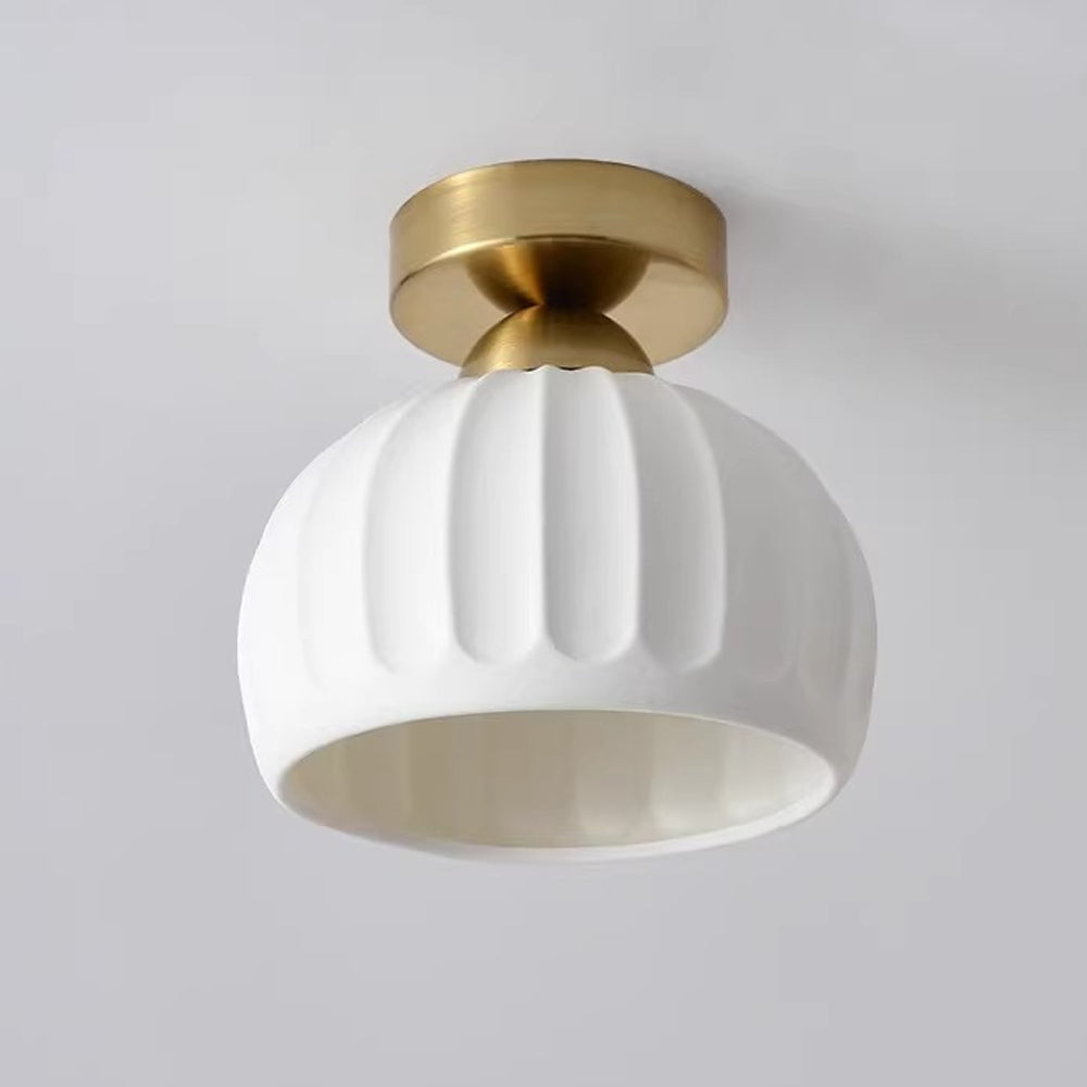 This retro-style ceiling light pairs a brass base with a handcrafted ceramic lampshade, creating a refined vintage look. Its soft ambient glow adds warmth and character to hallways, bedrooms, and living spaces, making it an elegant accent for any interior.
