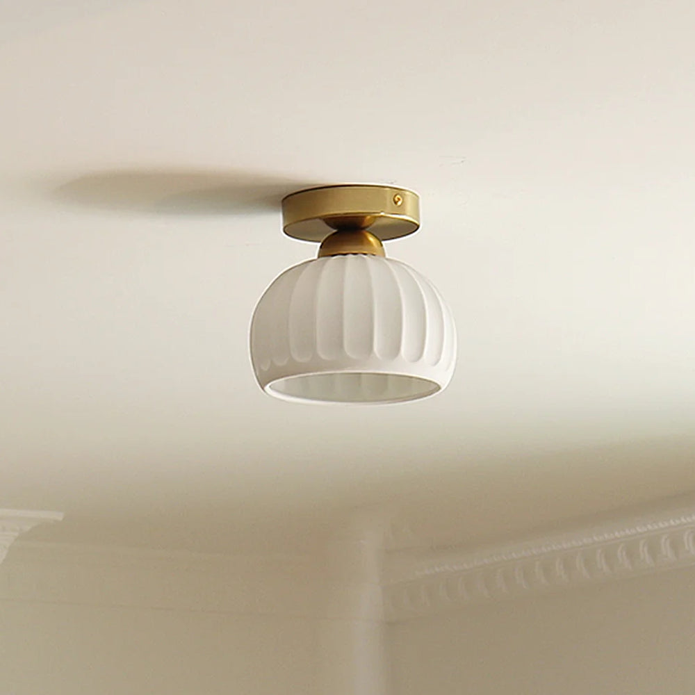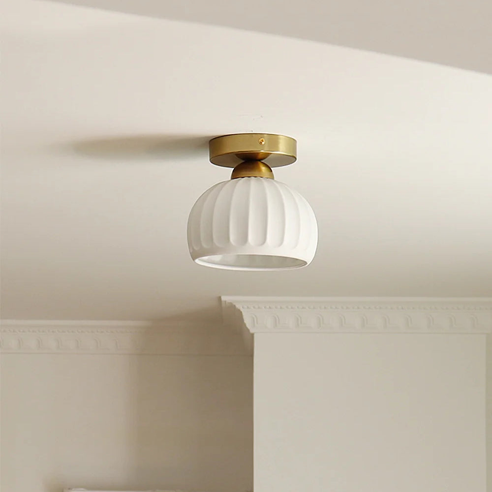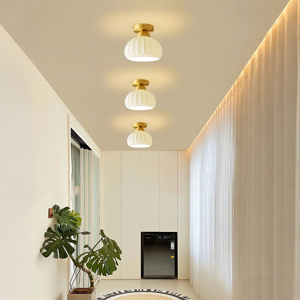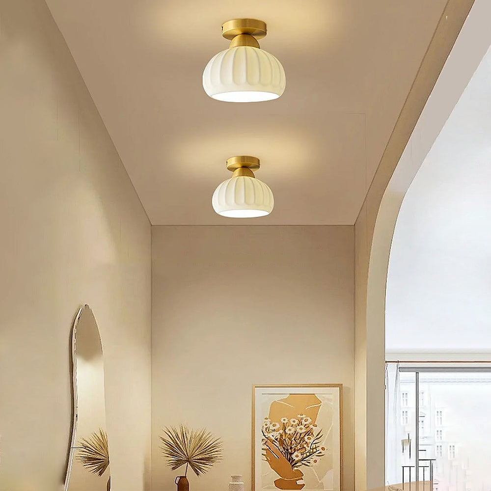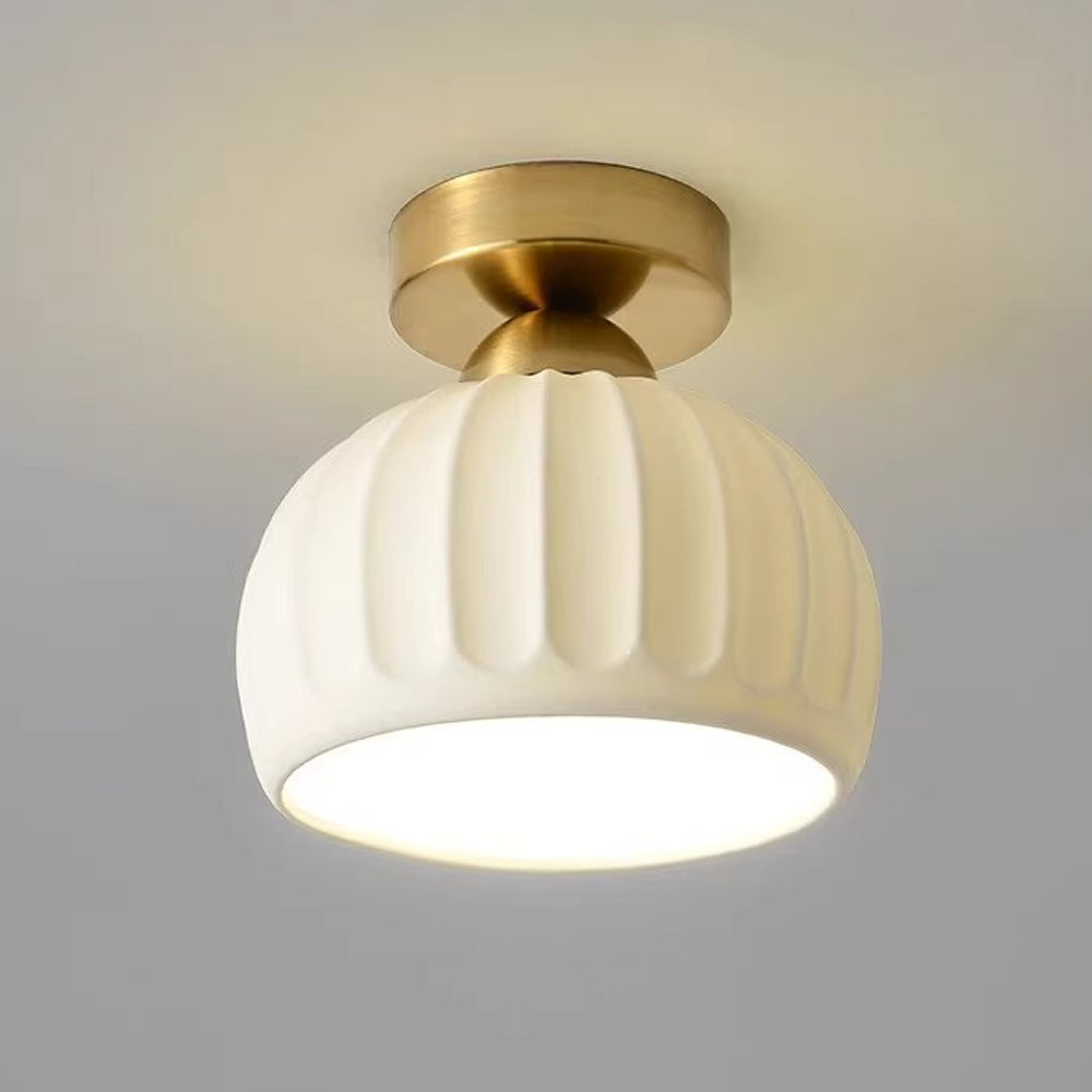 This retro-style ceiling light pairs a brass base with a handcrafted ceramic lampshade, creating a refined vintage look. Its soft ambient glow adds warmth and character to hallways, bedrooms, and living spaces, making it an elegant accent for any interior.