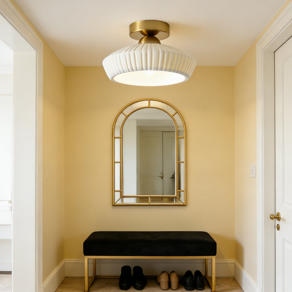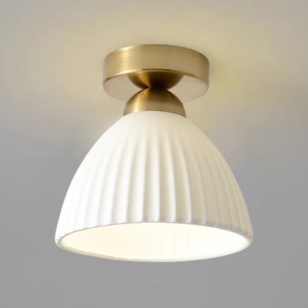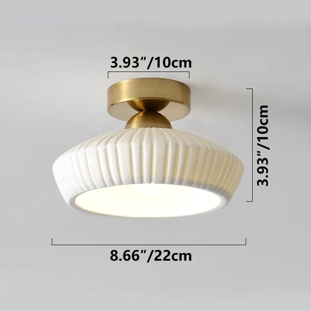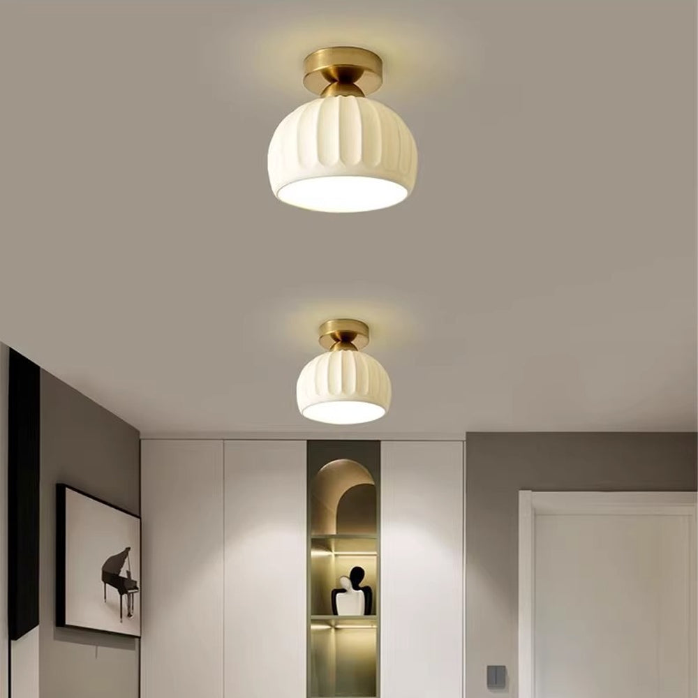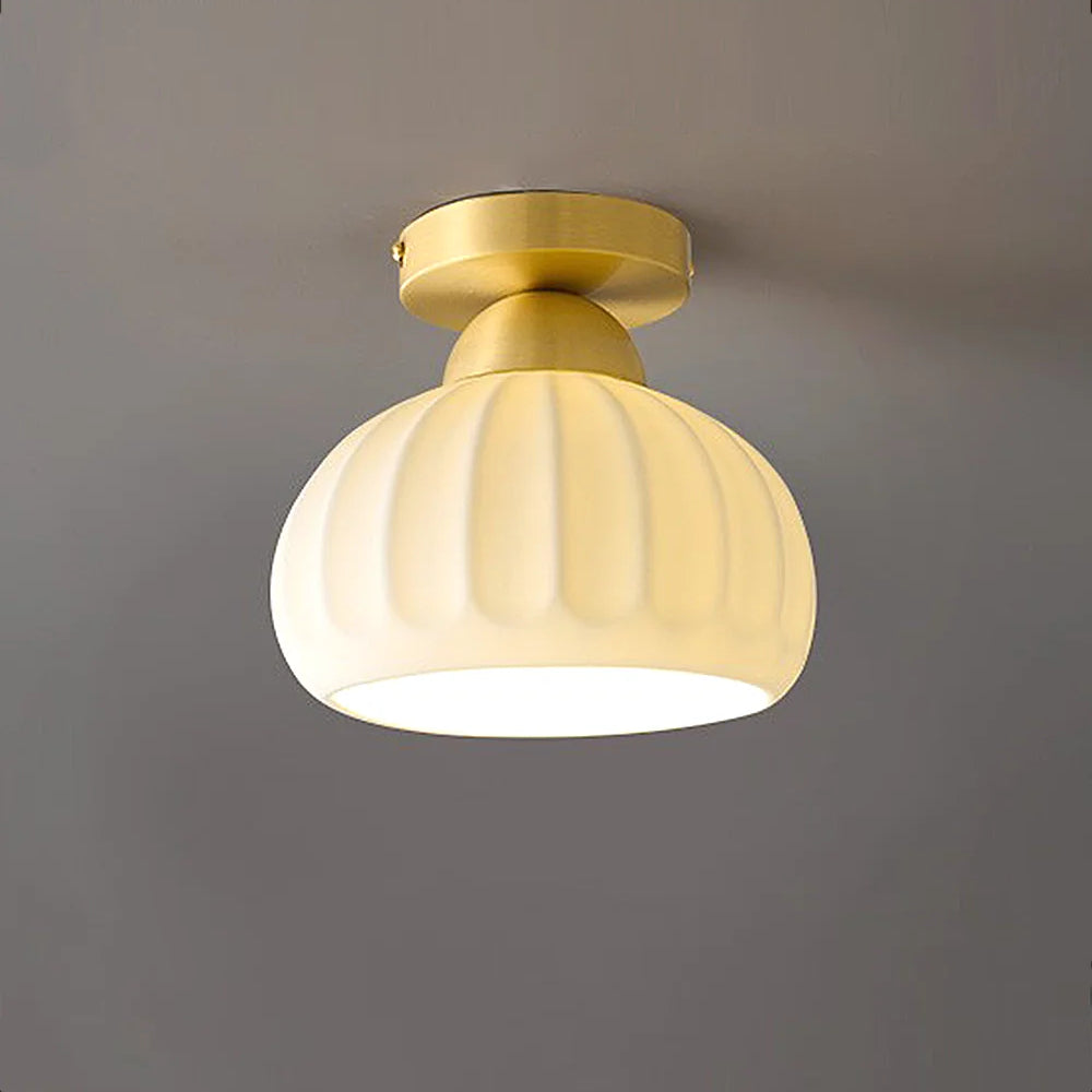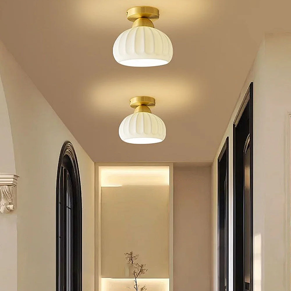 This retro-style ceiling light pairs a brass base with a handcrafted ceramic lampshade, creating a refined vintage look. Its soft ambient glow adds warmth and character to hallways, bedrooms, and living spaces, making it an elegant accent for any interior.