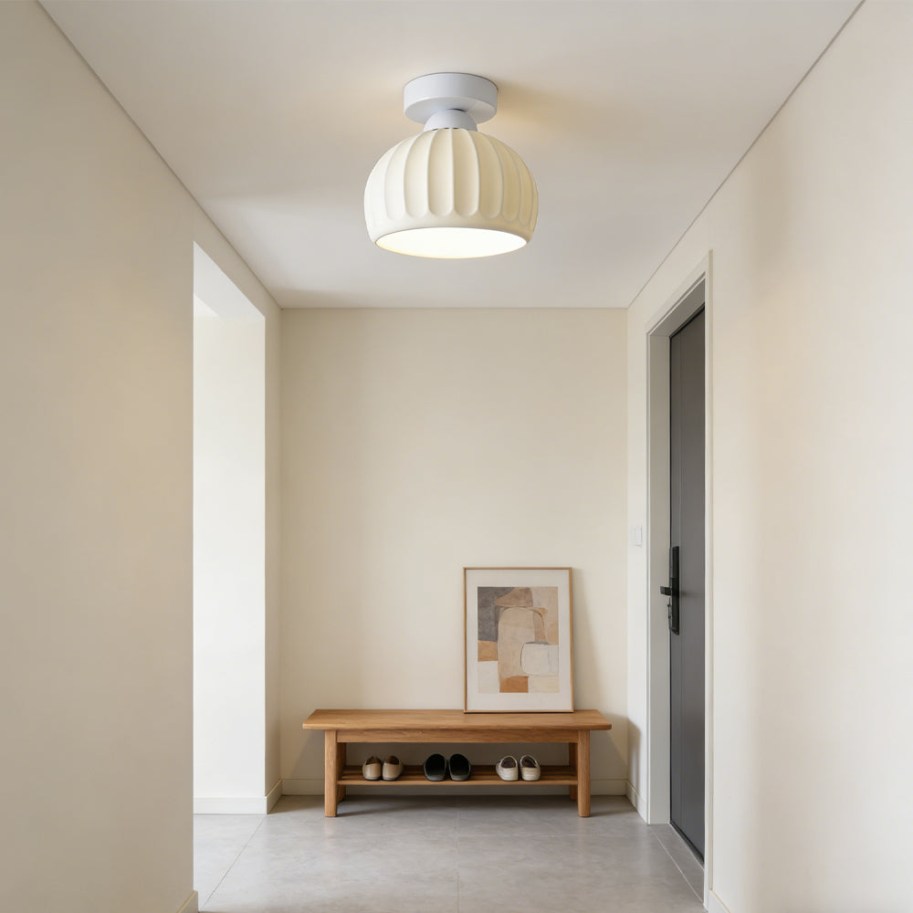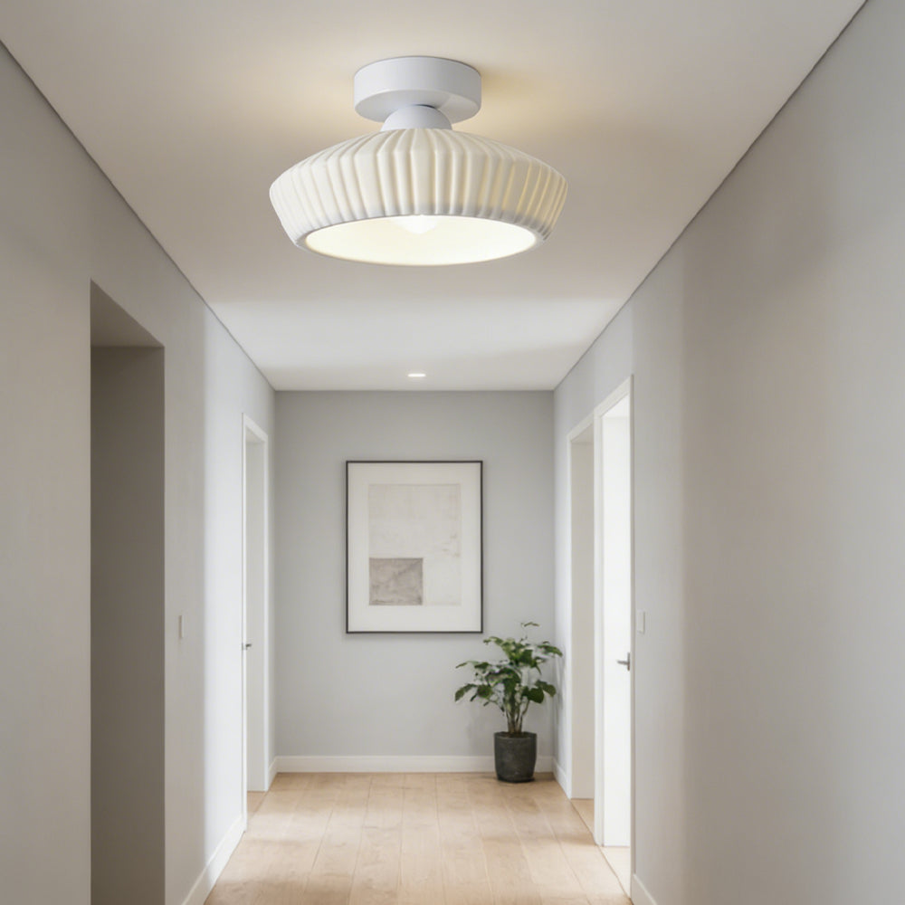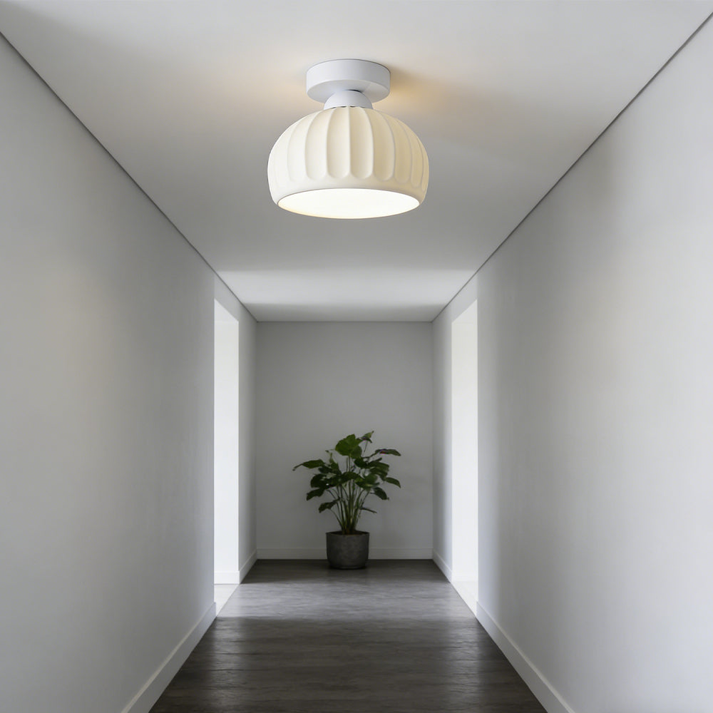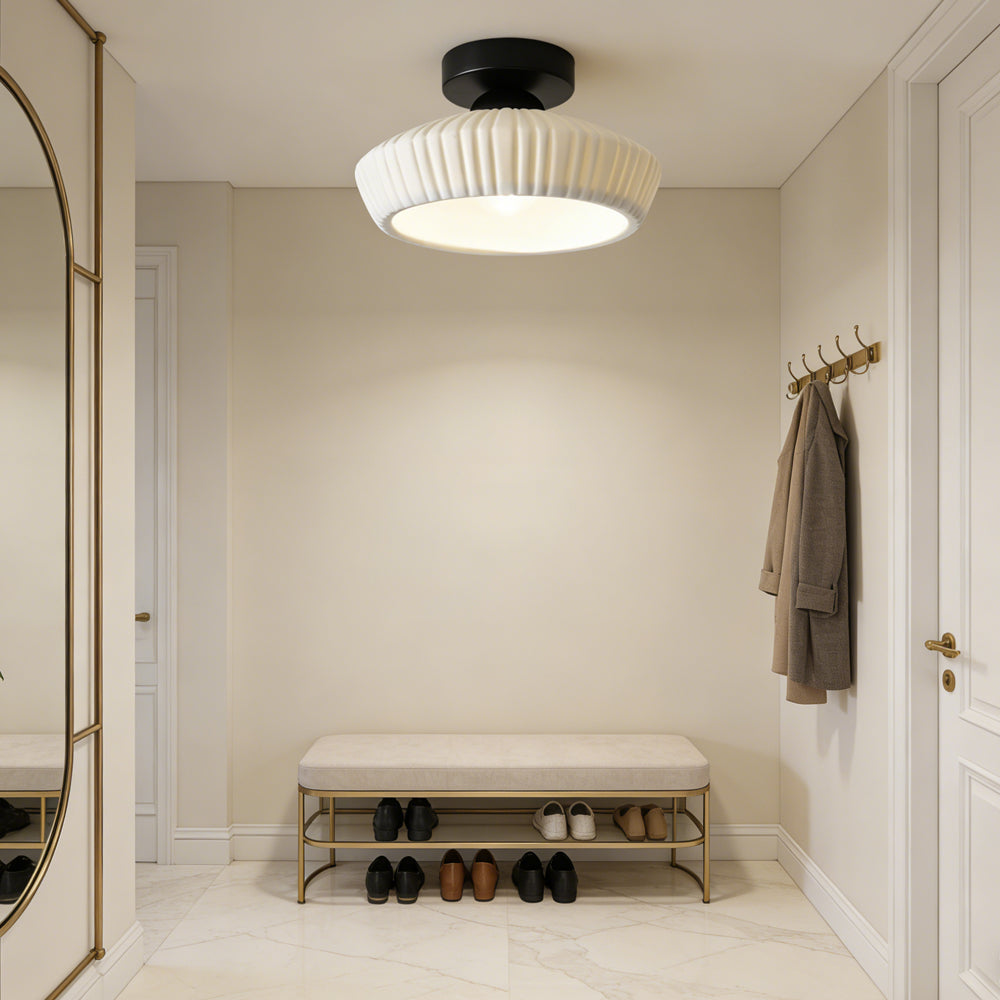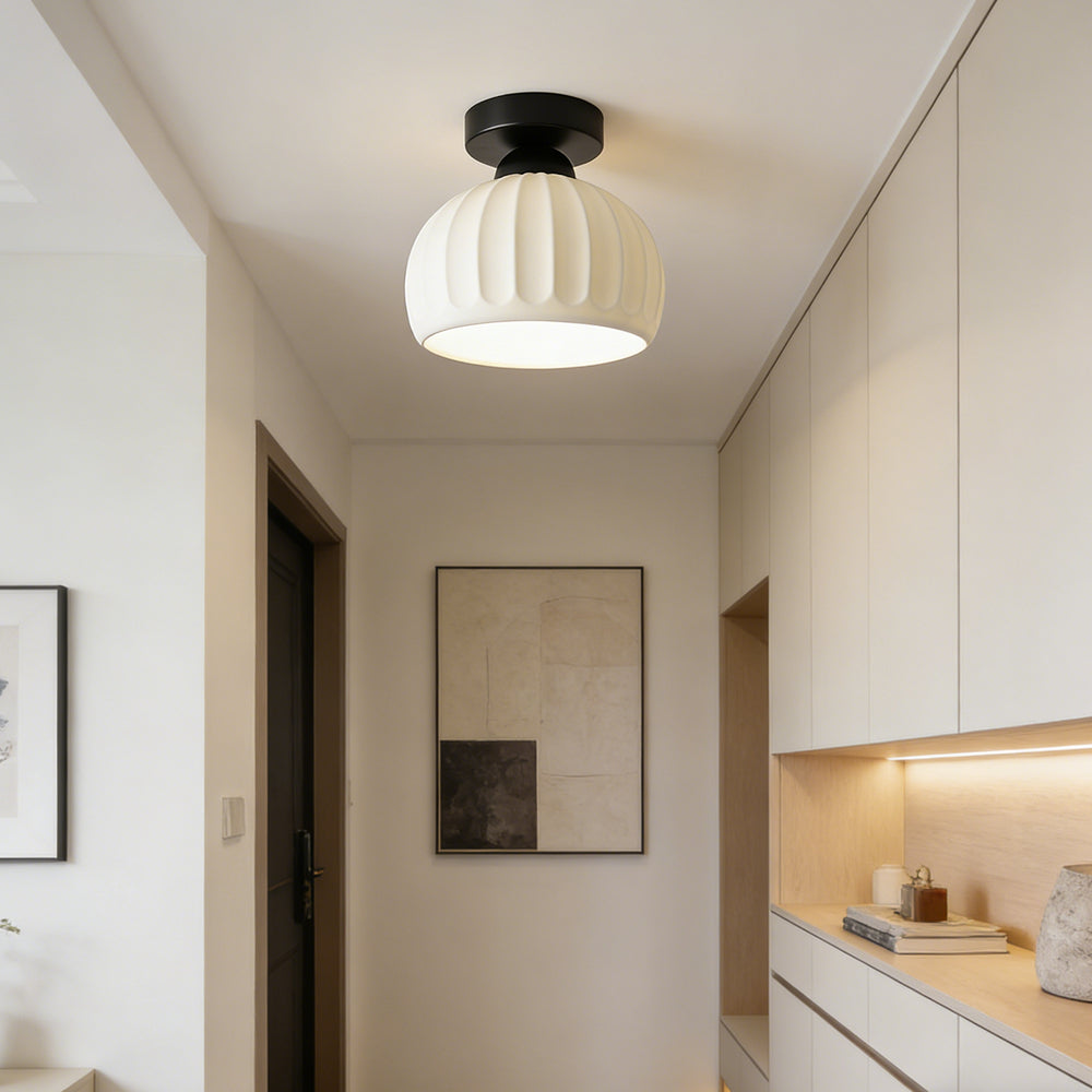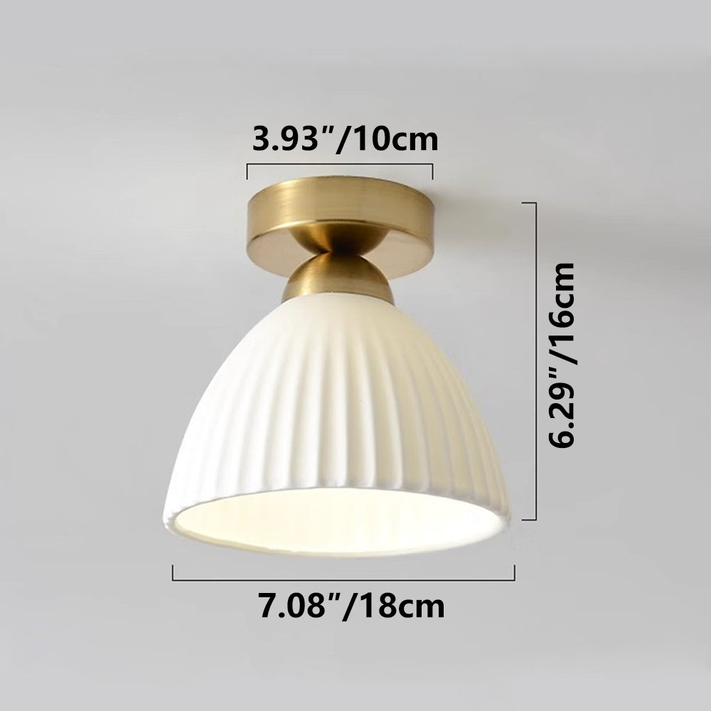 This retro-style ceiling light pairs a brass base with a handcrafted ceramic lampshade, creating a refined vintage look. Its soft ambient glow adds warmth and character to hallways, bedrooms, and living spaces, making it an elegant accent for any interior.
