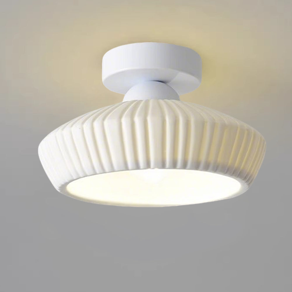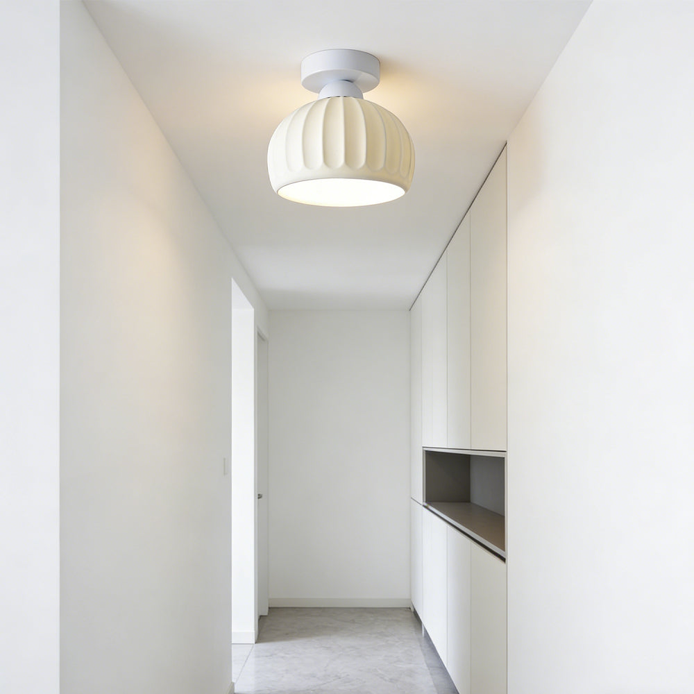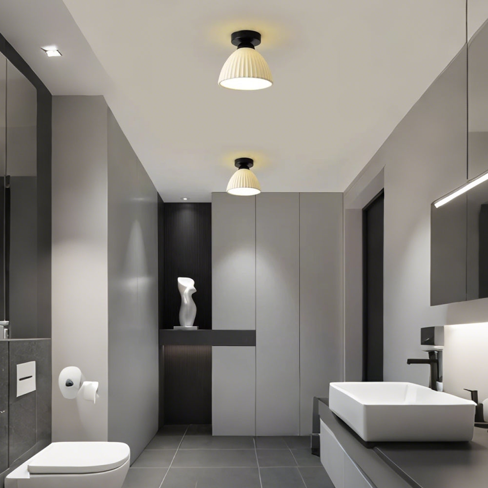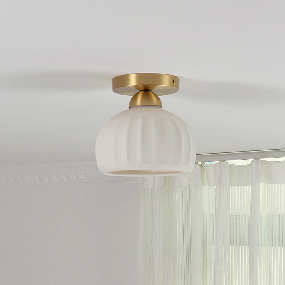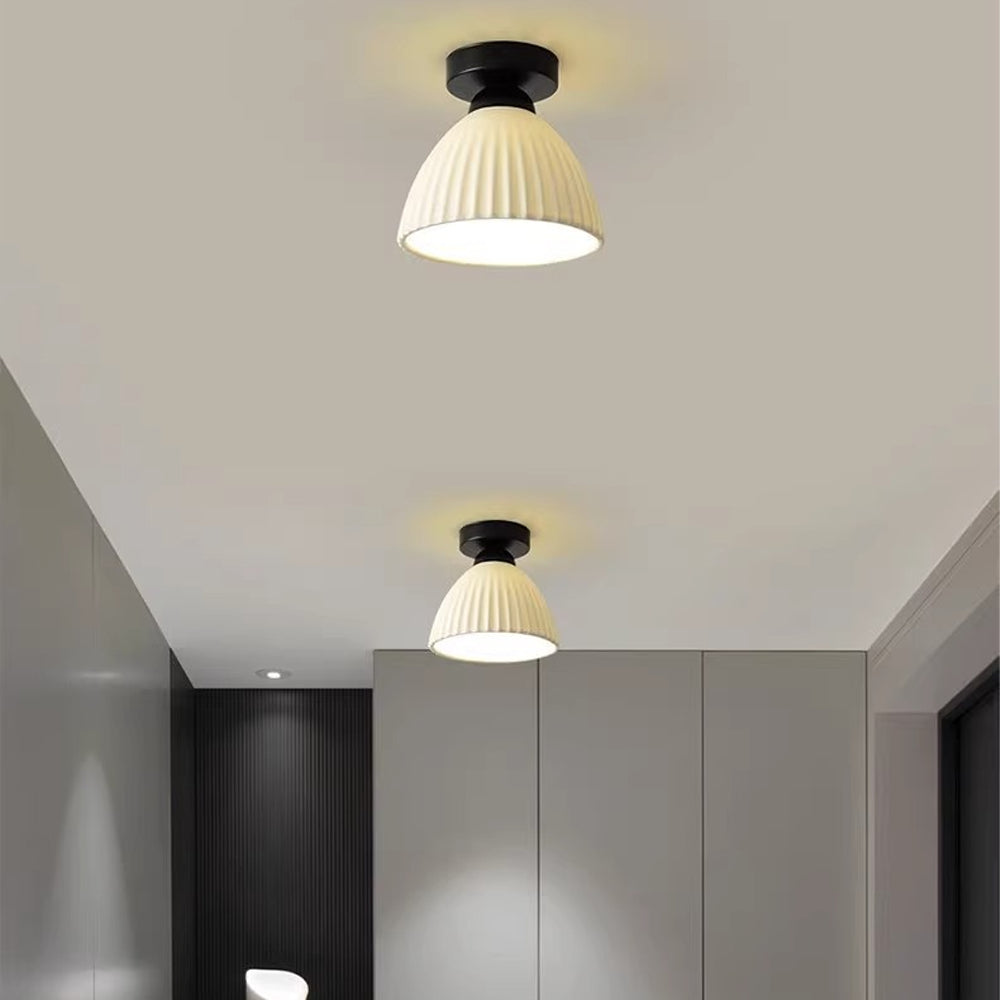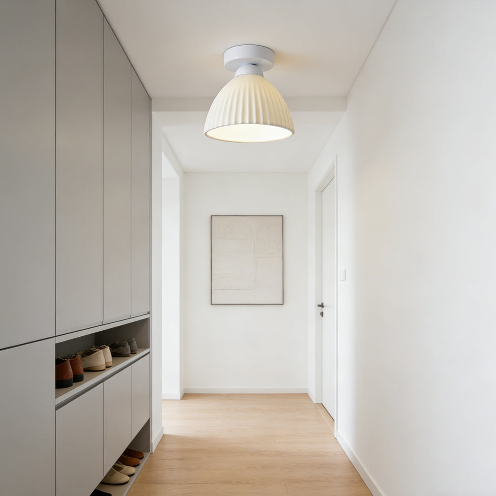 This retro-style ceiling light pairs a brass base with a handcrafted ceramic lampshade, creating a refined vintage look. Its soft ambient glow adds warmth and character to hallways, bedrooms, and living spaces, making it an elegant accent for any interior.