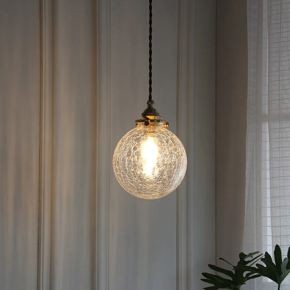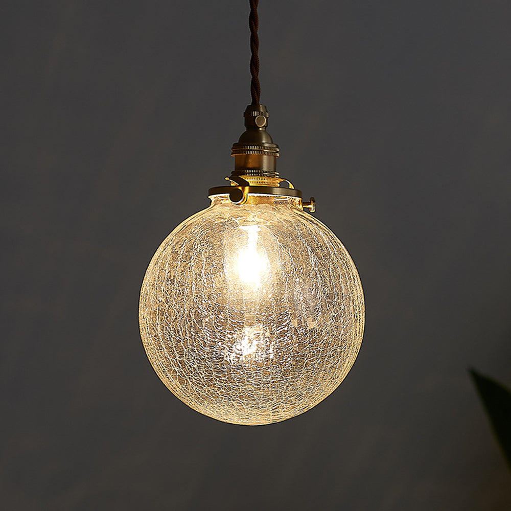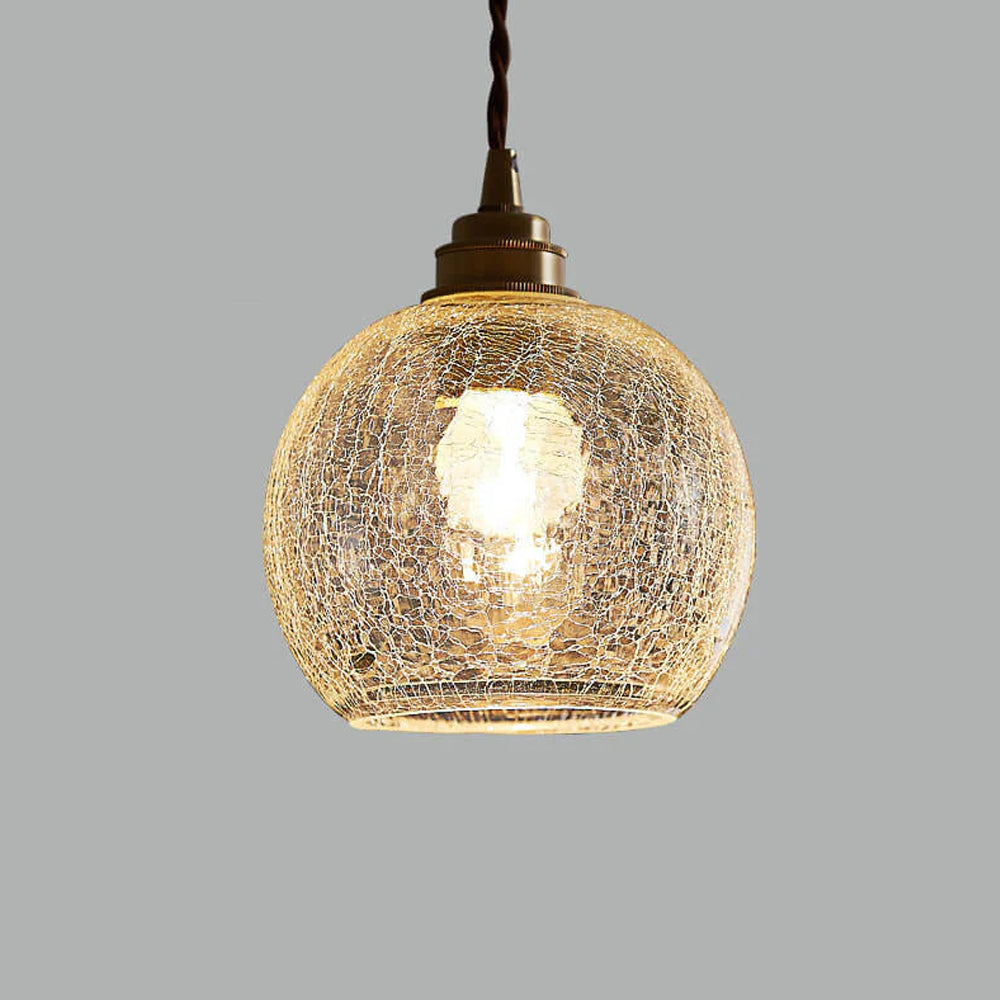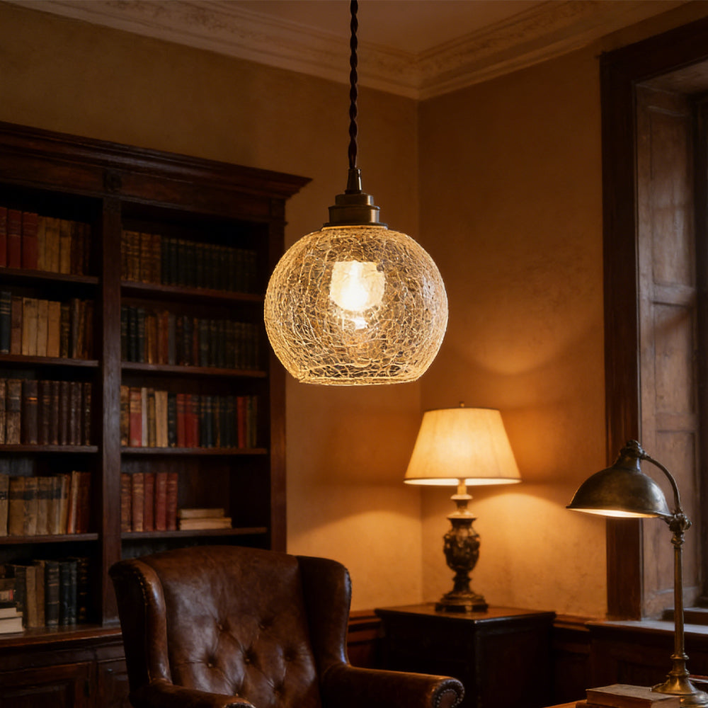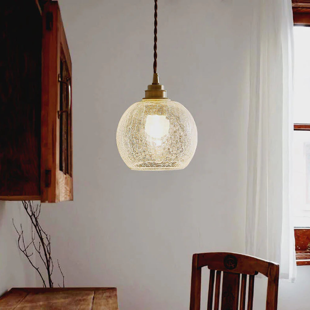 This vintage pendant light combines a crackle glass shade with warm brass finishes. Its textured glass creates a soft, diffused glow, adding timeless character to any room.