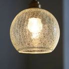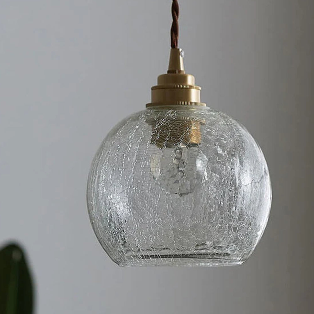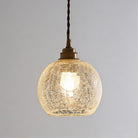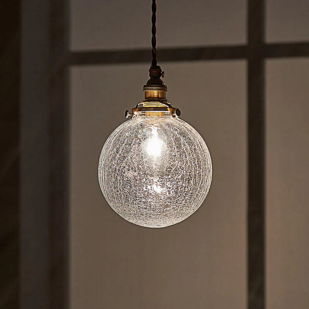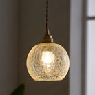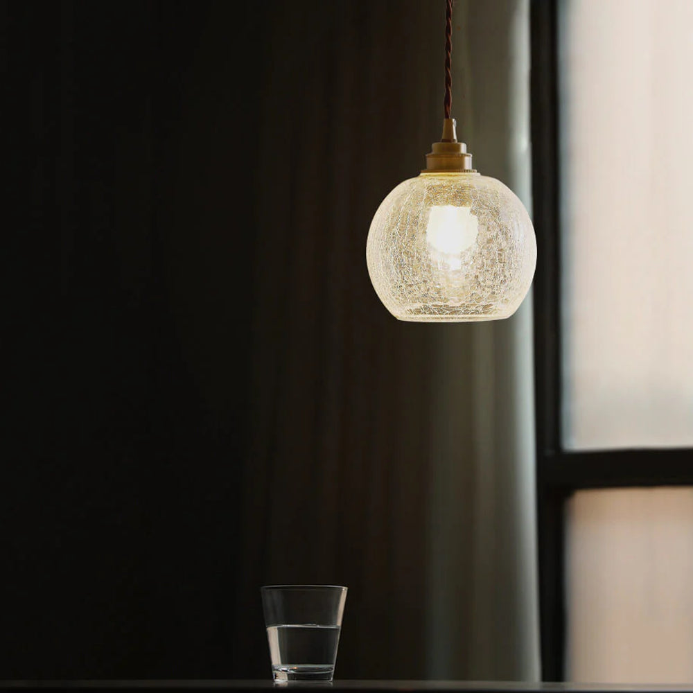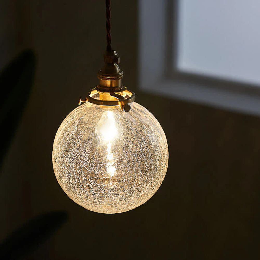 This vintage pendant light combines a crackle glass shade with warm brass finishes. Its textured glass creates a soft, diffused glow, adding timeless character to any room.