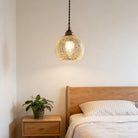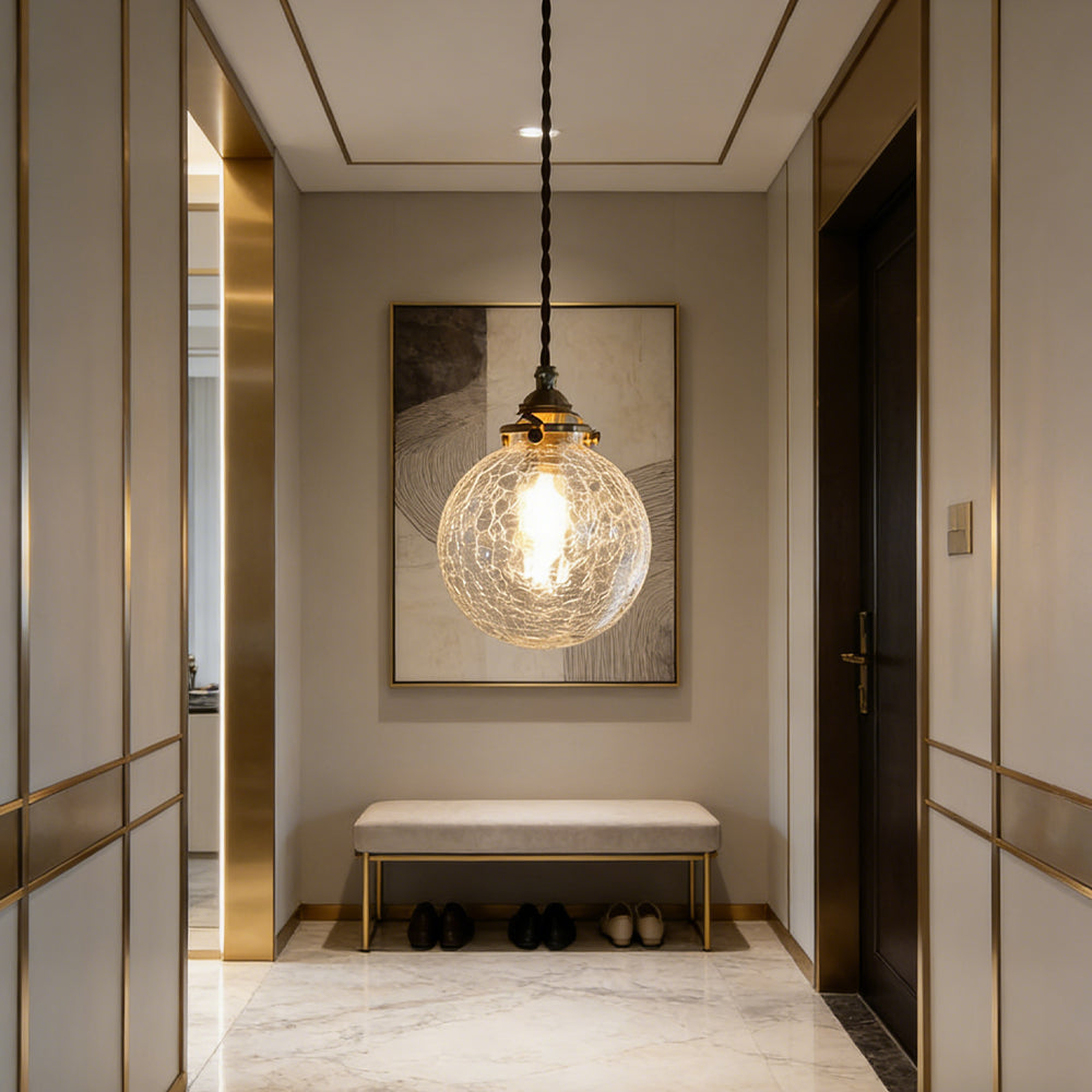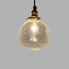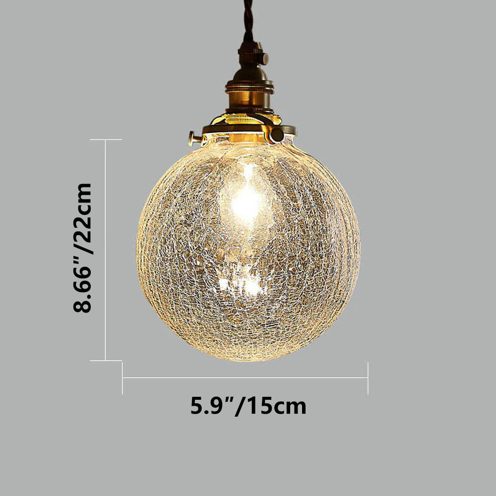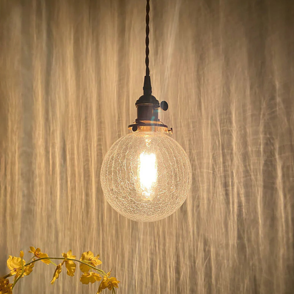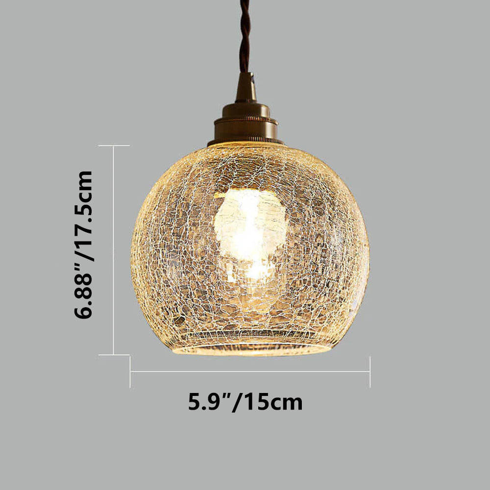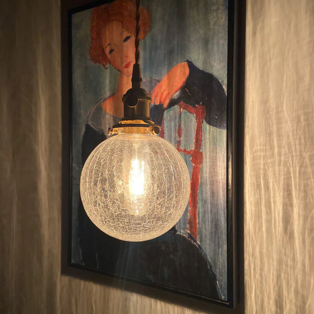 This vintage pendant light combines a crackle glass shade with warm brass finishes. Its textured glass creates a soft, diffused glow, adding timeless character to any room.