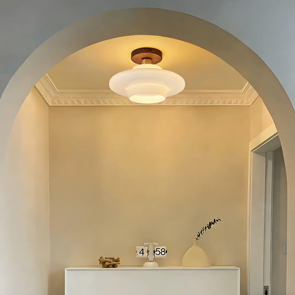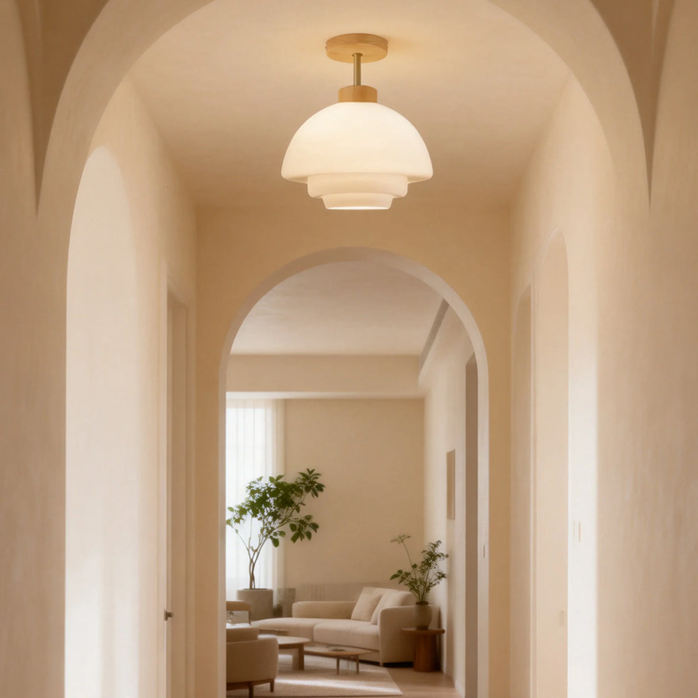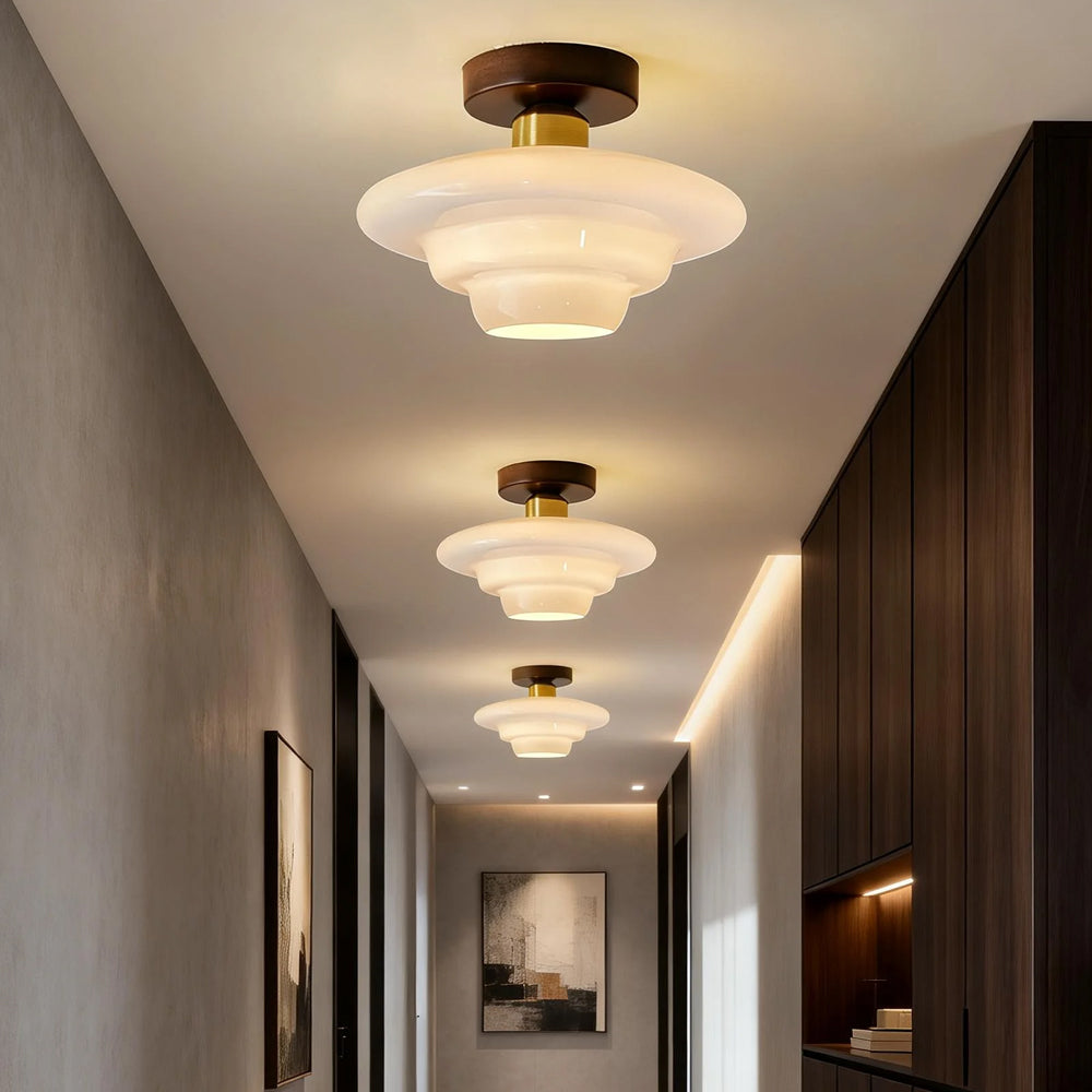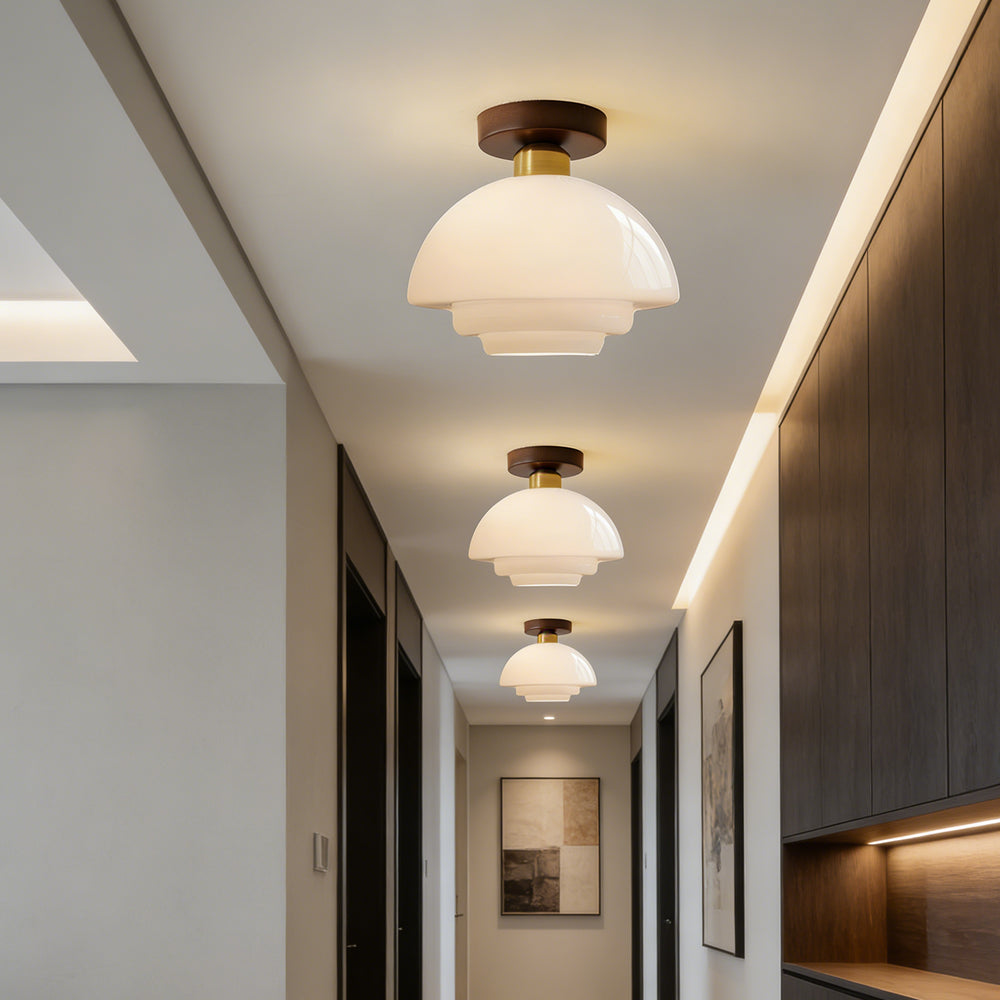 This ceiling light draws on the naturalist tone of Nordic design, combining walnut solid wood with a high-transparency glass lampshade. It is suitable for entryways, corridors, dining areas, and other spaces.