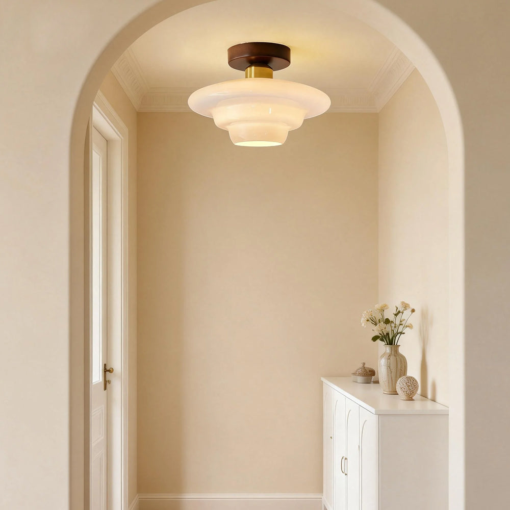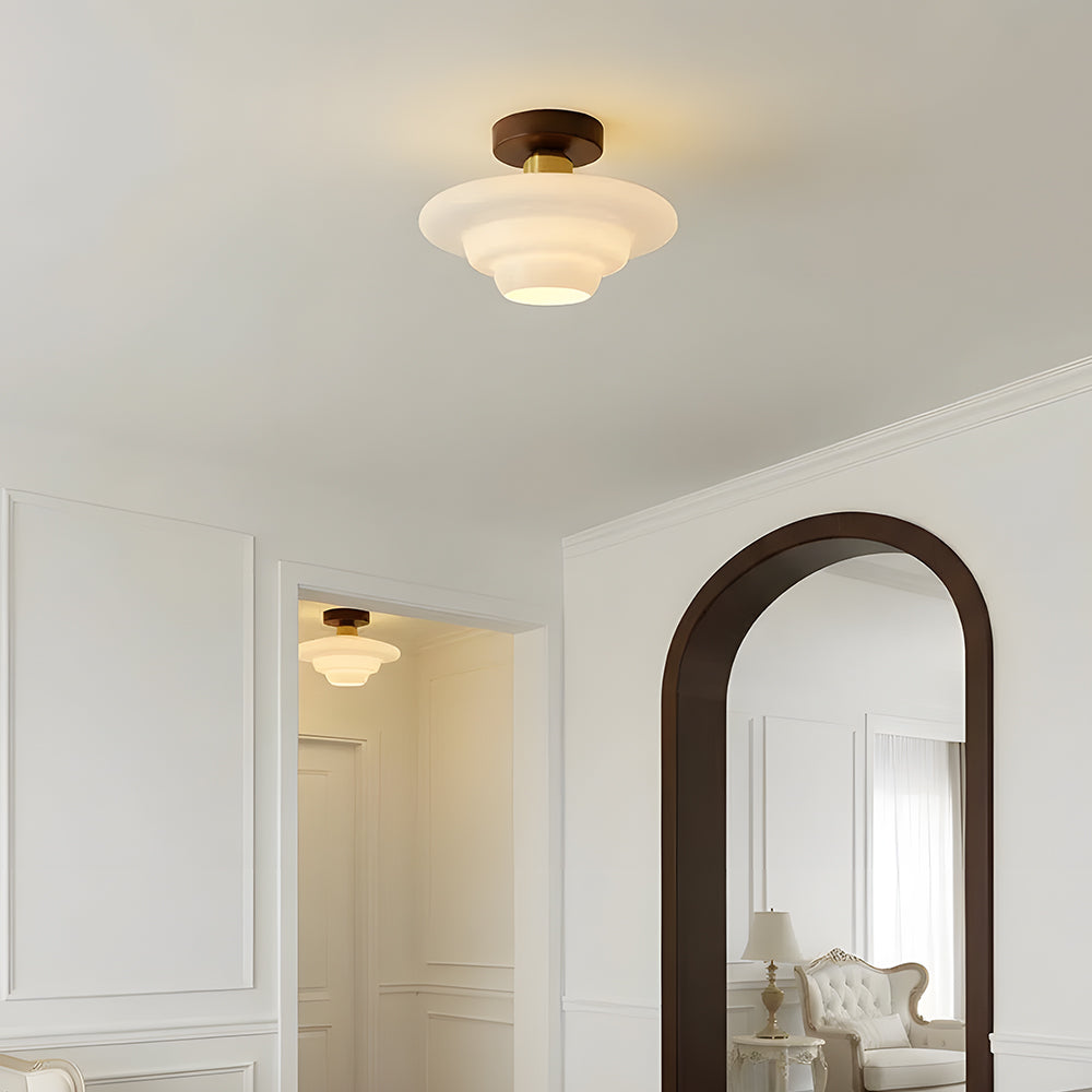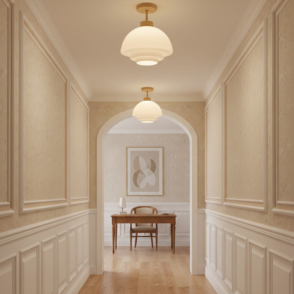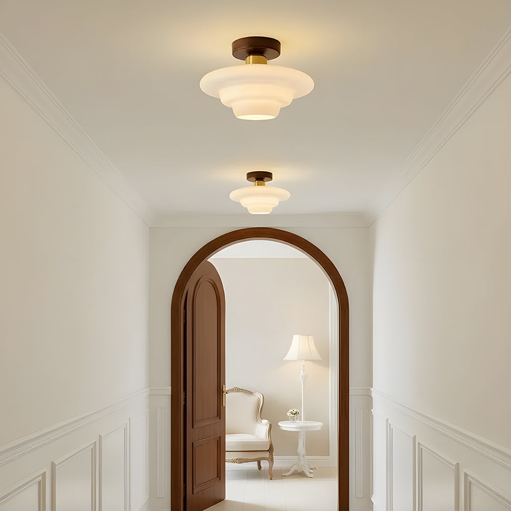 This ceiling light draws on the naturalist tone of Nordic design, combining walnut solid wood with a high-transparency glass lampshade. It is suitable for entryways, corridors, dining areas, and other spaces.