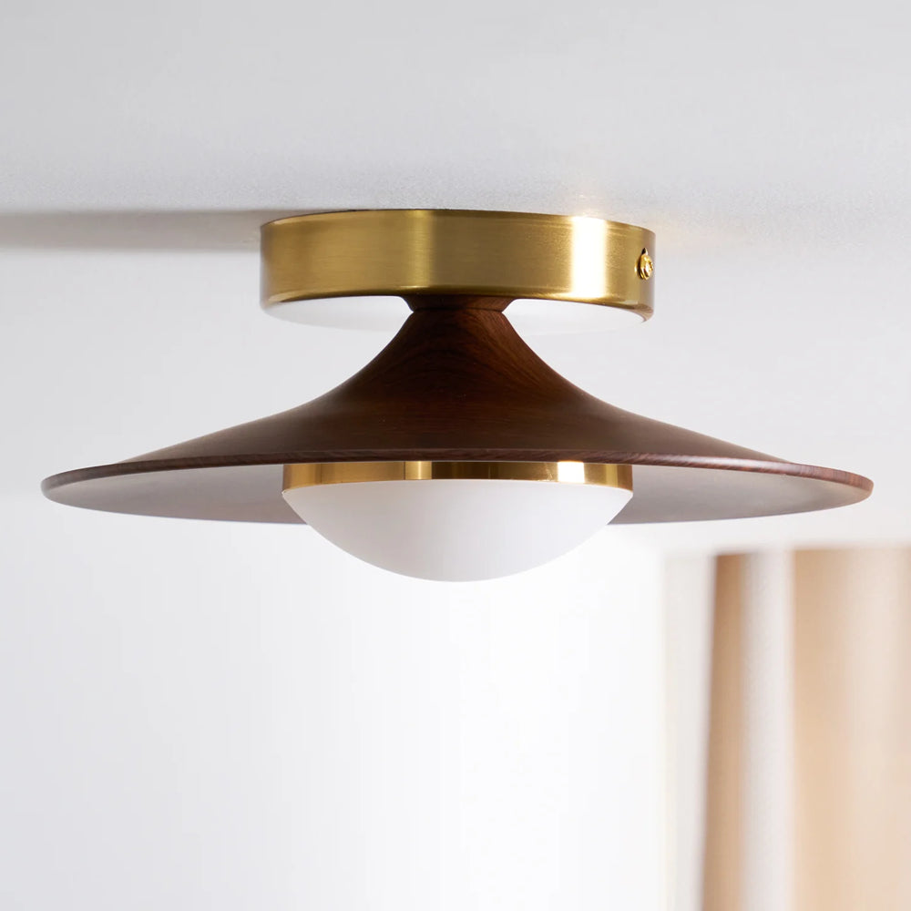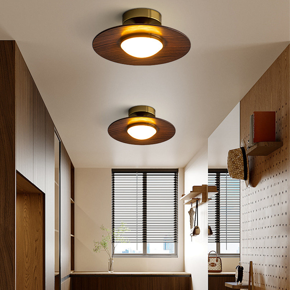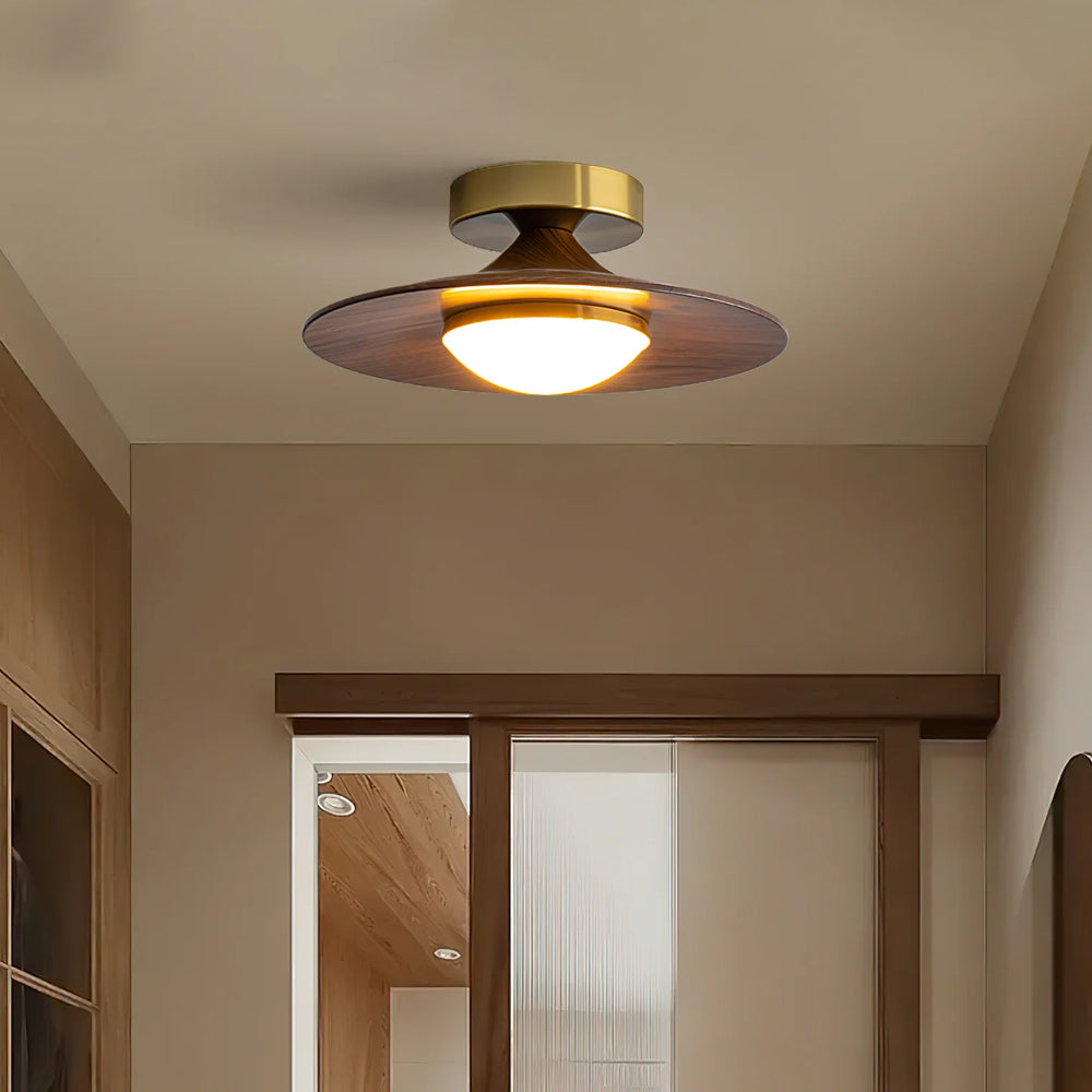 This ceiling lamp combines a sleek metal frame with a warm wood-textured accent for a look of contemporary elegance. Its compact design with clean lines brings a sophisticated, organic touch to kitchens, entries, and dining areas.
