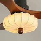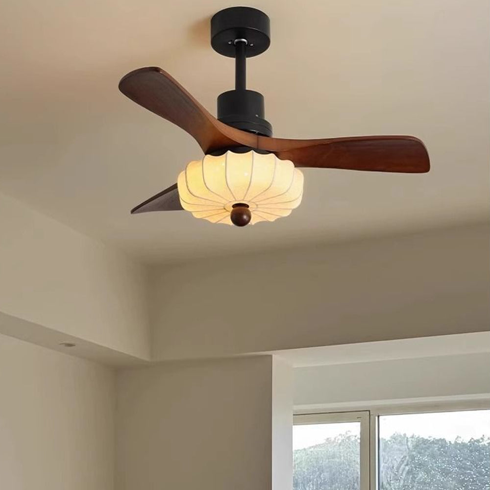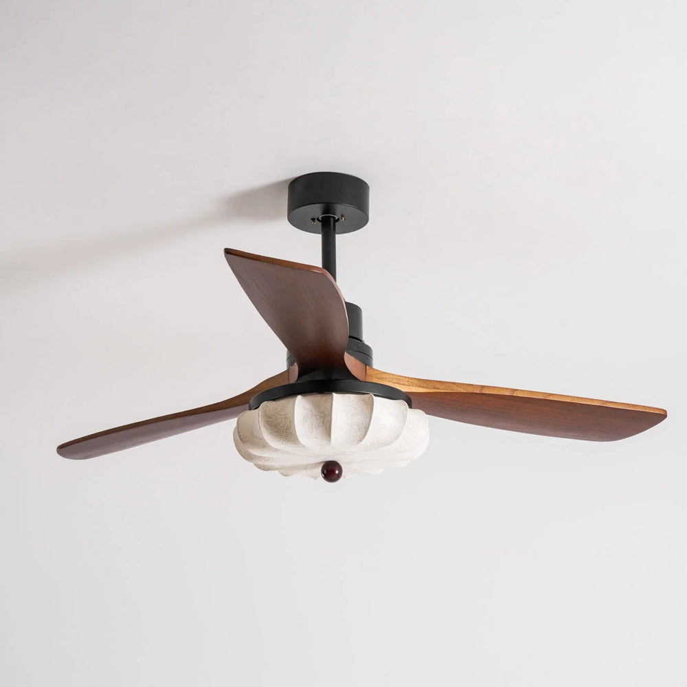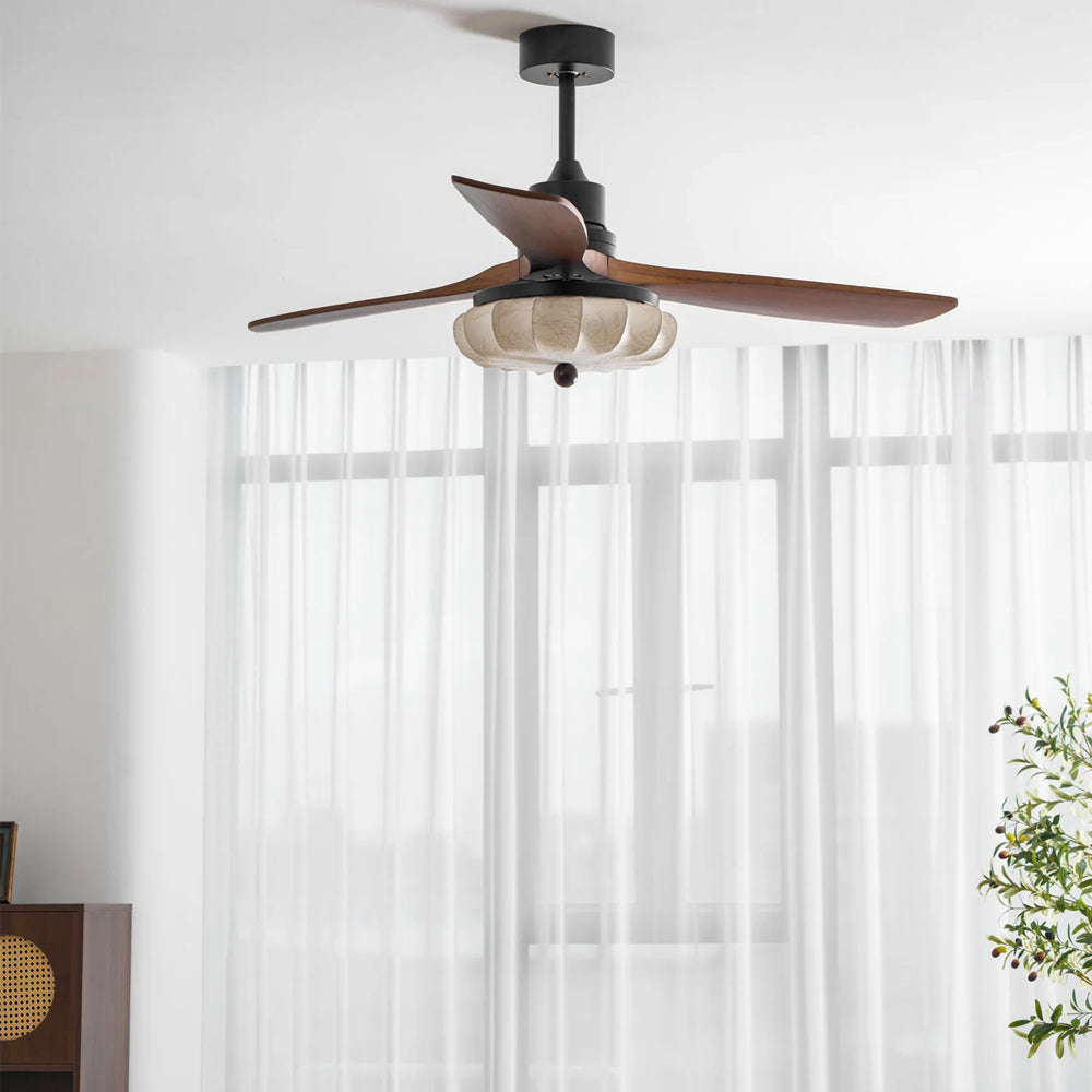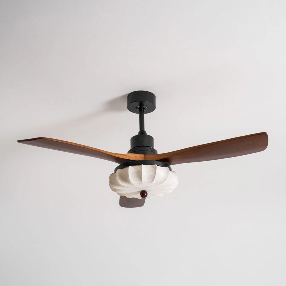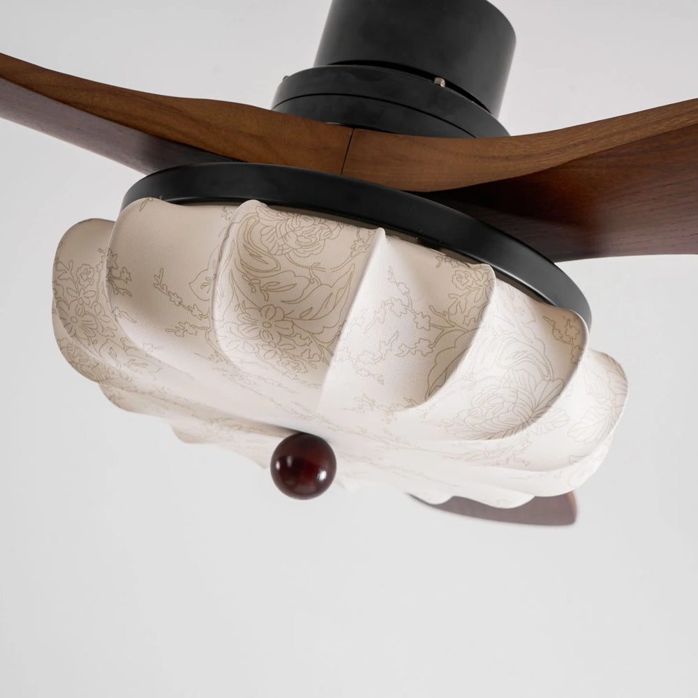 The Lotus Bloom Ceiling Fan Light combines modern style with serene elegance. It features dark walnut blades and a softly glowing fabric diffuser, inspired by a blooming lotus, for a perfect balance of natural texture and contemporary design.