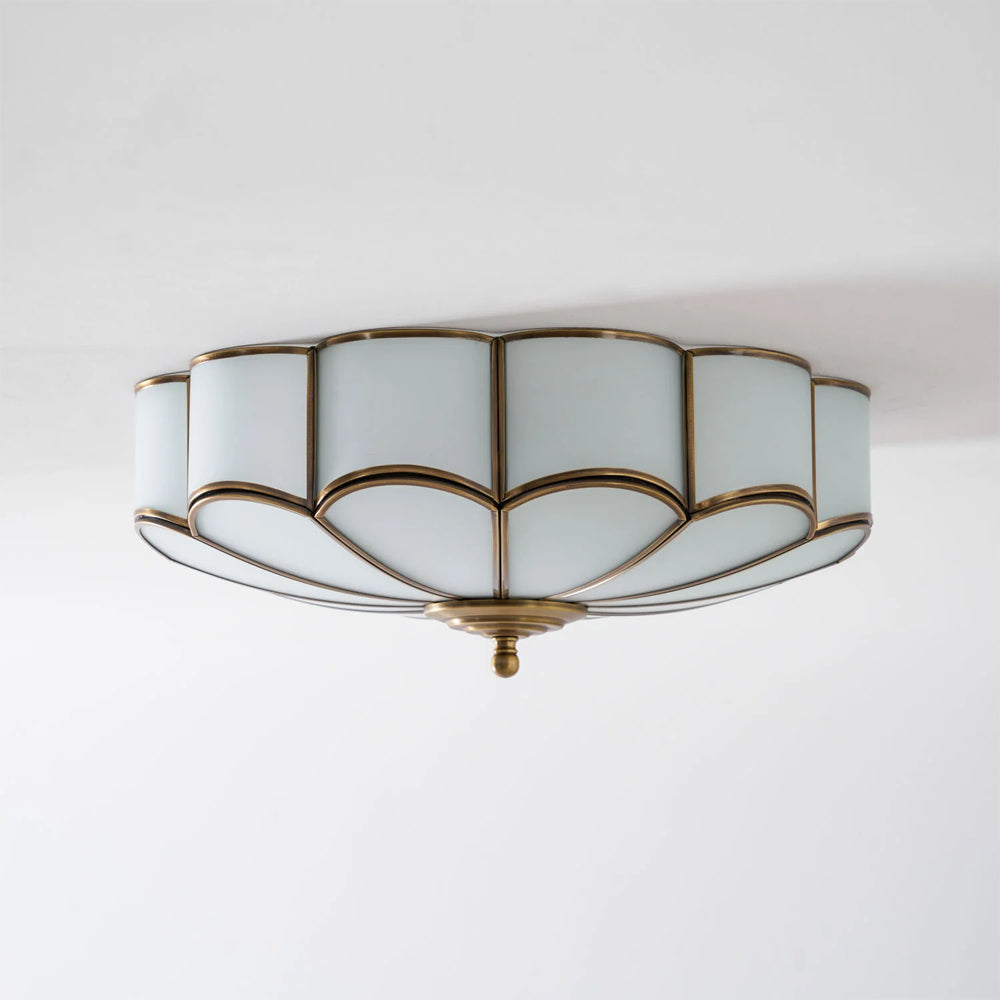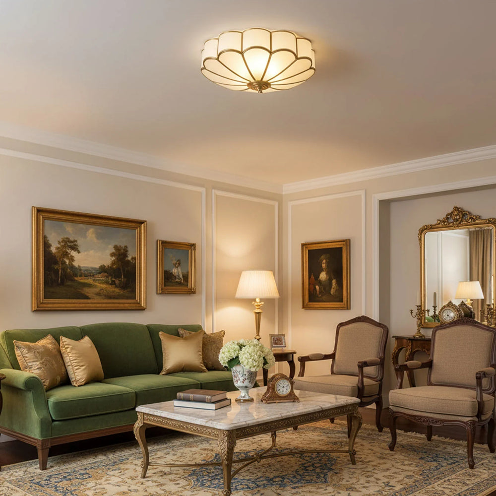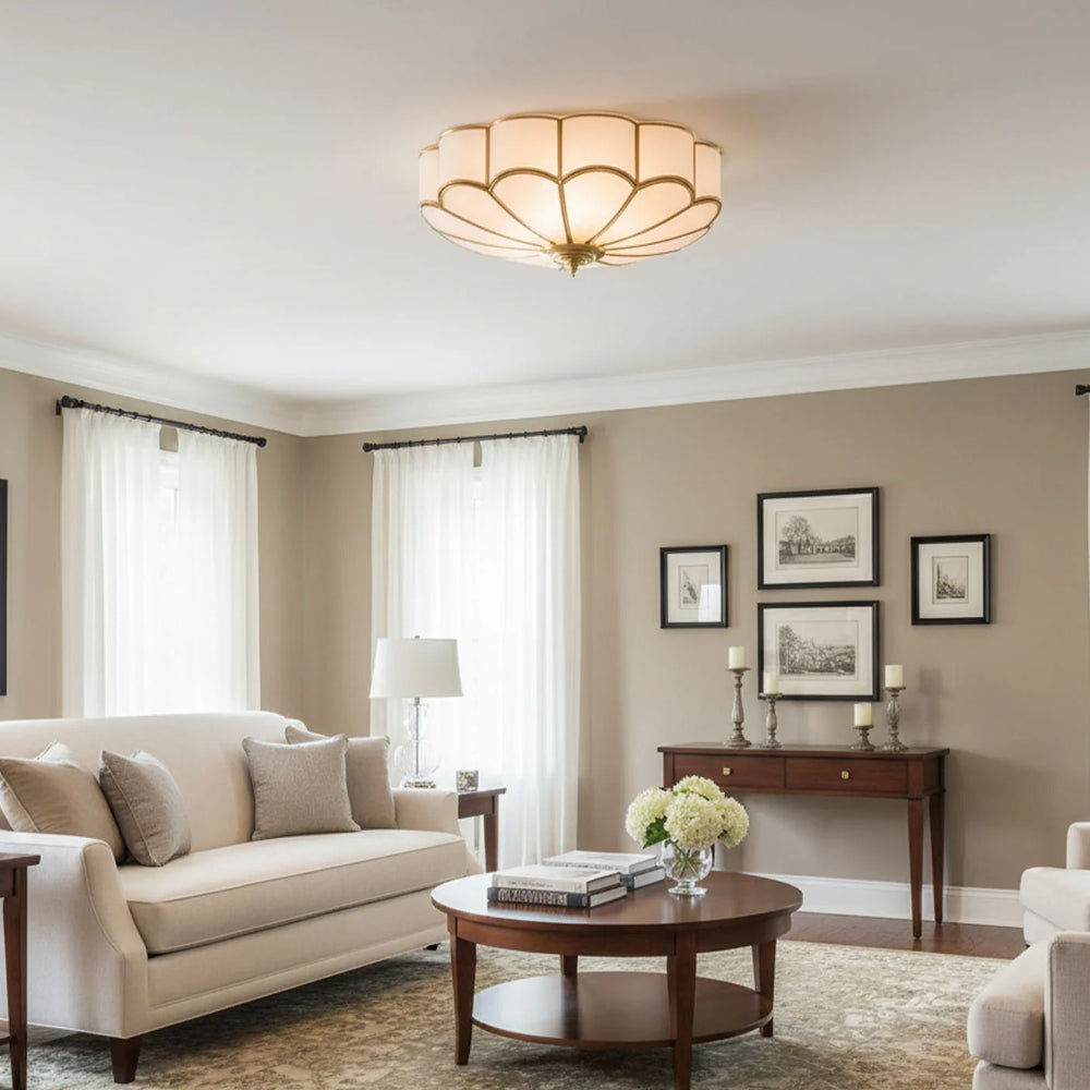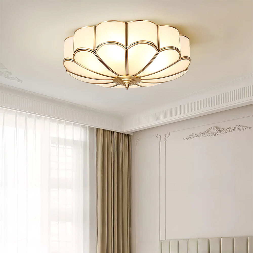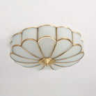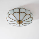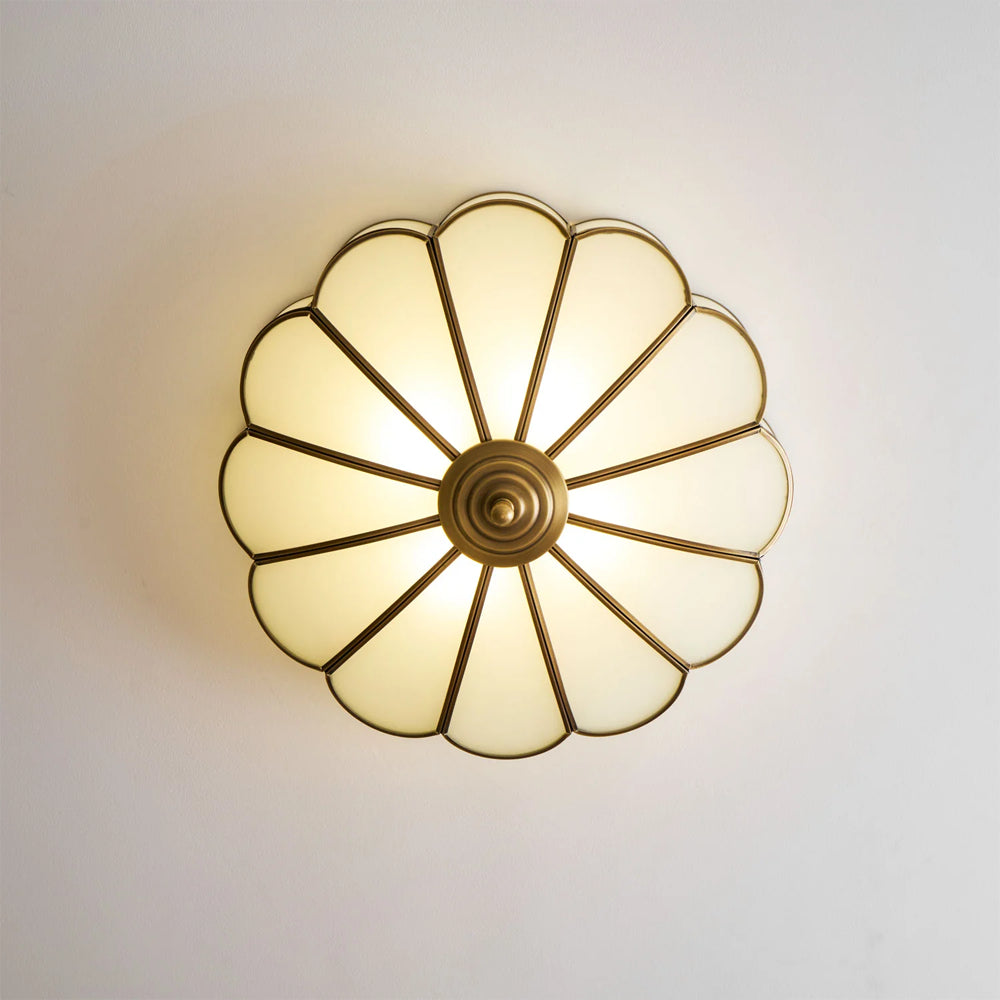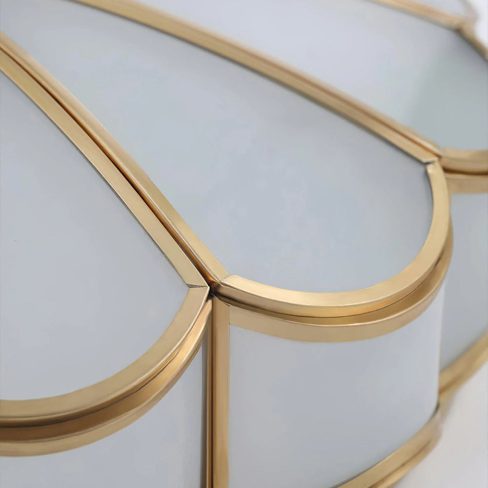 Elevate your space with this artisanal Flower Shape Ceiling Light. Crafted from frosted glass and brass, it emits a soft, dimensional glow, adding a touch of postmodern luxury to any room.