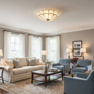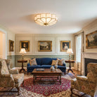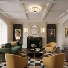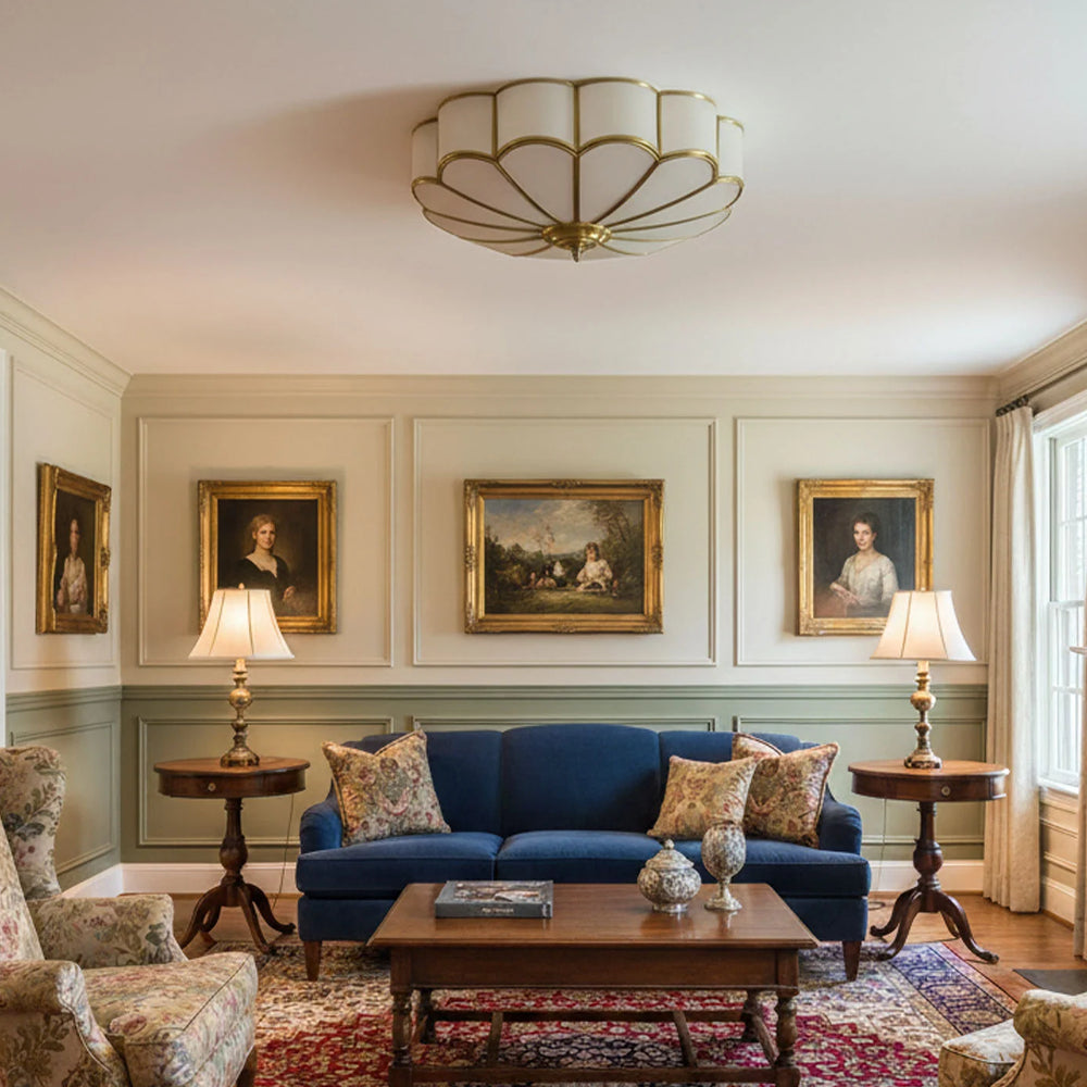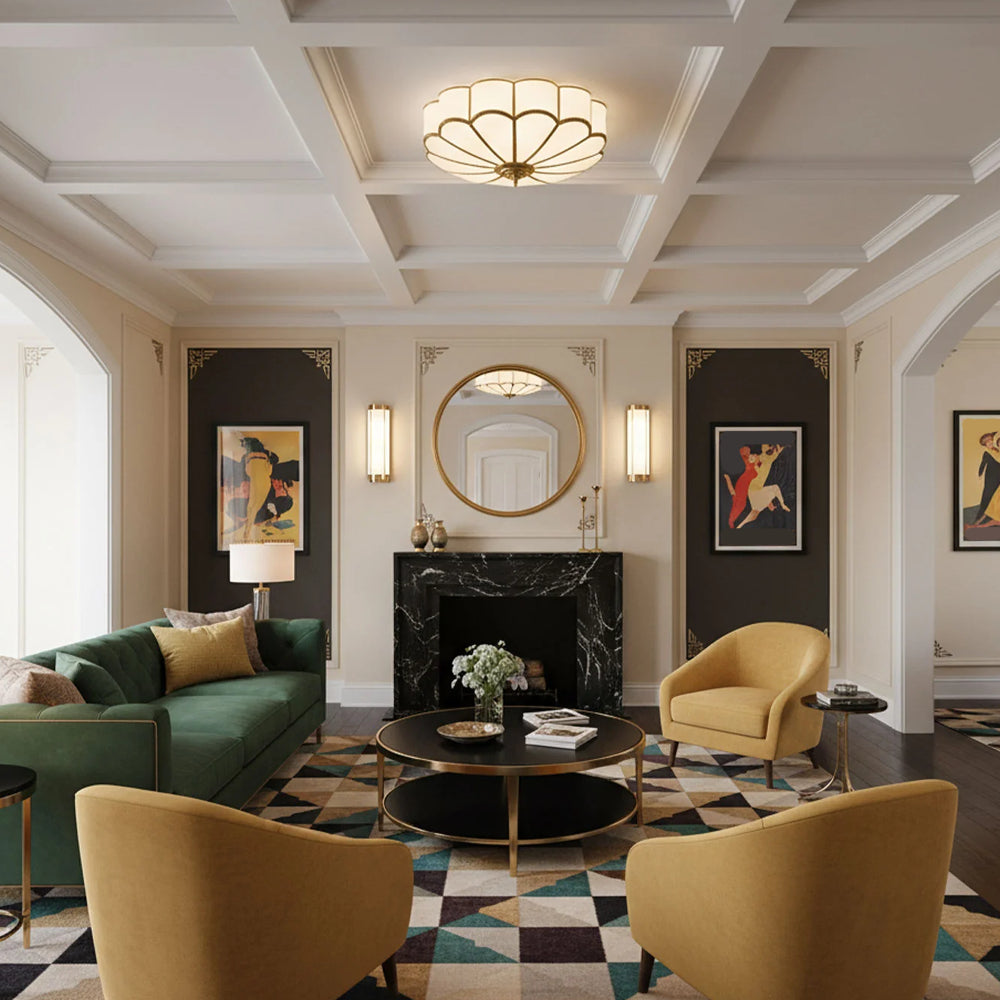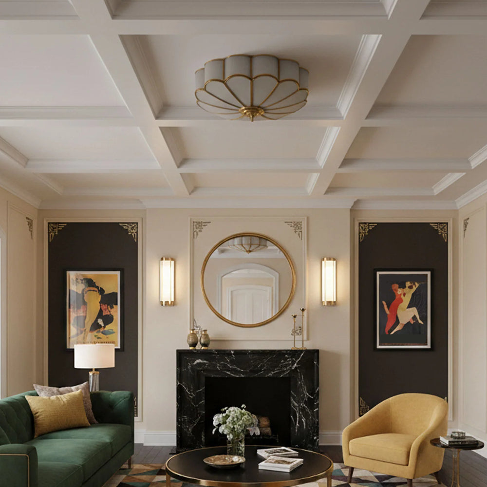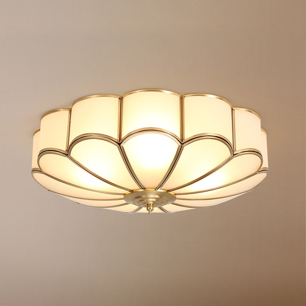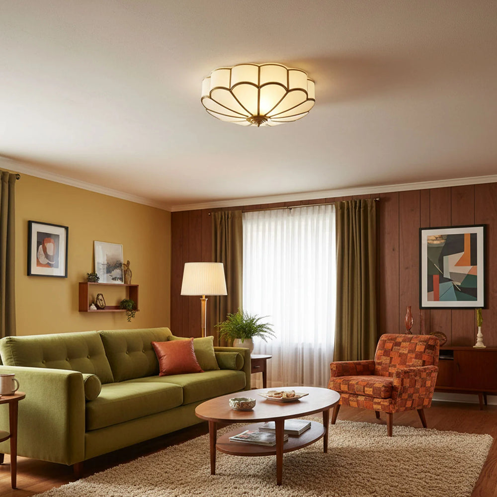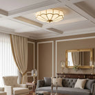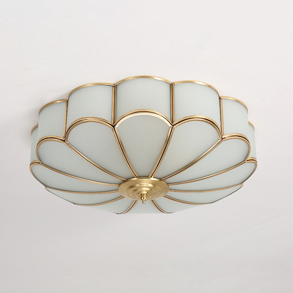 Elevate your space with this artisanal Flower Shape Ceiling Light. Crafted from frosted glass and brass, it emits a soft, dimensional glow, adding a touch of postmodern luxury to any room.