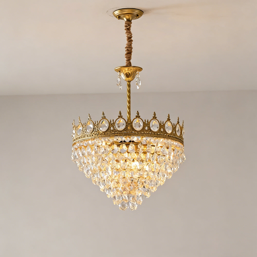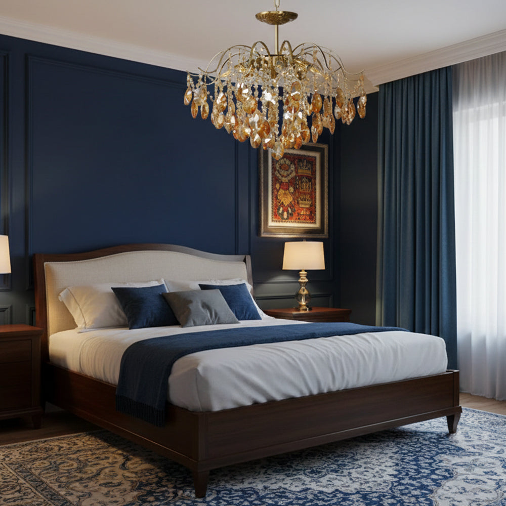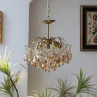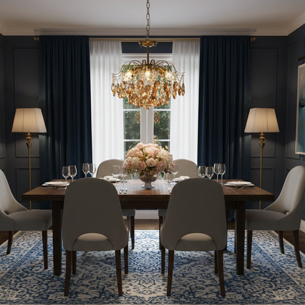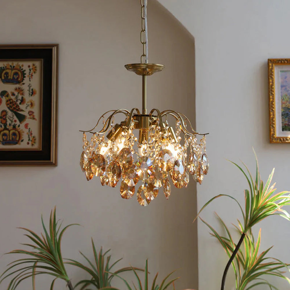 This Crystal Chandelier is ideal for creating a romantic atmosphere. It features a unique design with a gold-plated metal frame, amber-colored crystal accents, and a luxurious, antique-style design. Its stylish design and craftsmanship exude an air of sophistication, making it a perfect choice for your living room. It also features a sturdy construction and is designed to last for years. Add a touch of glamour to your home with this beautiful chandelier.