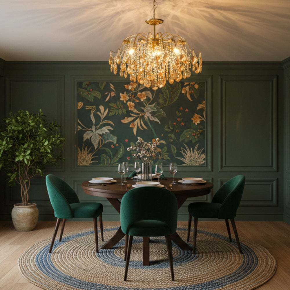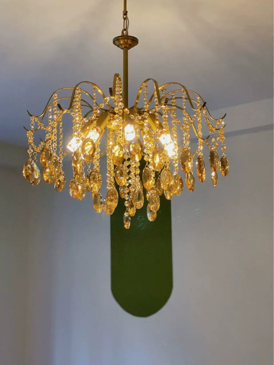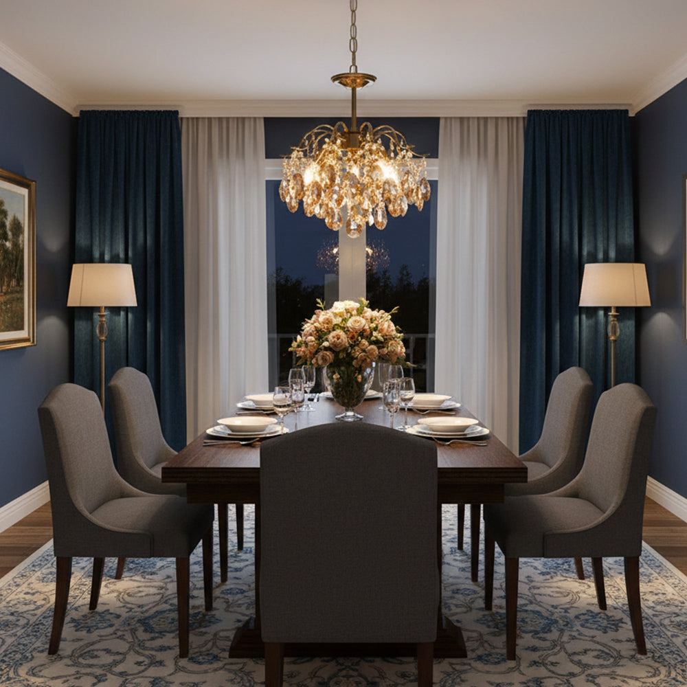 This Crystal Chandelier is ideal for creating a romantic atmosphere. It features a unique design with a gold-plated metal frame, amber-colored crystal accents, and a luxurious, antique-style design. Its stylish design and craftsmanship exude an air of sophistication, making it a perfect choice for your living room. It also features a sturdy construction and is designed to last for years. Add a touch of glamour to your home with this beautiful chandelier.