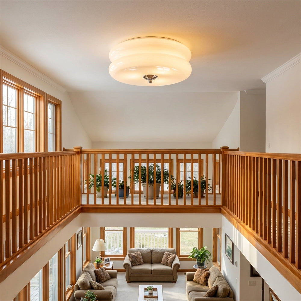 With the wonderful tiers so distinctive a traditional egg, this beautiful milkglass hangs as a lovely, semi-flush ceiling light. Look at the glow and definition of the shape. A perfect accent for a farmhouse or cottage.
