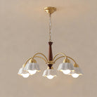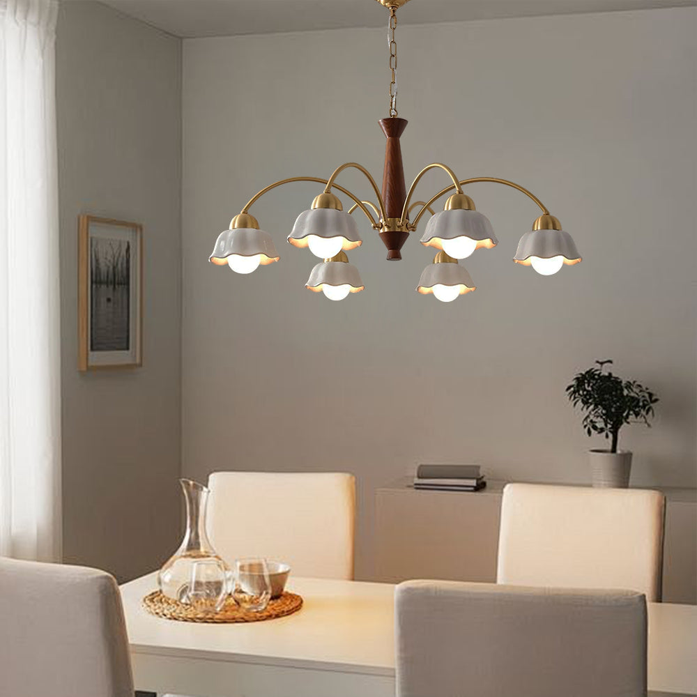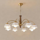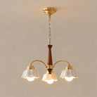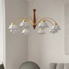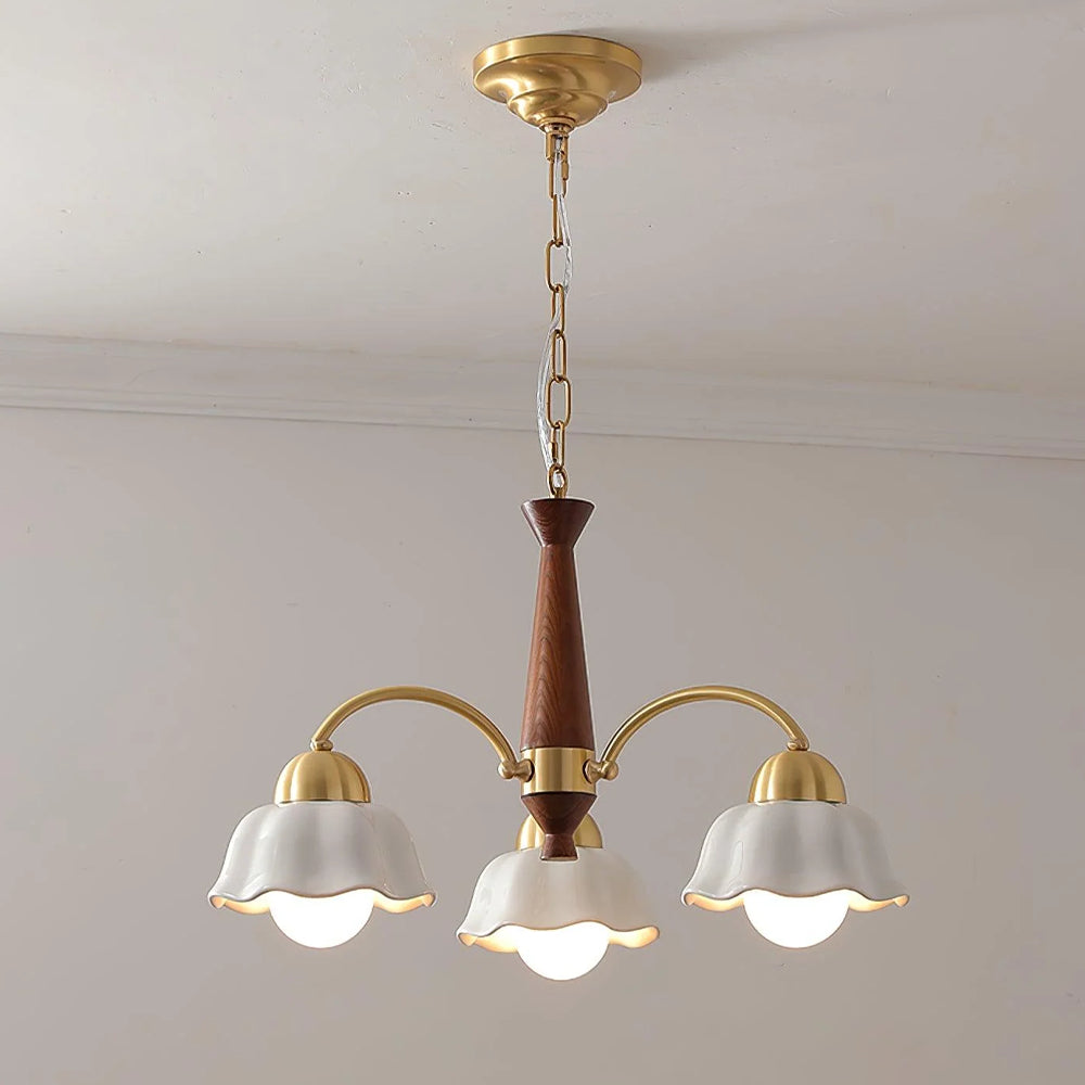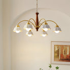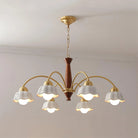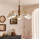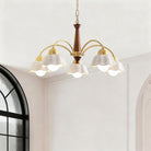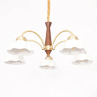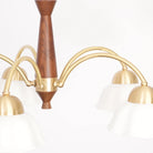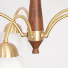 Discover this exquisite chandelier, a true testament to midcentury design. Featuring a sculptural form in brass and wood, each arm is topped with a frosted opaline shade for a soft, gallery-quality glow. A statement piece for the design-savvy home.
