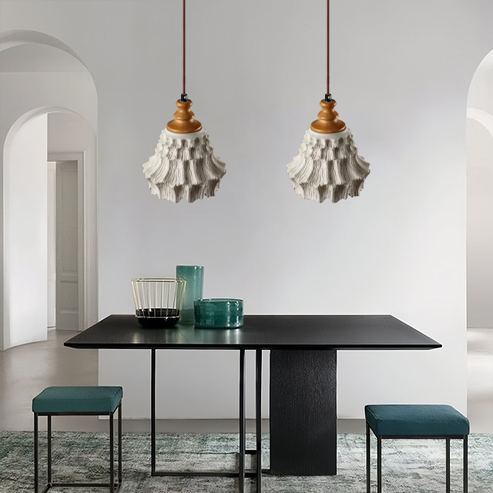 Design Style: This pendant light has a unique design style, perfectly blending cream-colored plaster with wooden elements, presenting a special yet high-end visual effect. The plaster part uses special lines and a design shape, making the entire pendant light stand out; the wooden part uses simple lines and natural textures, adding a sense of simplicity and heaviness to the entire chandelier. This pendant light is suitable for both modern and simple restaurant environments and for homes that pursue a natural and warm style.
