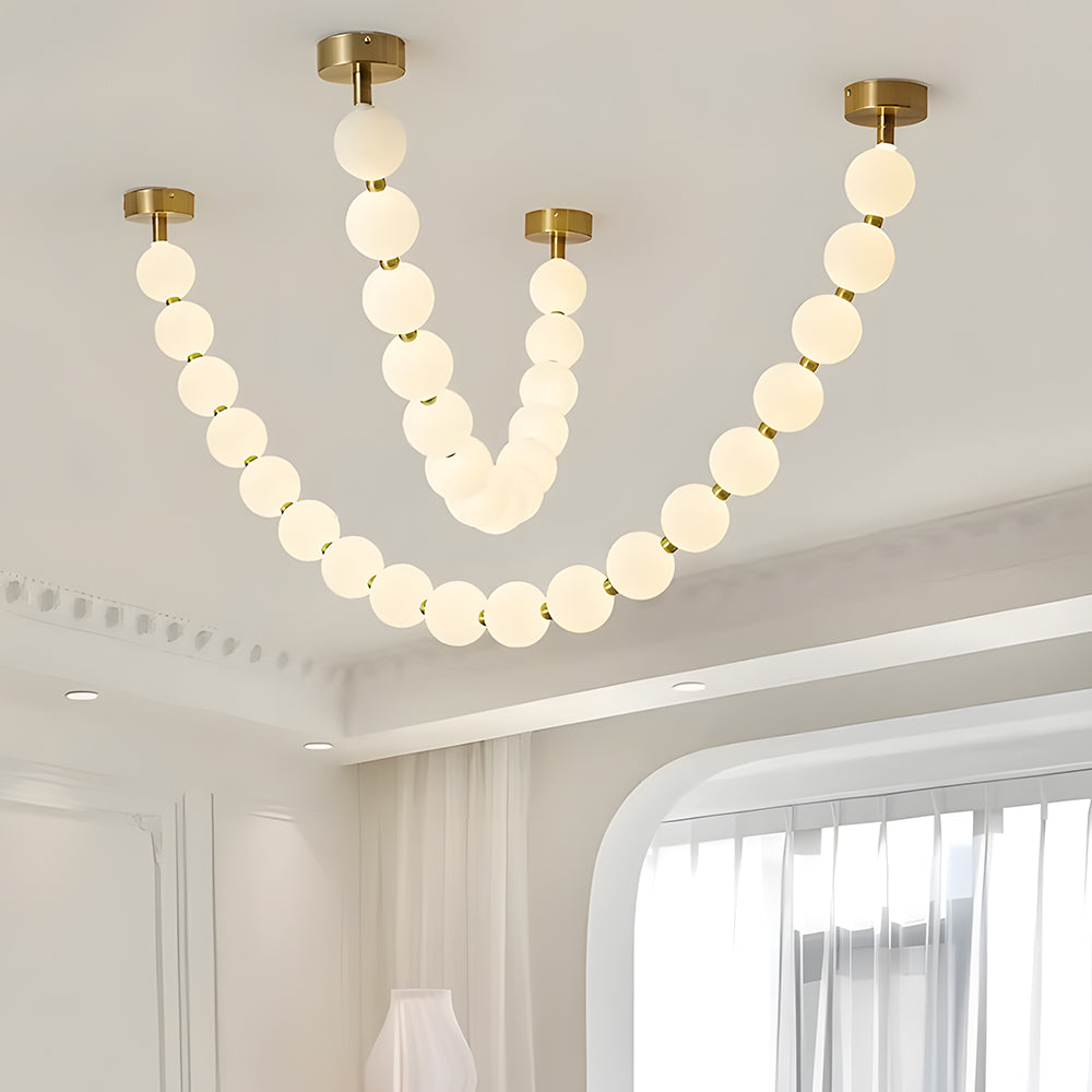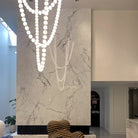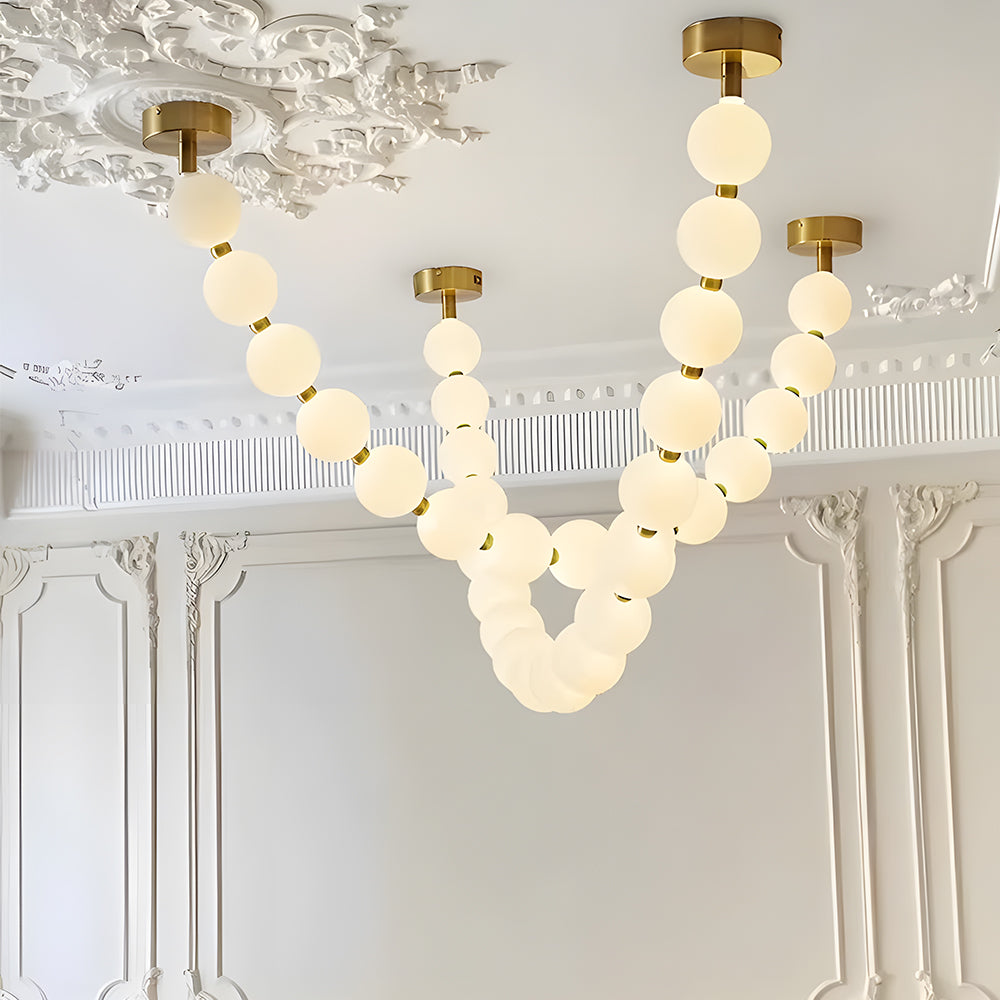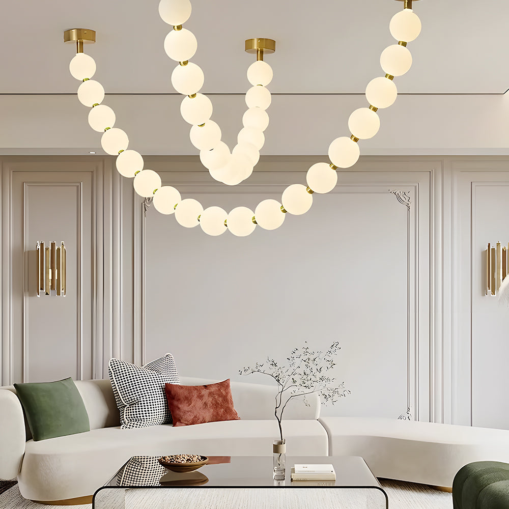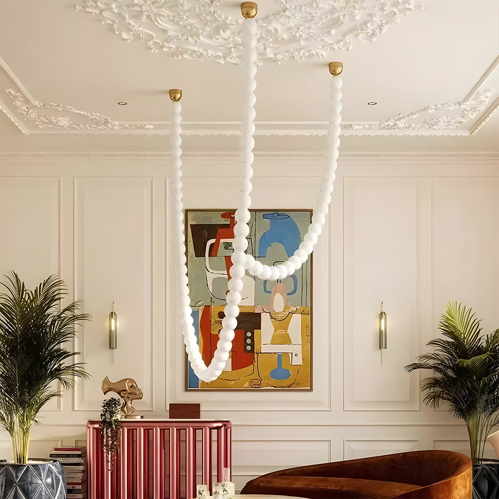 A cascade of luminous pearls, artfully arranged in a graceful necklace design. This white chandelier brings refined elegance to any space, transforming your ceiling into a vision of timeless beauty.