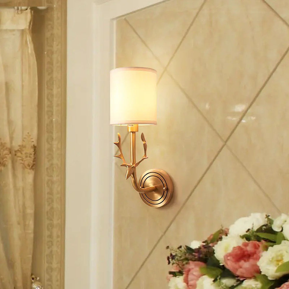 Highlights a charming deer head shape paired with ductile artificial silk lampshades. This double-head fixture has two light sources, each linked to a circular back panel—clean brass lines blend traditional warmth with modern style seamlessly.