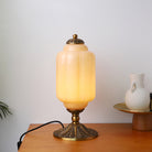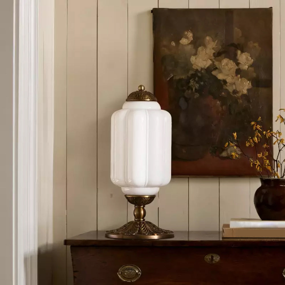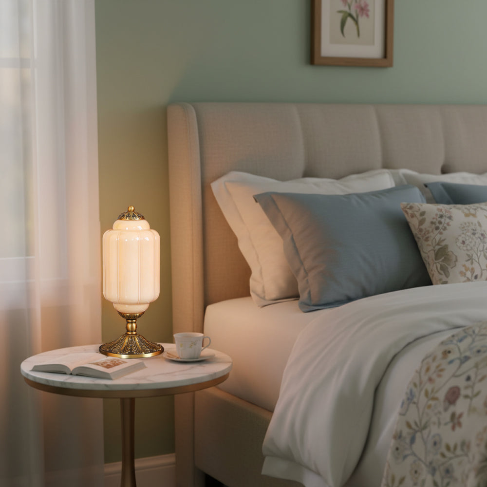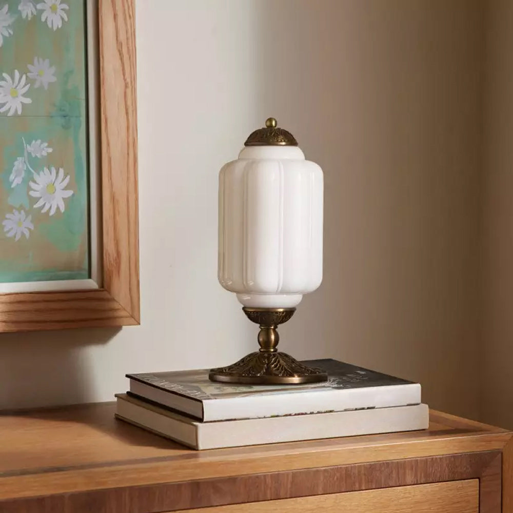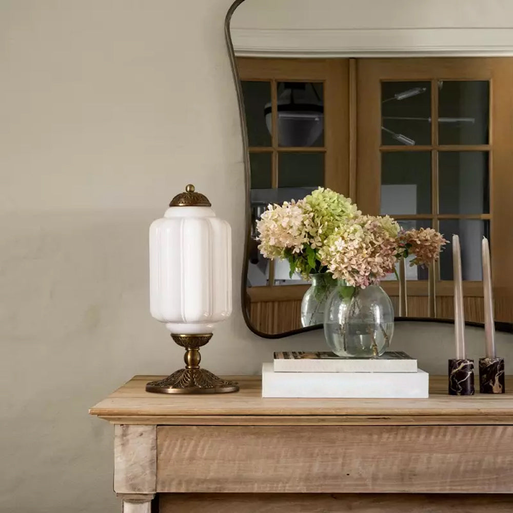 This retro-style table lamp brings French charm with elegance and nostalgia. Its textured cream glass emits warm diffused glow, perfect for cozy spaces. Sized for nightstands/coffee tables, durable brass for timeless refined appeal.