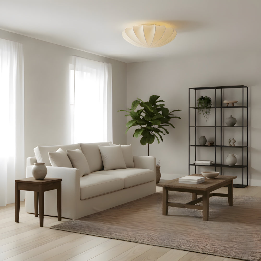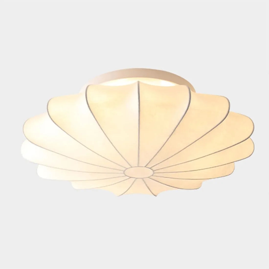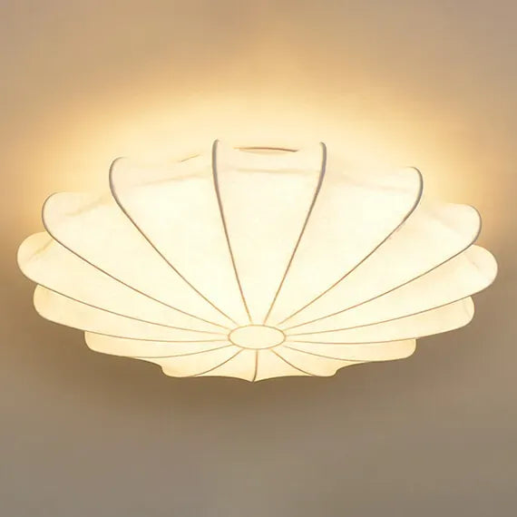 Elevate your space with poetic elegance!Lotus-inspired curved panels cast warm ambient light, etched with intricate patterns. Cream fabric shade + bronzed canopy add modern refinement, delivering quiet luxury to any living space.