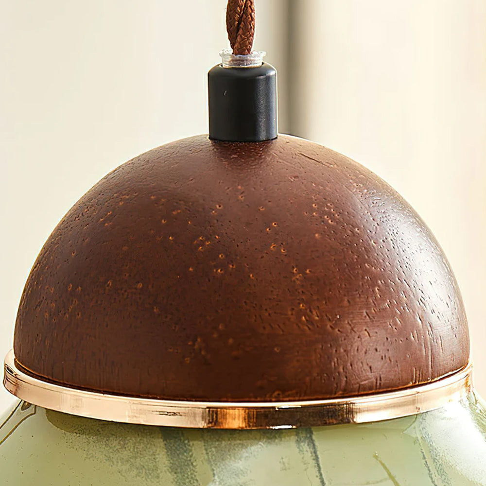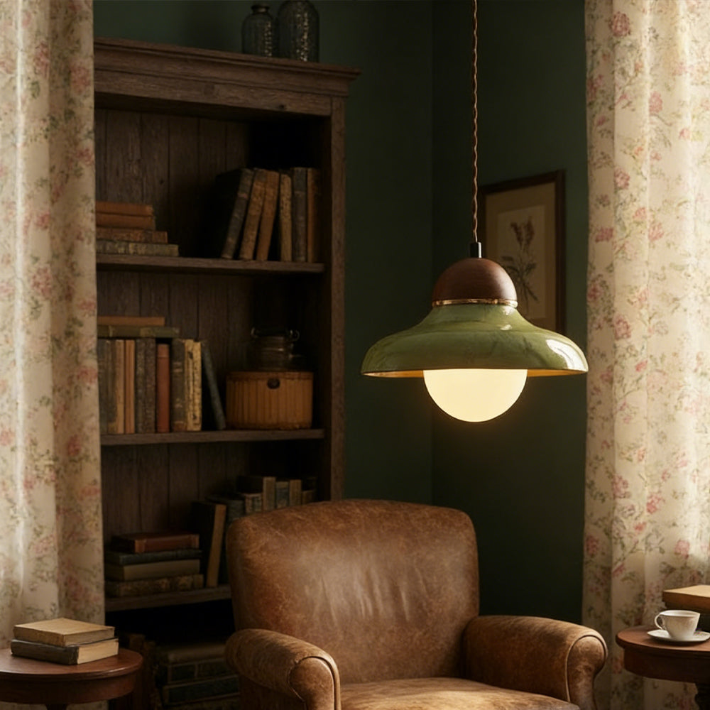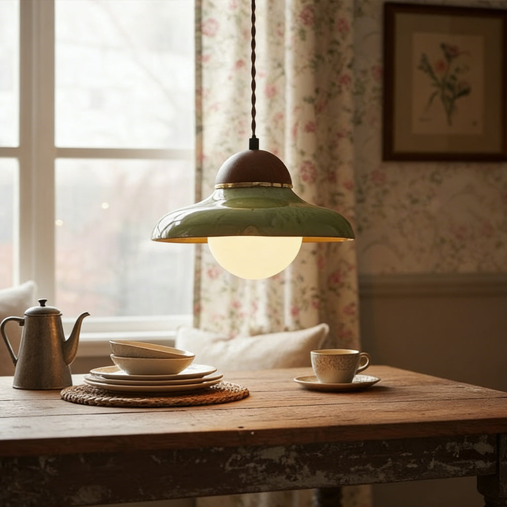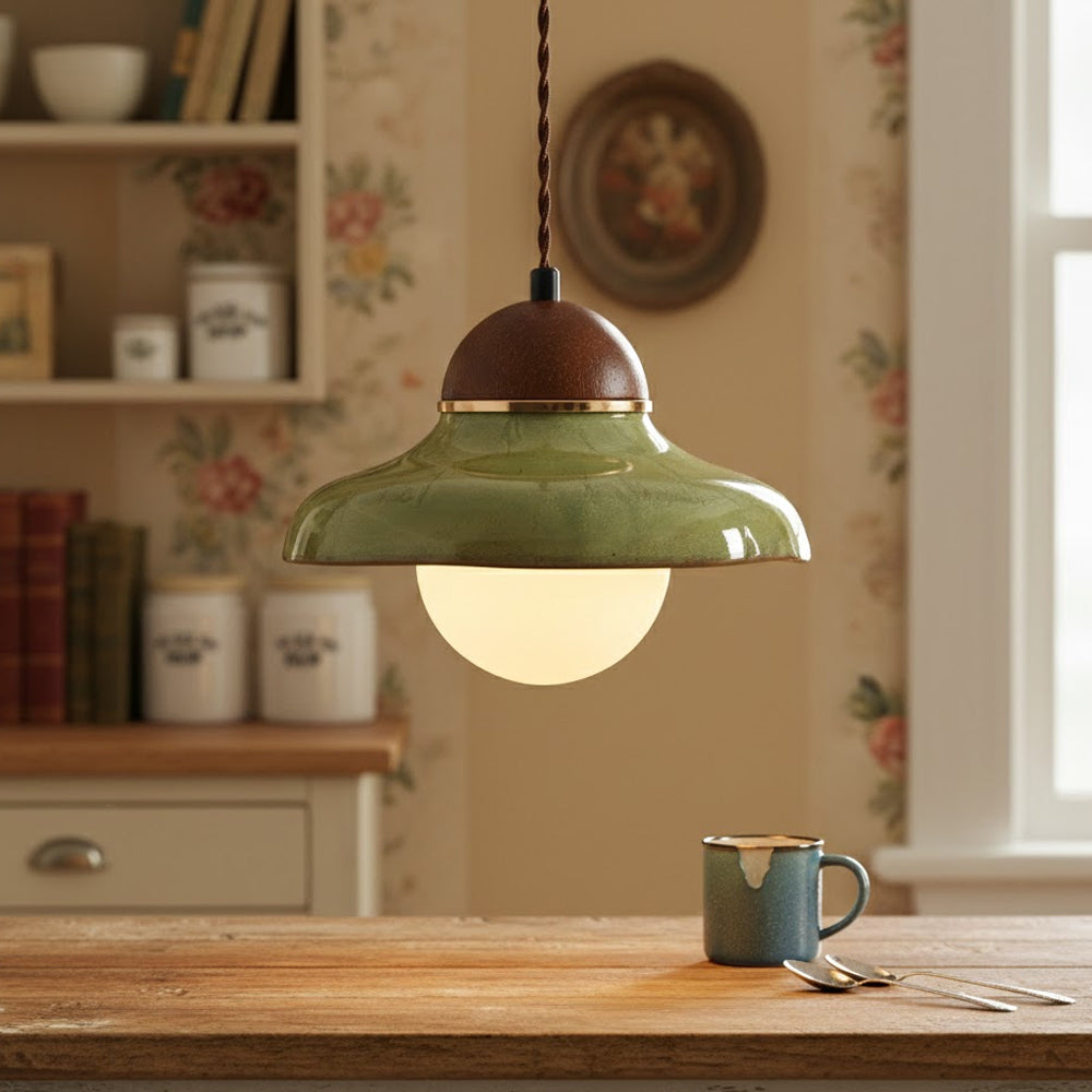 Channel countryside nostalgia with this charming fixture! A rich green ceramic shade paired with a wooden cover sets a cozy tone, and the soft globe bulb glow wraps your space in warmth. Hang it over a kitchen island or entryway for instant vintage character.