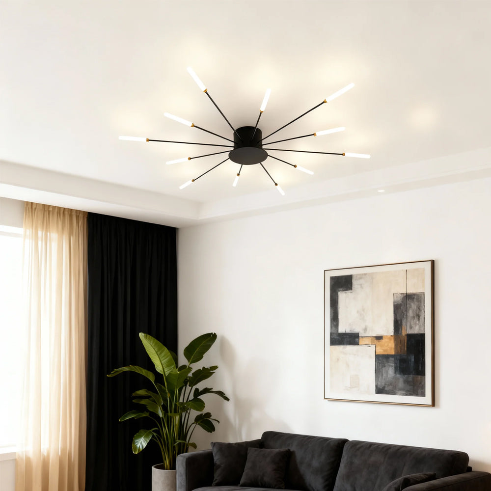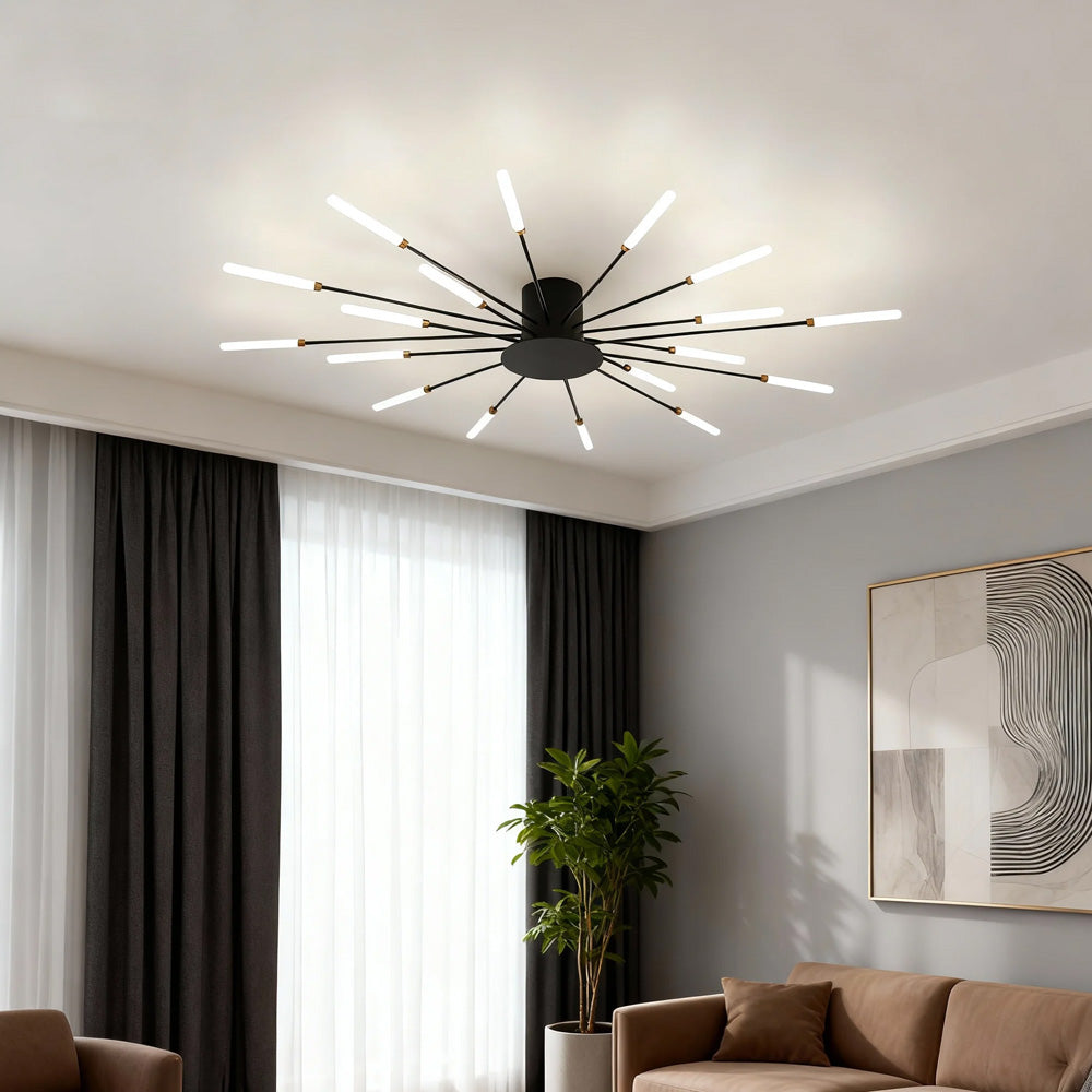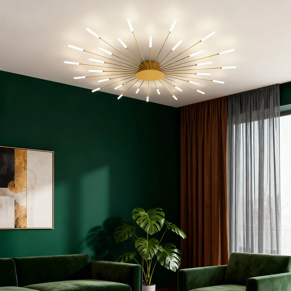 A metallic firework blooming on your ceiling. Crafted from lightweight aluminum with radiating structures and warm LED lighting, it instantly elevates space with ceremonial elegance – capturing ephemeral brilliance in timeless design.