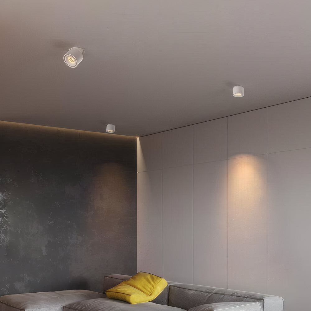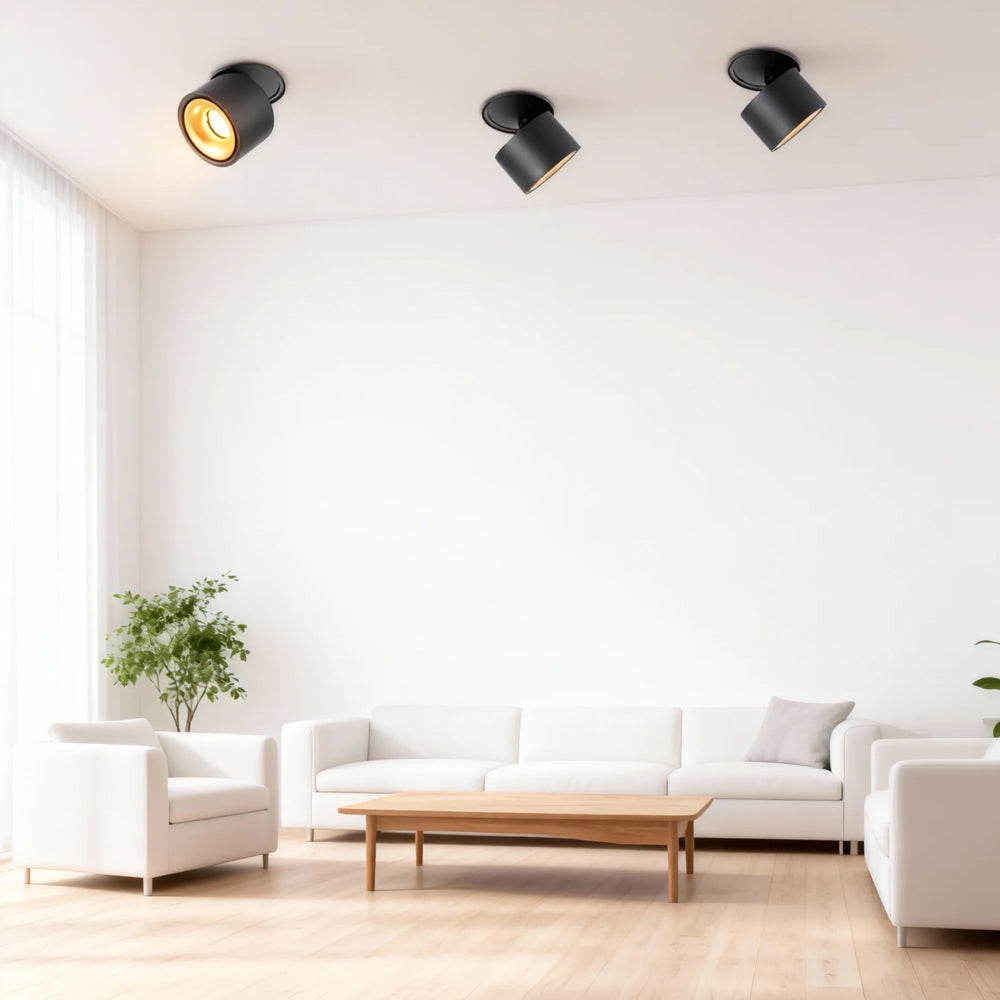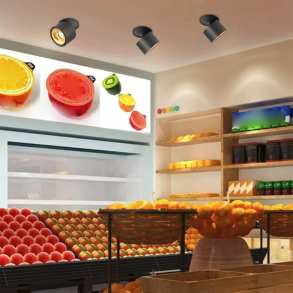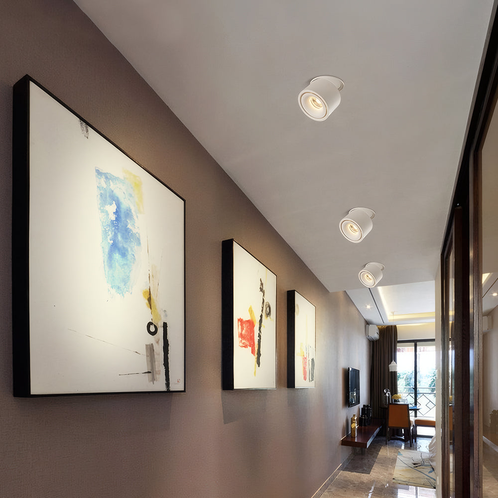 The cylindrical aluminum lamp body supports vertical folding and horizontal rotation, equipped with high color-rendering LEDs. Its recessed installation is compatible with ceiling structures, specifically designed for accent lighting in galleries, malls, and residential spaces.