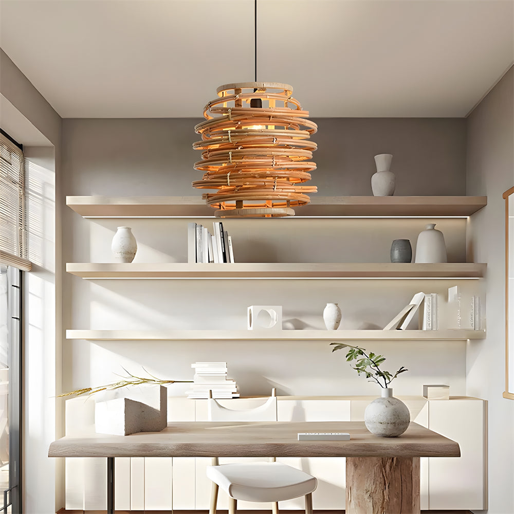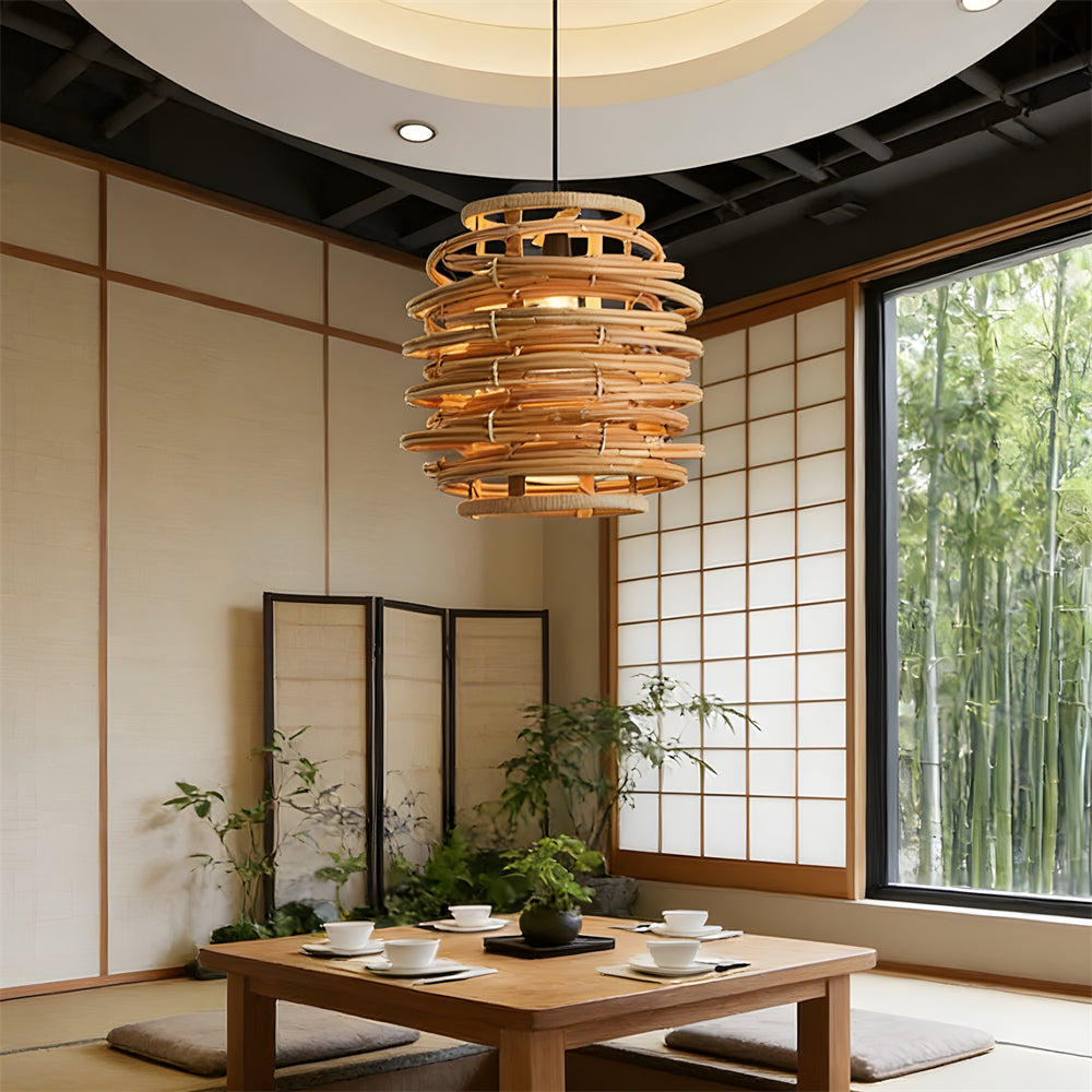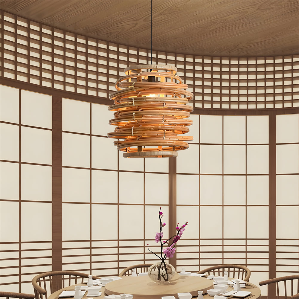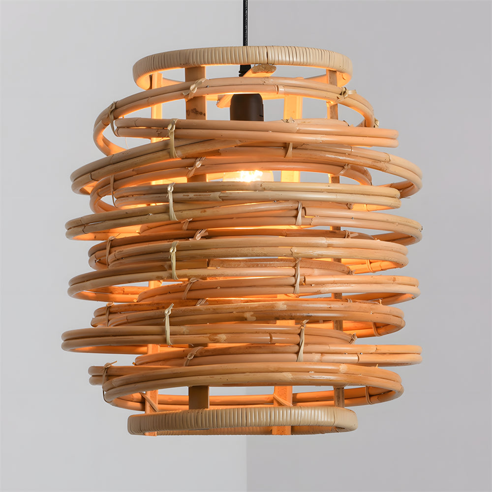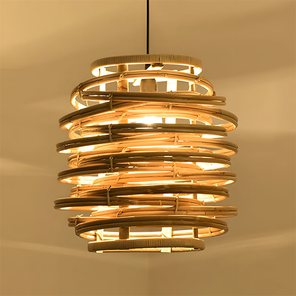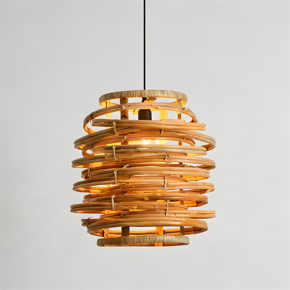 Expertly handwoven from bamboo, this pendant lamp showcases a unique stacked ring design that creates organic texture and visual depth. It emits a warm, dappled glow, infusing any room with serene natural elegance.