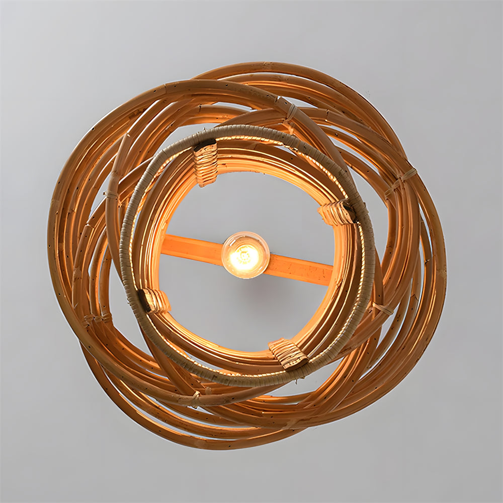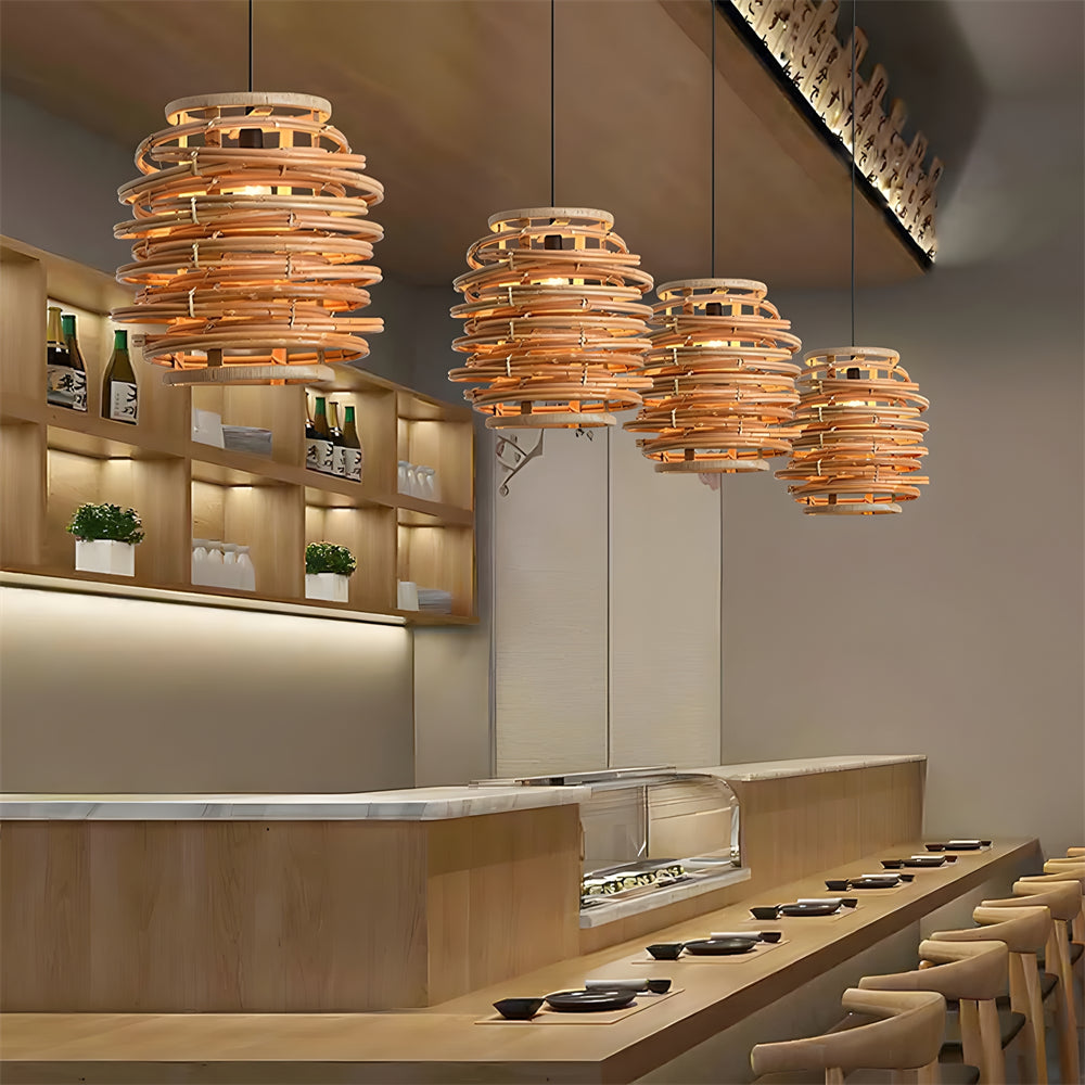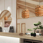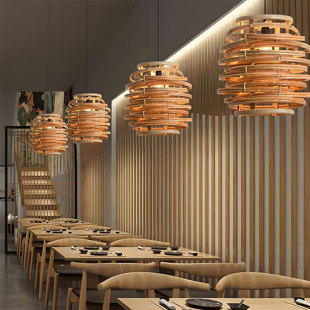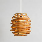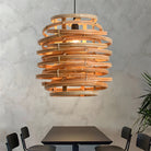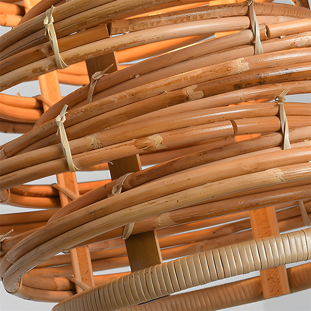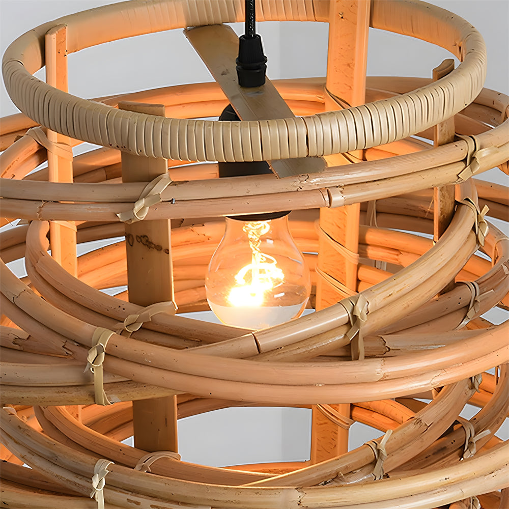 Expertly handwoven from bamboo, this pendant lamp showcases a unique stacked ring design that creates organic texture and visual depth. It emits a warm, dappled glow, infusing any room with serene natural elegance.