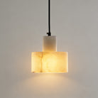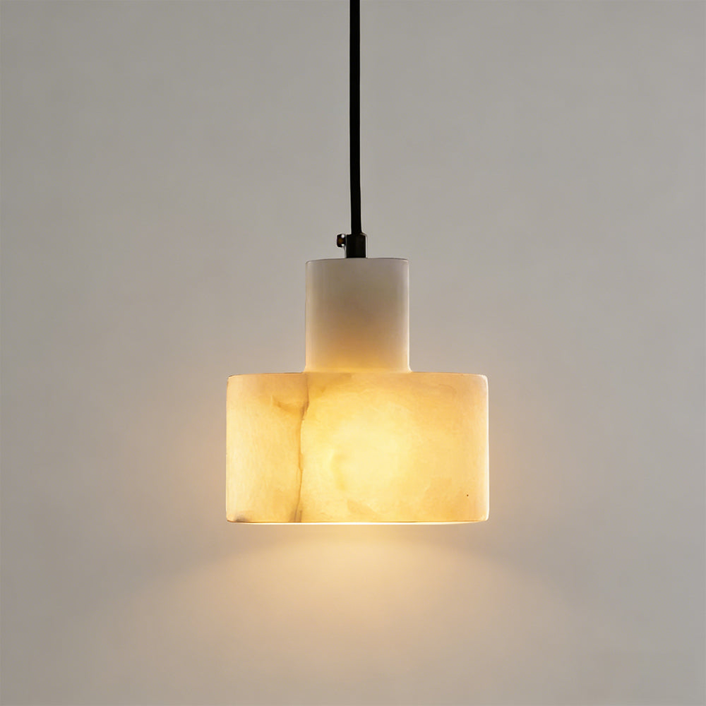 Hung to shine, this cylinder lamp emits soft, elegant warmth. Its three-dimensional structure pairs beautifully with a hand-cut and polished alabaster shade—craftsmanship that adds refined allure to any room.
