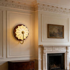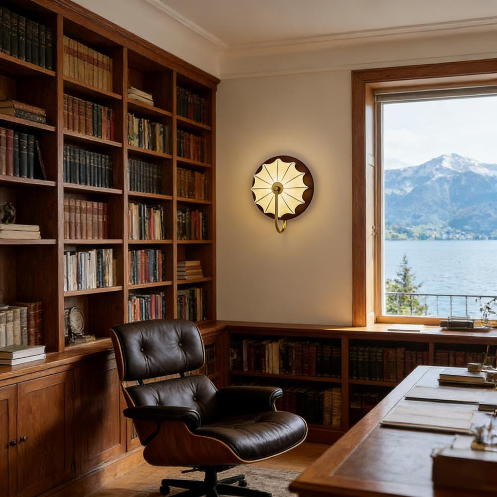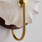 Infuse your space with organic elegance! This wall light’s lotus-shaped curved panels emit cozy glow, adorned with delicate botanical/mythical etchings. Cream fabric shade pairs with bronzed canopy for understated, modern charm.
