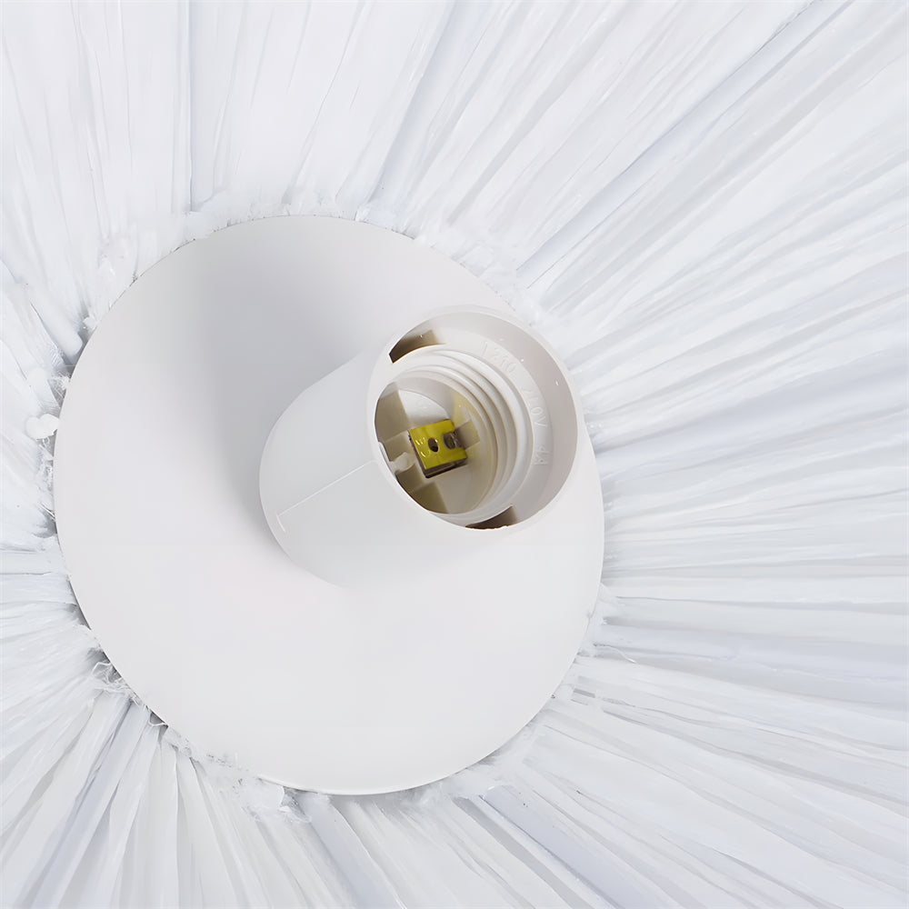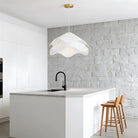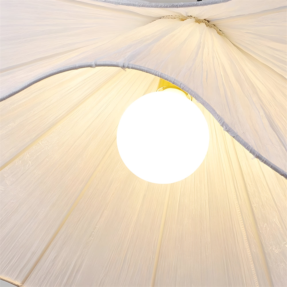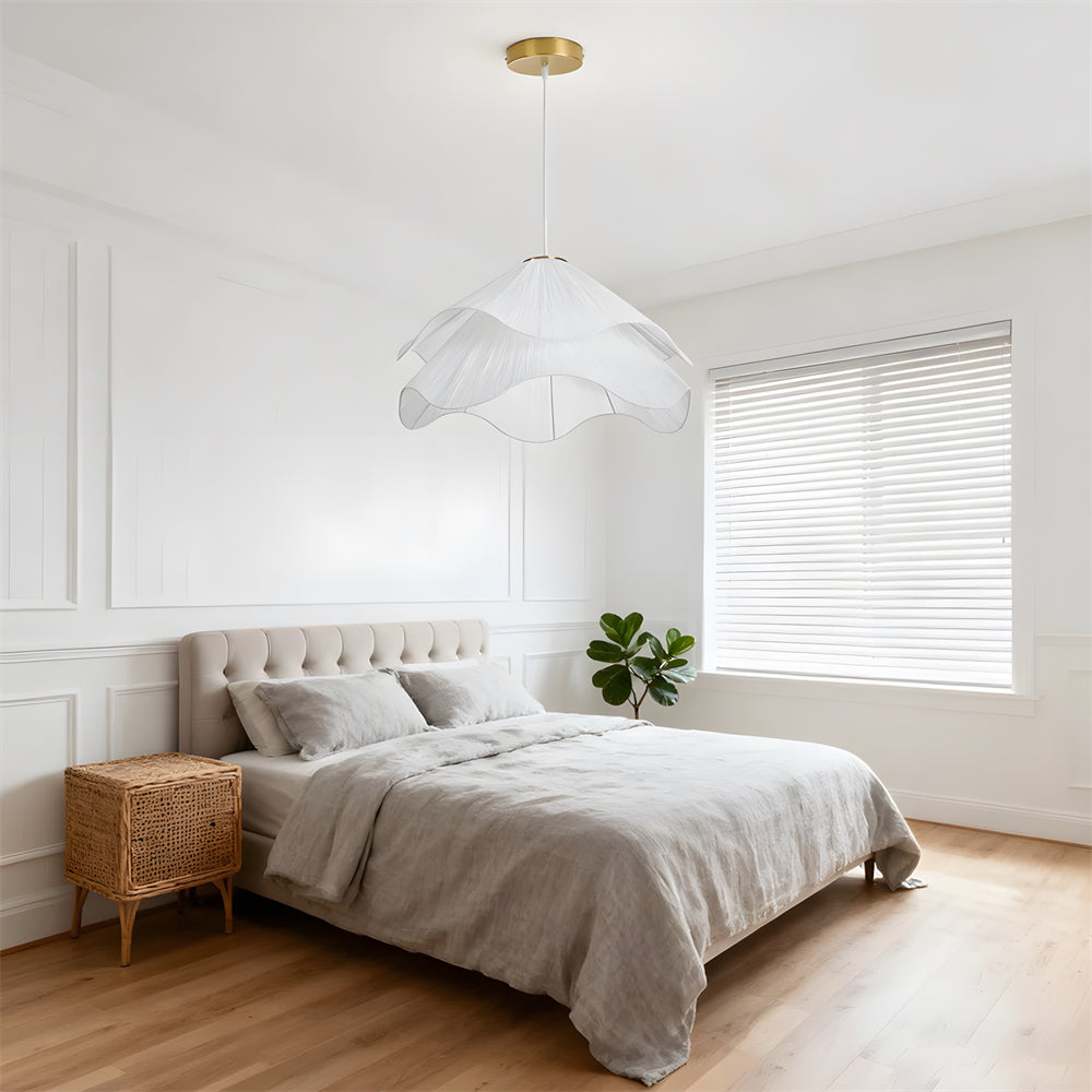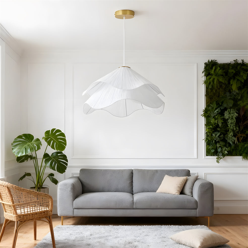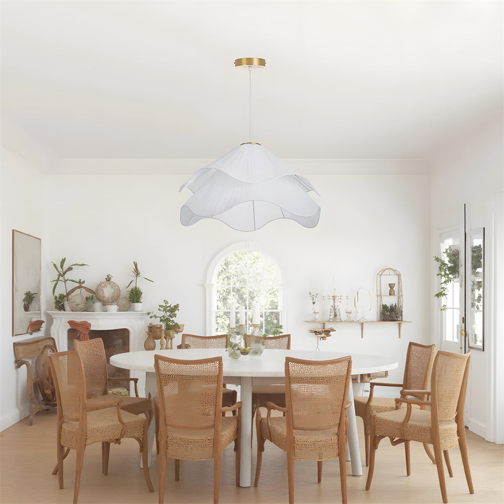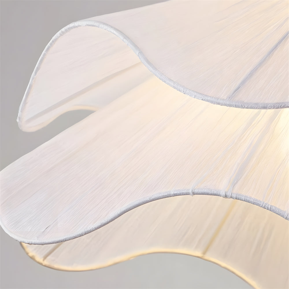 This white fabric chandelier features an elegant, smooth curvature reminiscent of a blooming flower, casting a soft and artistic play of light and shadow. Its cascading wave-shaped shade is designed to diffuse illumination gently and evenly, adding a dreamy yet cozy warmth to any room.