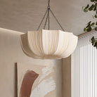 This lamp features an off-white fabric shade, hand-stitched for a soft, warm texture. Natural folds in the fabric interact with light, which diffuses evenly through the material to create a gentle, romantic glow. Ideal for dining rooms, bedrooms, living rooms, cafes, and other spaces.