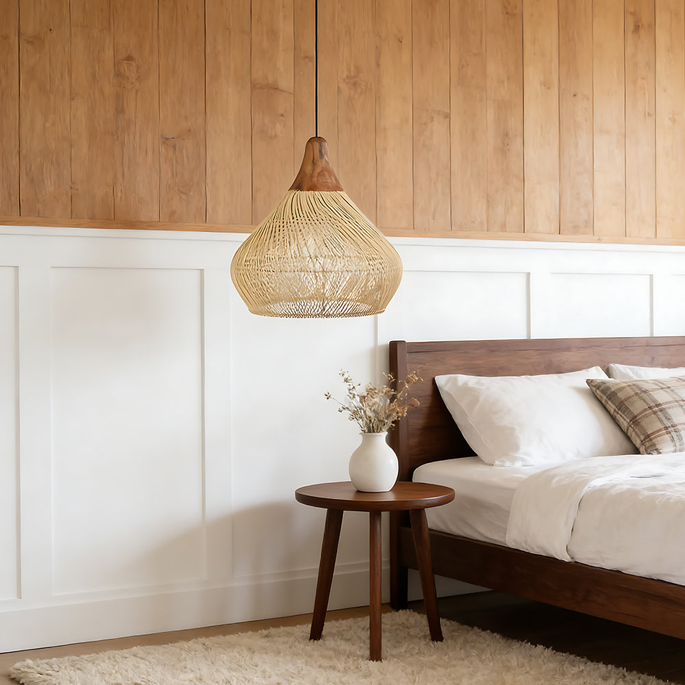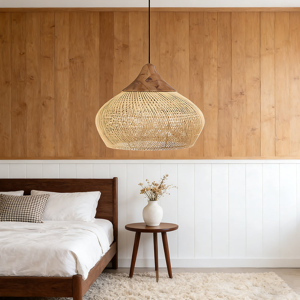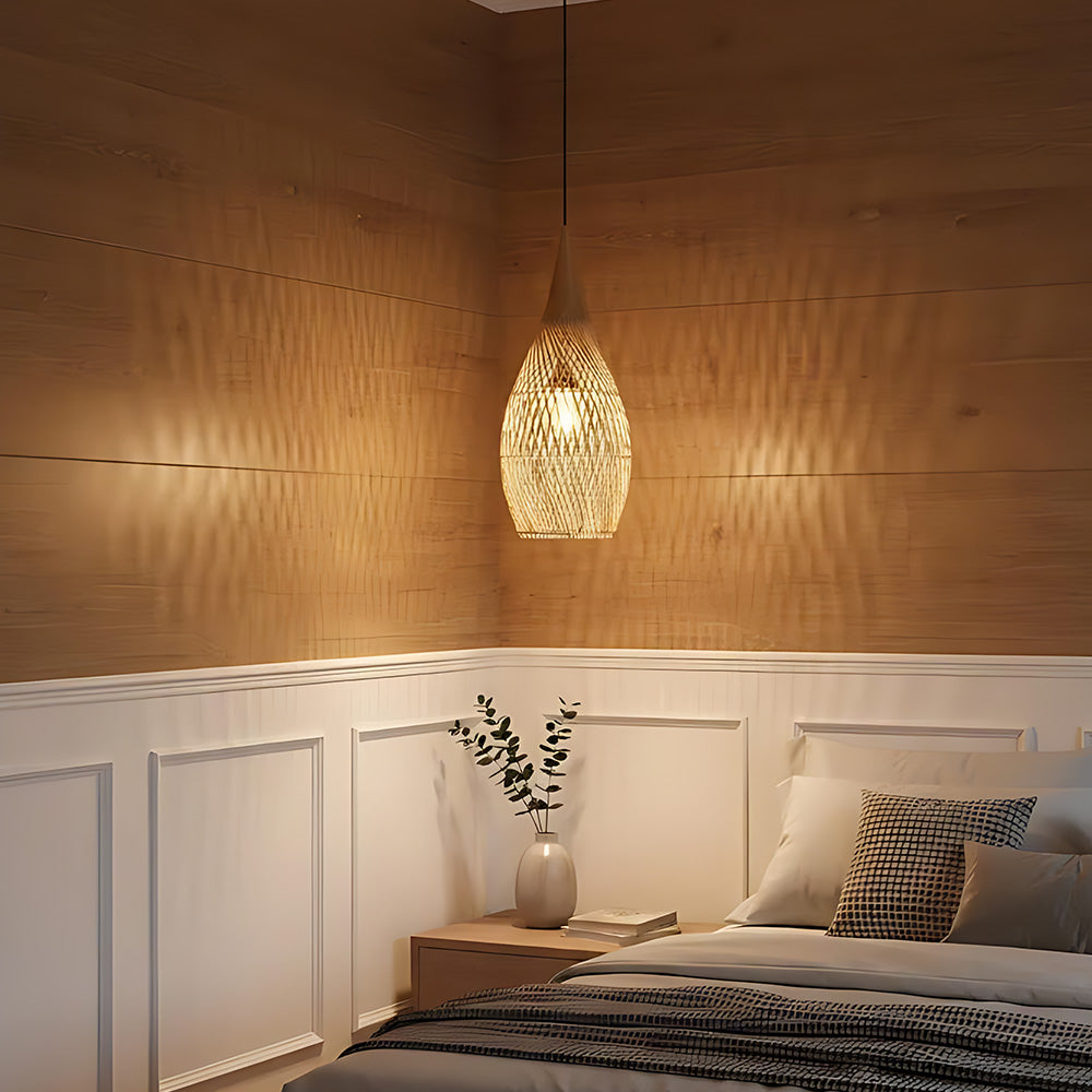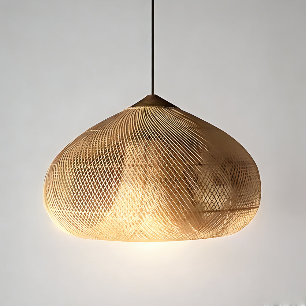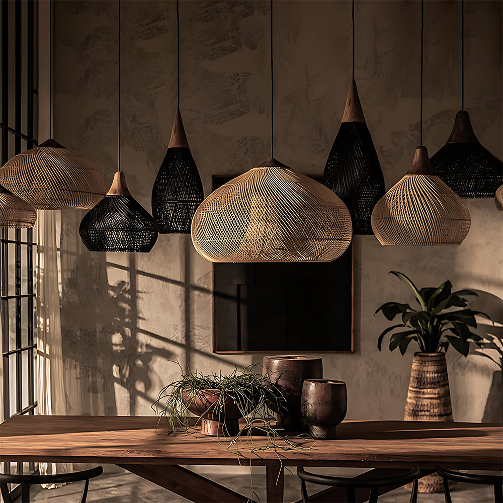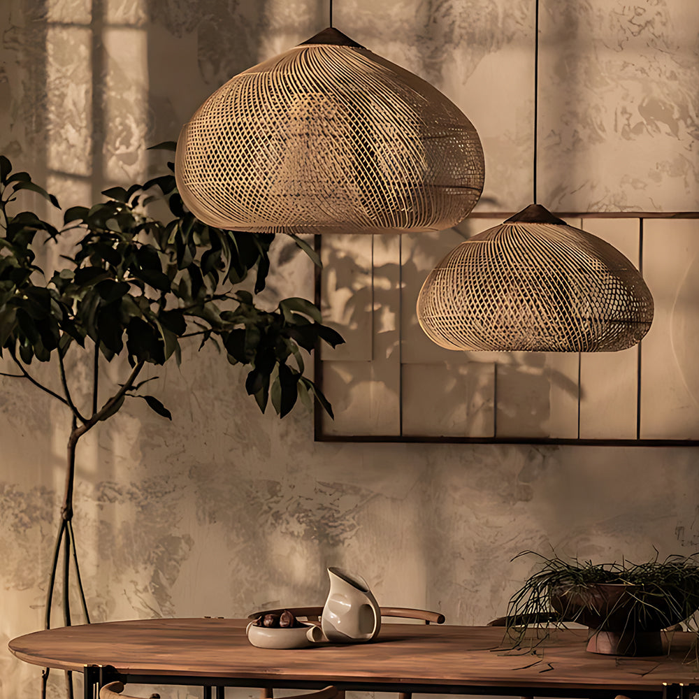 This lamp is hand-woven from natural rattan, presenting a rounded, full cocoon-shaped silhouette. Gaps in the weave allow light to filter through softly, creating a warm, dappled glow. Ideal for dining rooms, tea rooms, bedrooms, and other spaces—it brings a touch of handcrafted warmth and natural poetry indoors.