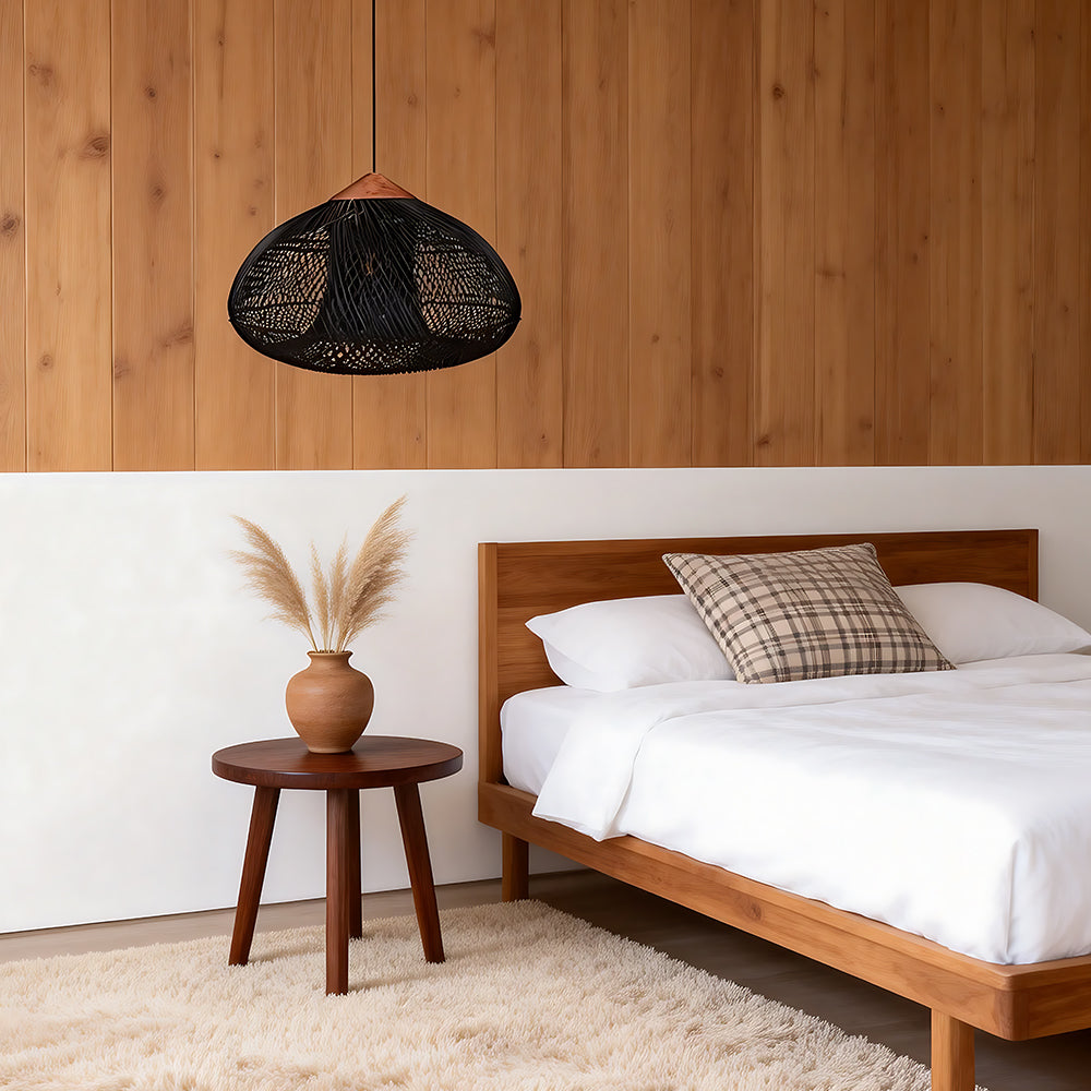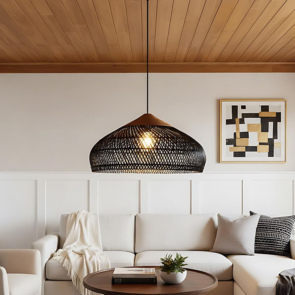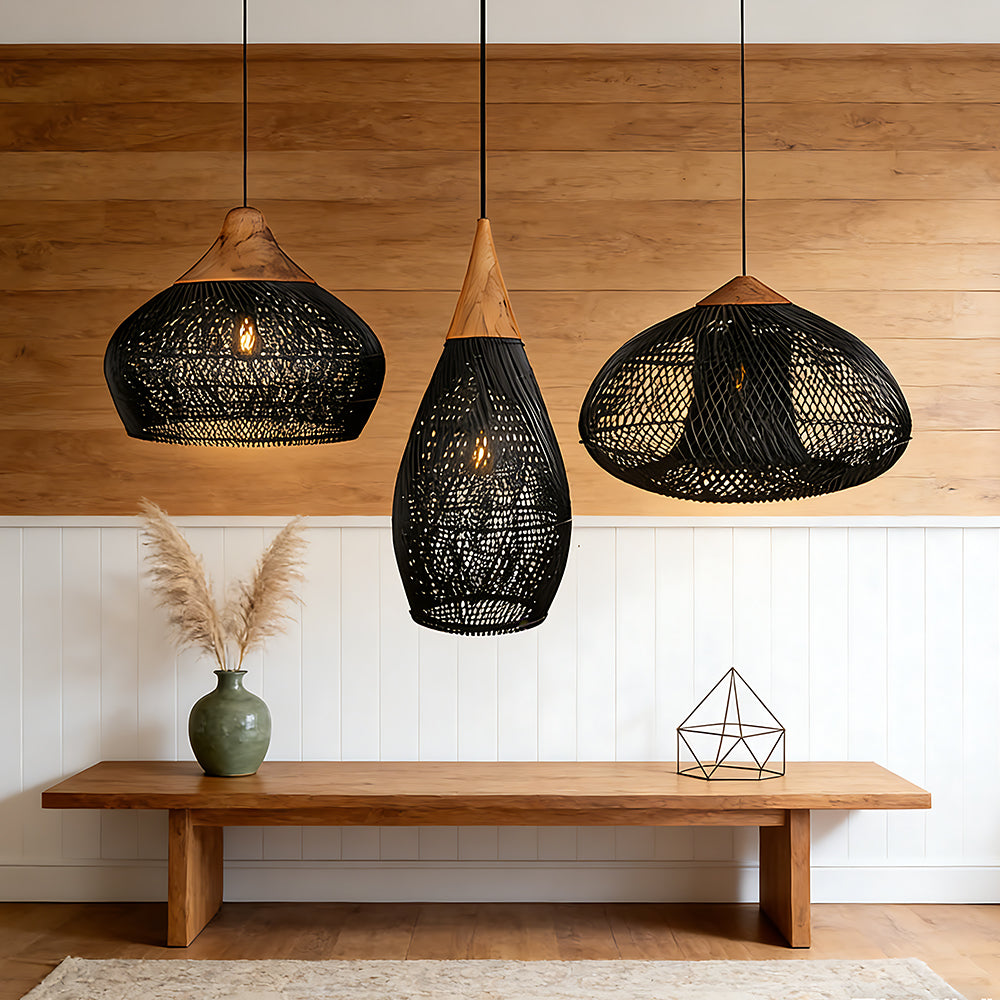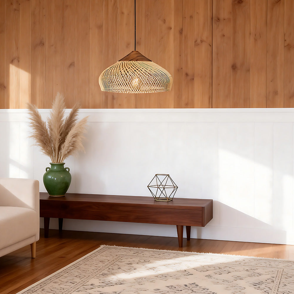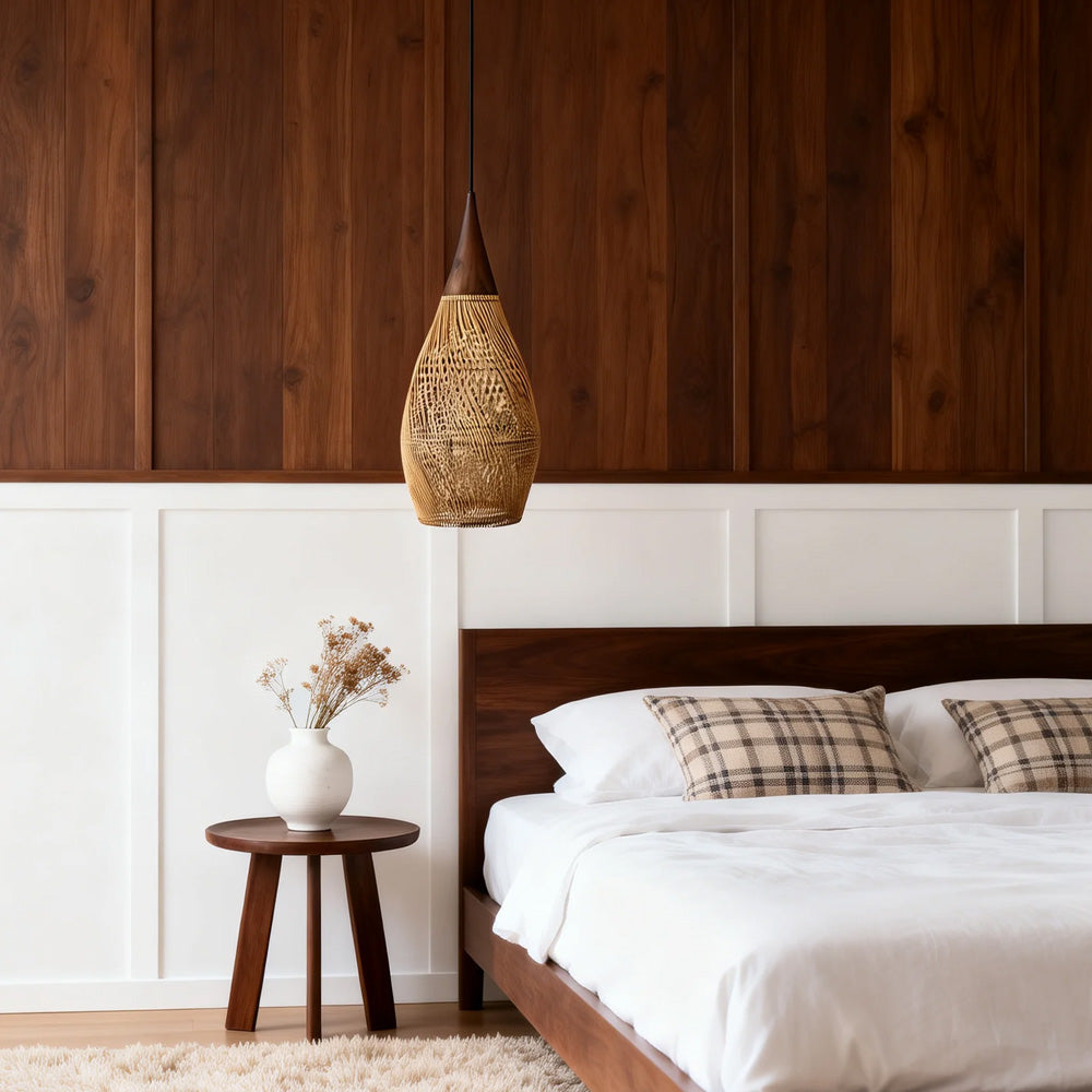 This lamp is hand-woven from natural rattan, presenting a rounded, full cocoon-shaped silhouette. Gaps in the weave allow light to filter through softly, creating a warm, dappled glow. Ideal for dining rooms, tea rooms, bedrooms, and other spaces—it brings a touch of handcrafted warmth and natural poetry indoors.