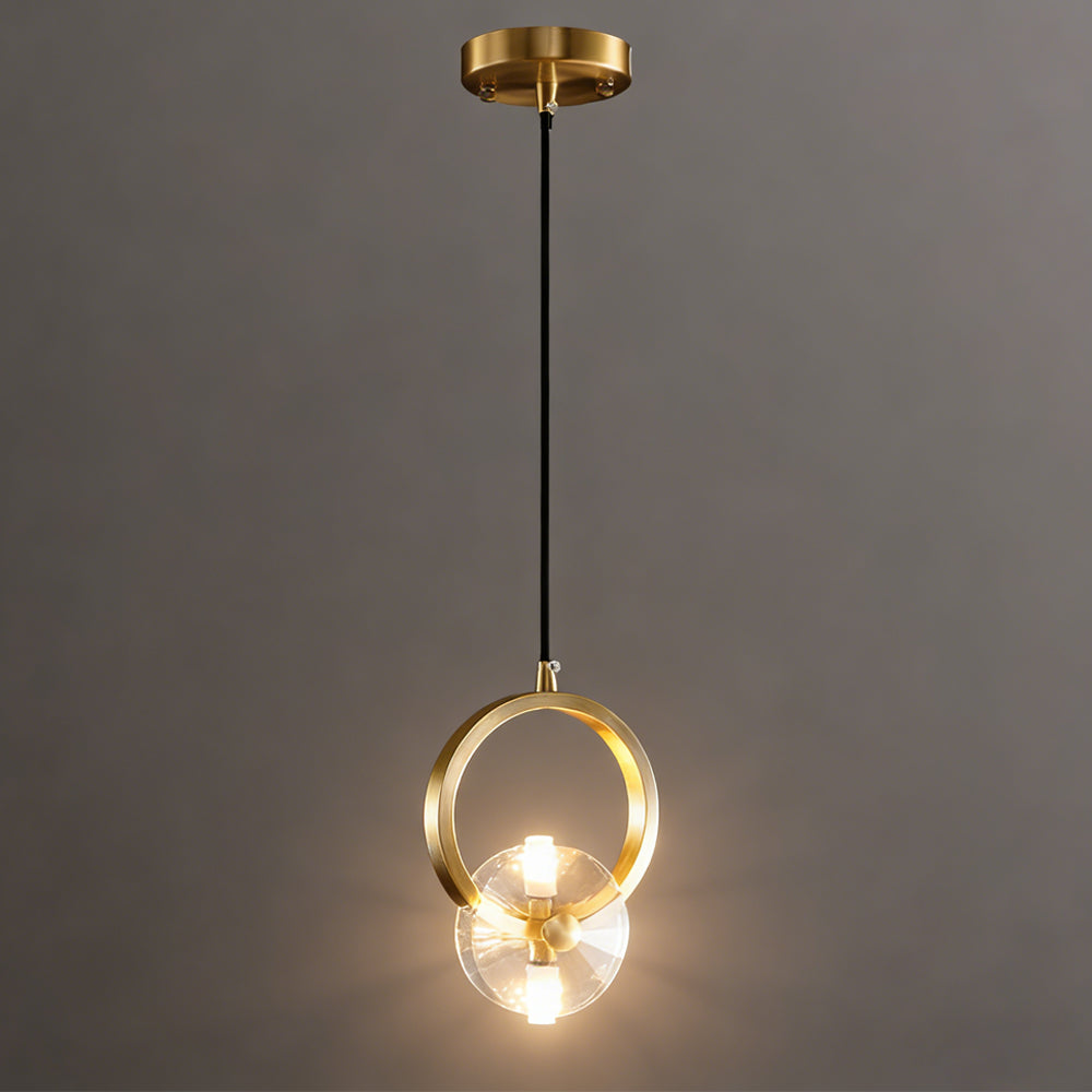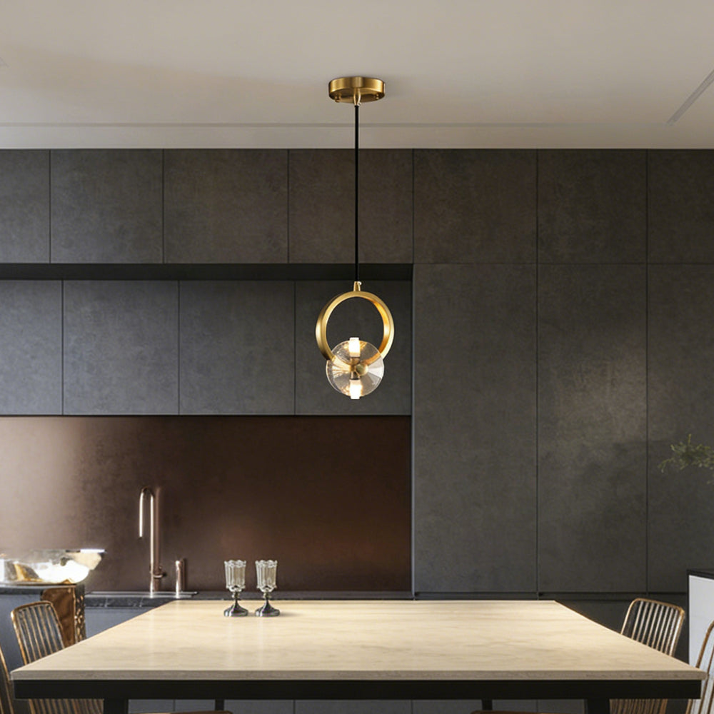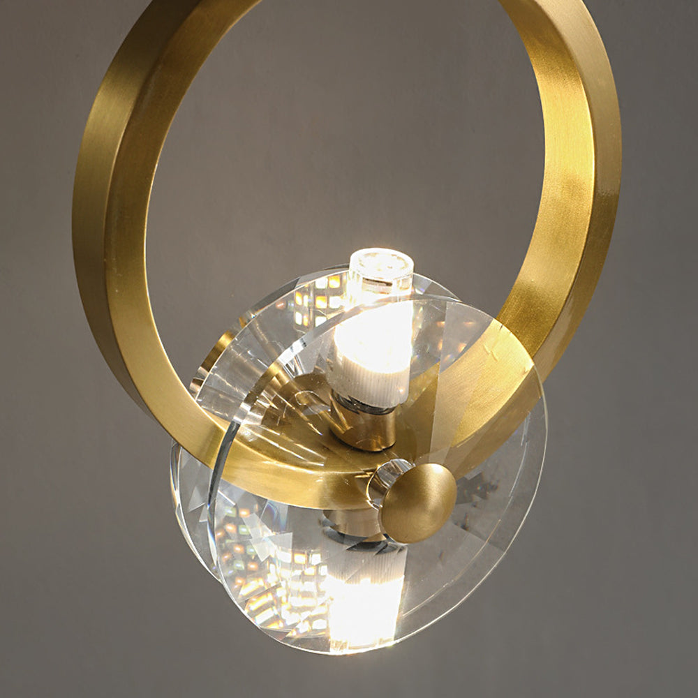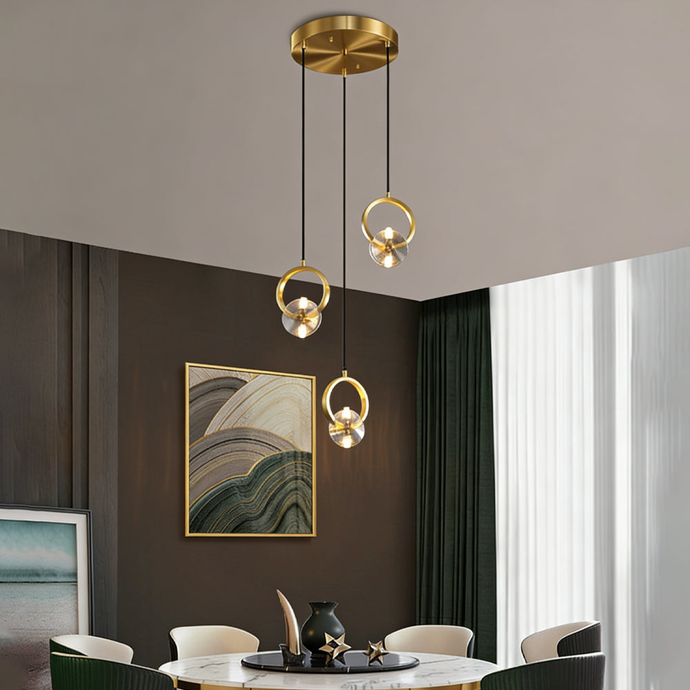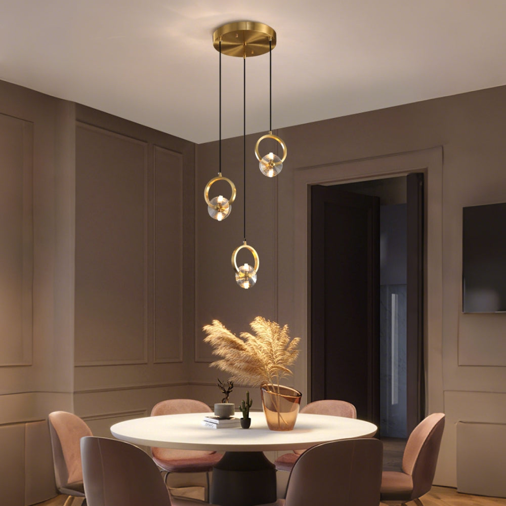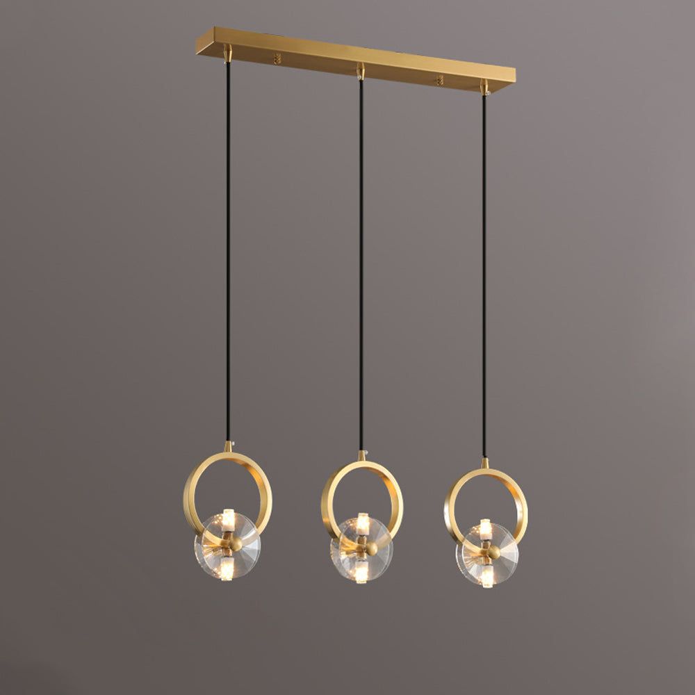 This bold crystal pendant light features elegant clear crystal shades suspended within polished copper rings, topped with a matching ceiling canopy. Its striking style is perfect for illuminating a counter or bar area.