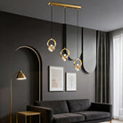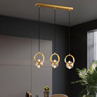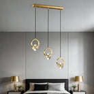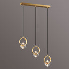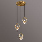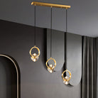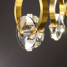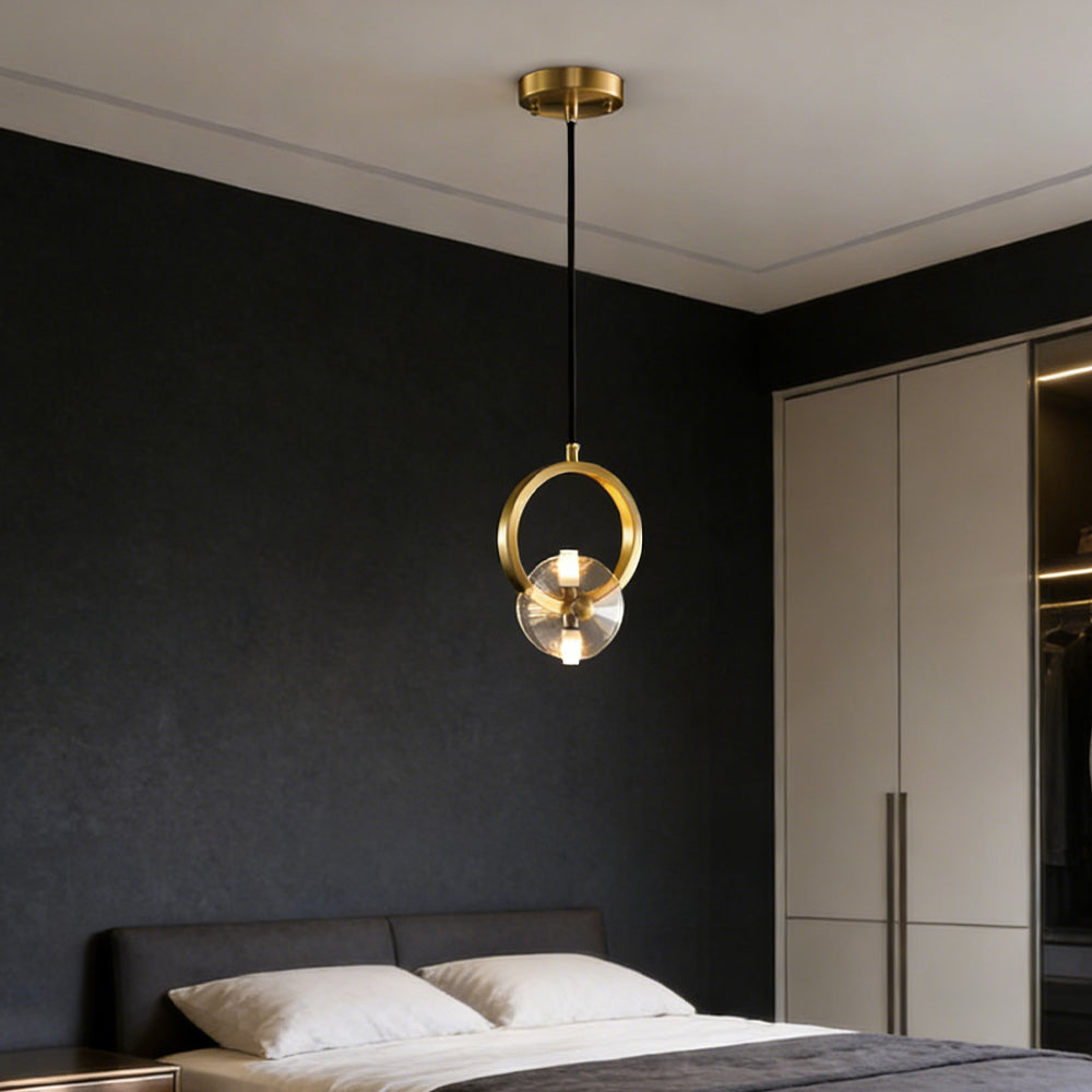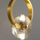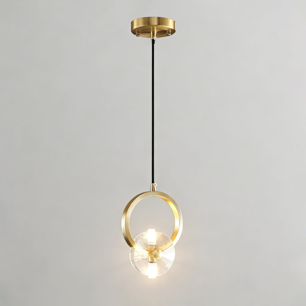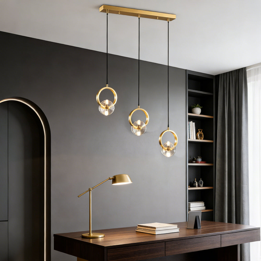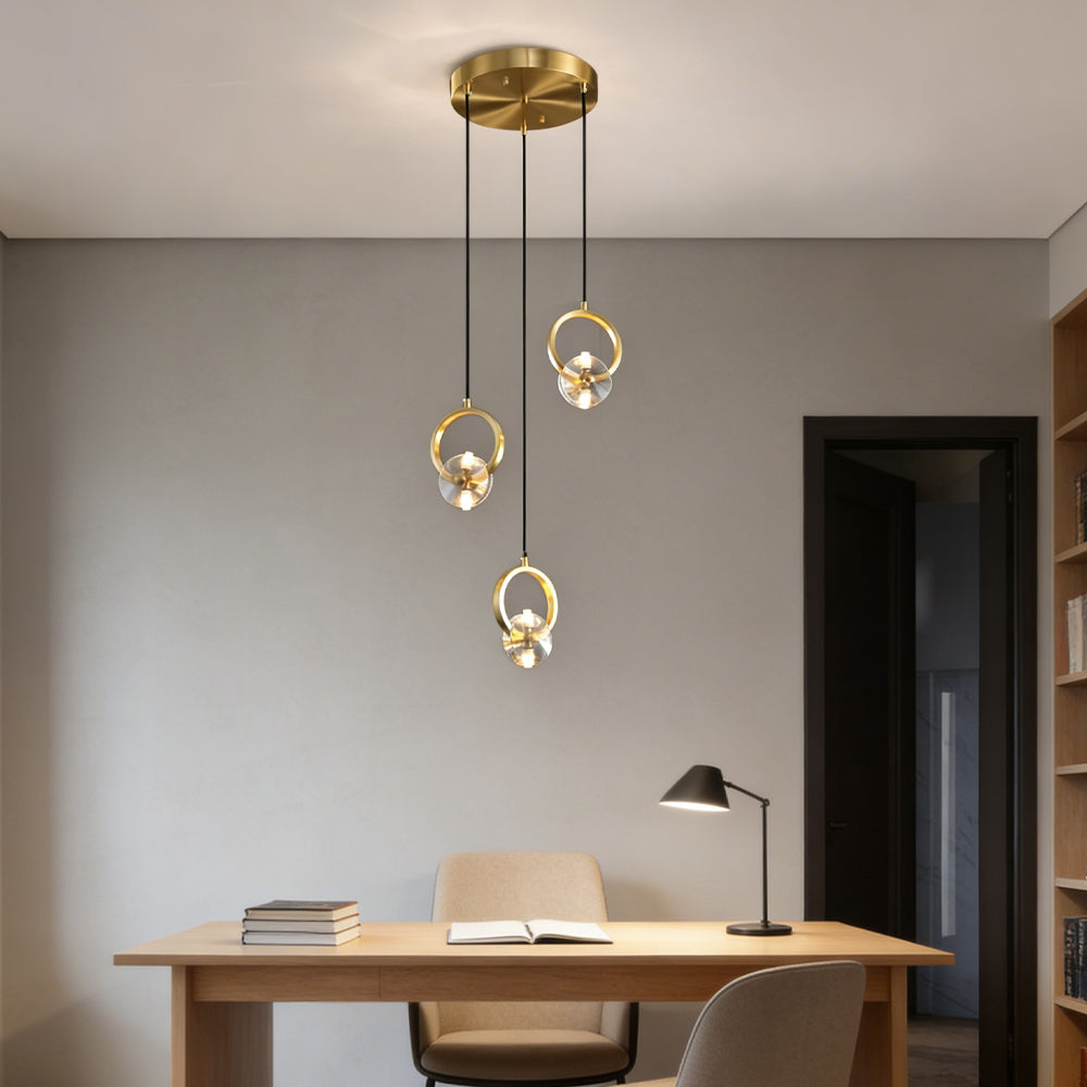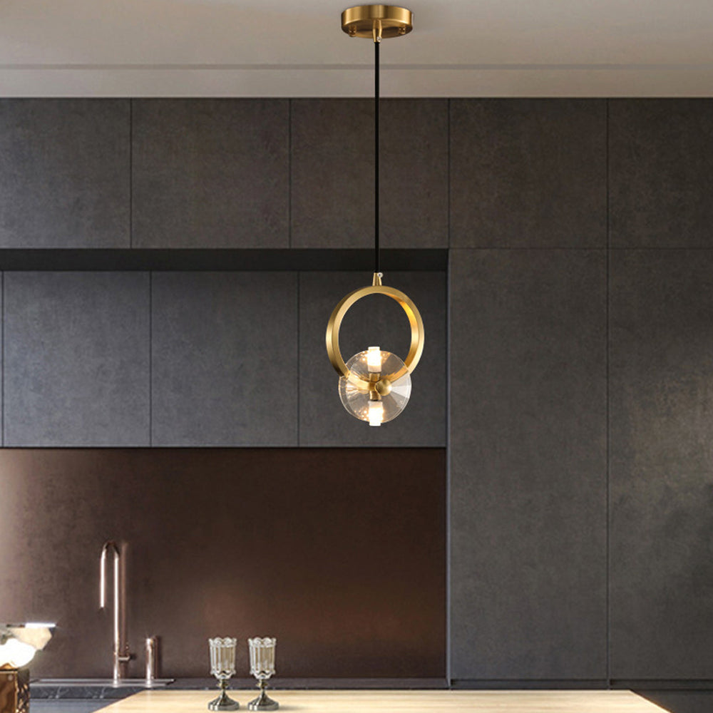 This bold crystal pendant light features elegant clear crystal shades suspended within polished copper rings, topped with a matching ceiling canopy. Its striking style is perfect for illuminating a counter or bar area.