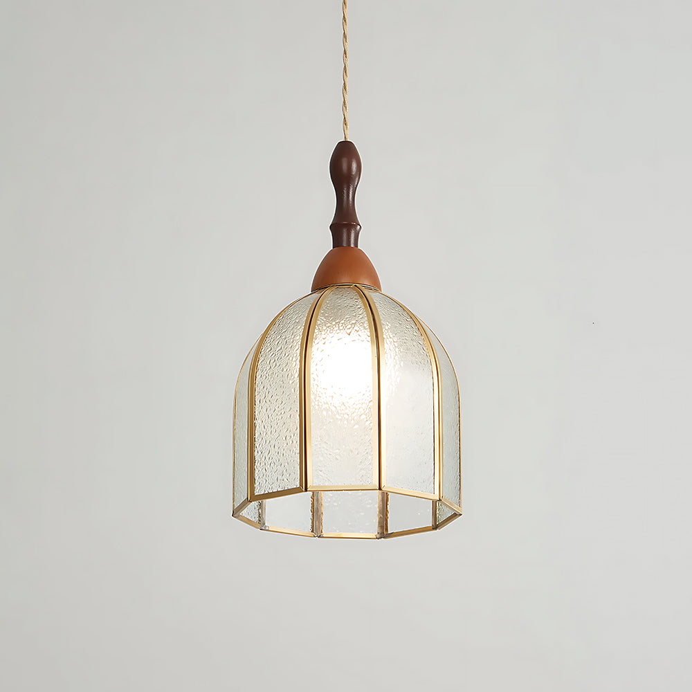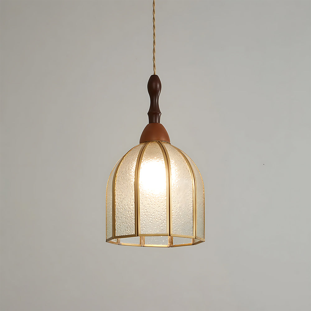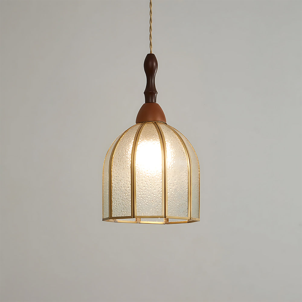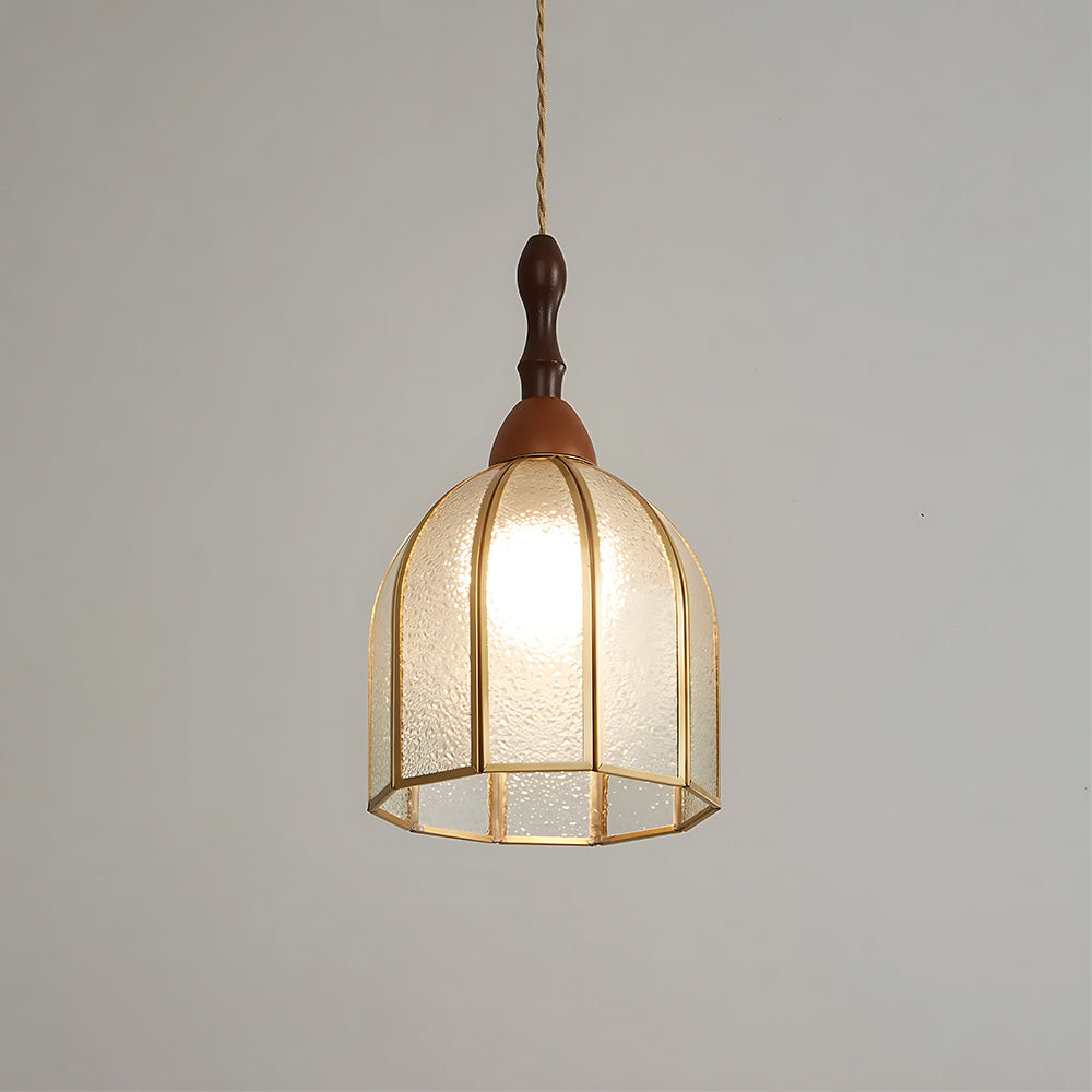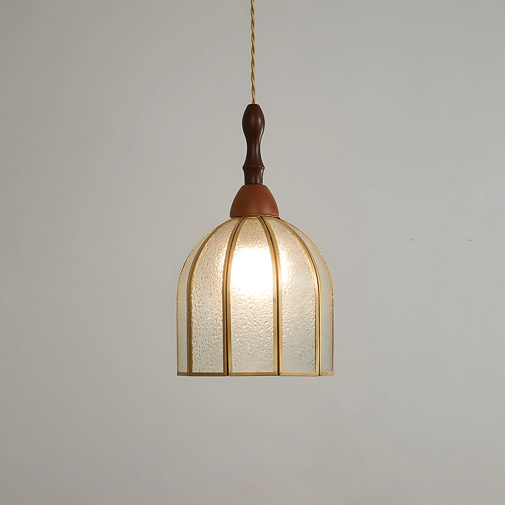 Vintage Artisan Textured Glass Walnut Handle Pendant Light