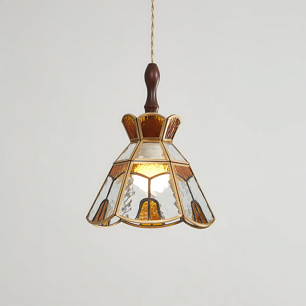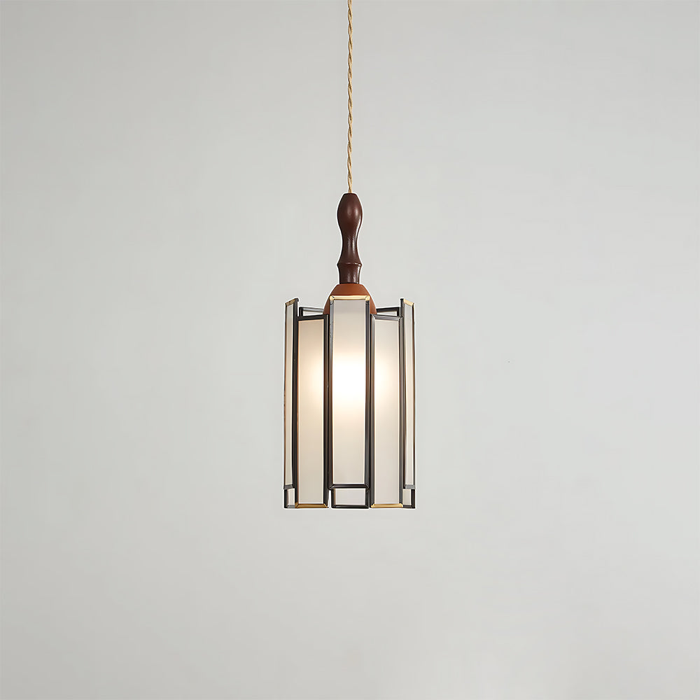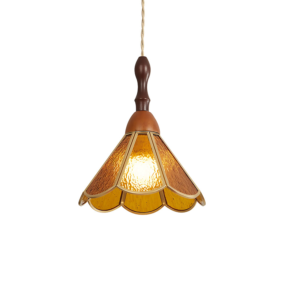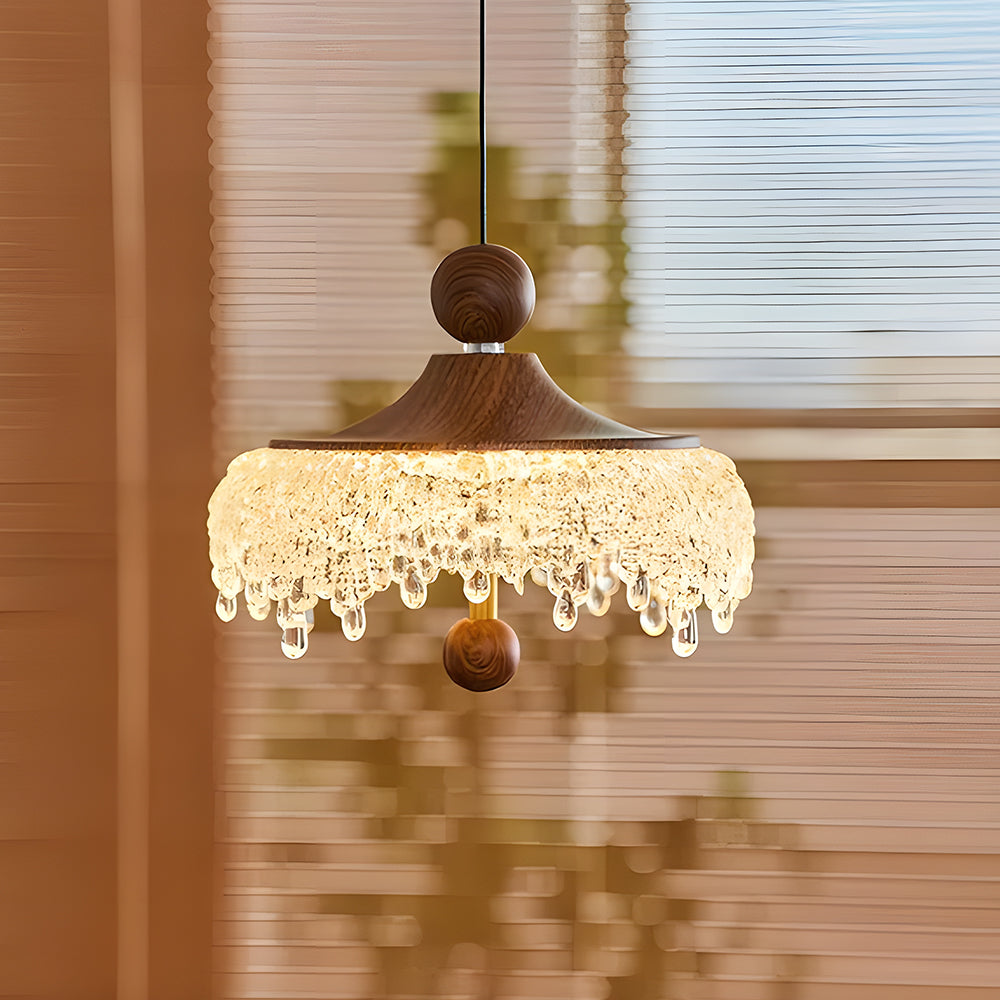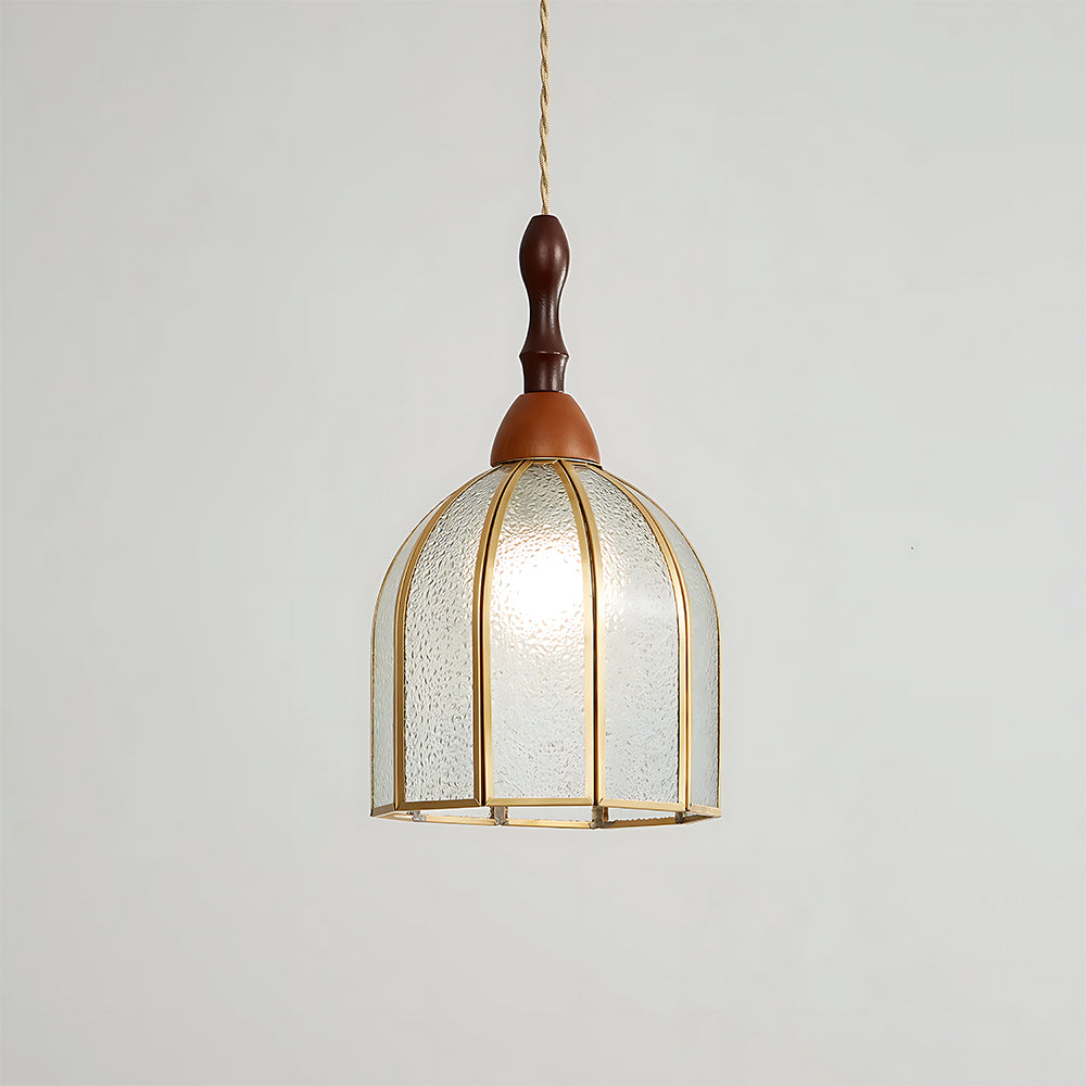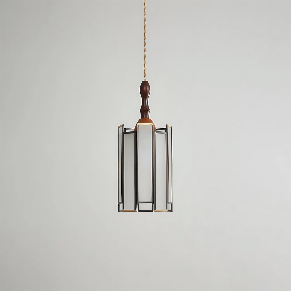 Vintage Artisan Textured Glass Walnut Handle Pendant Light