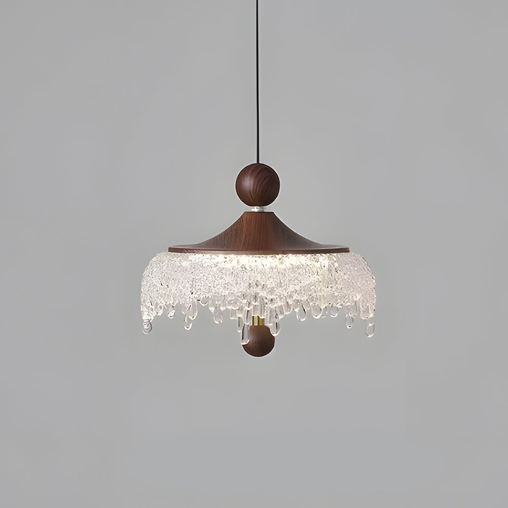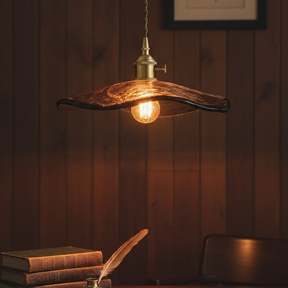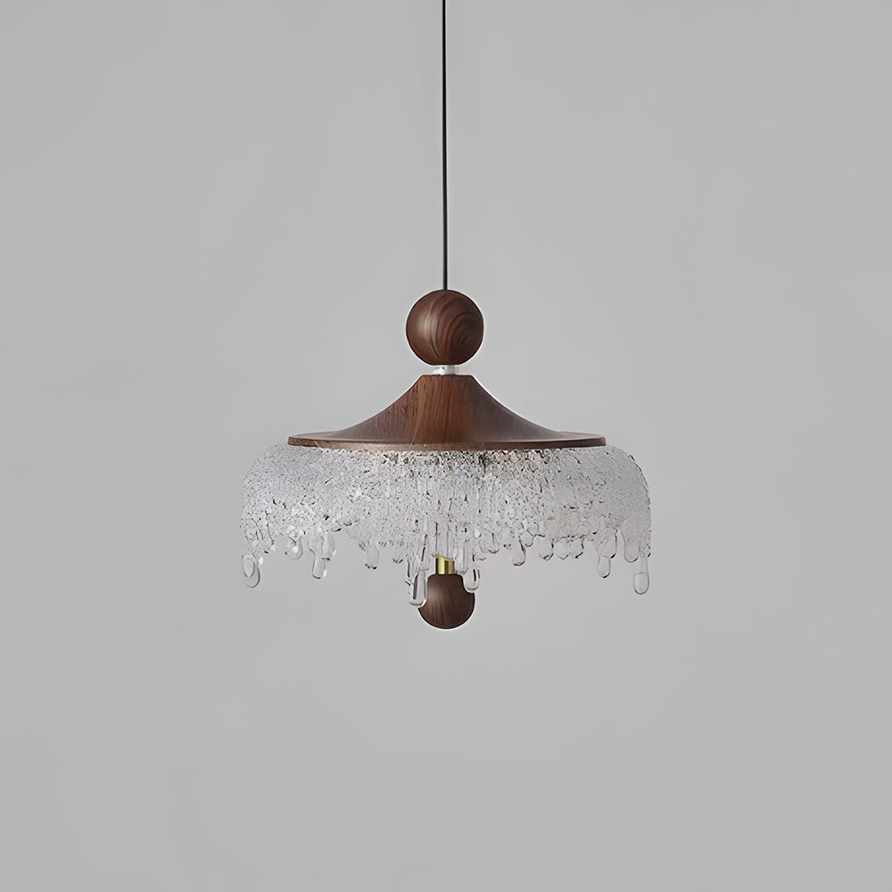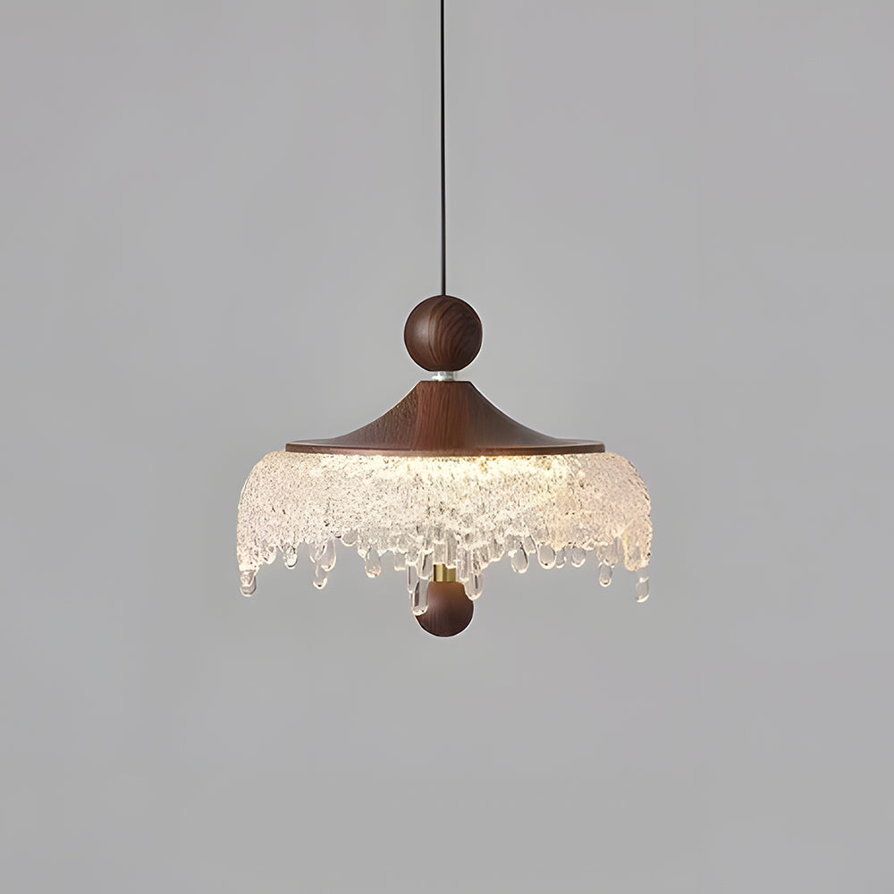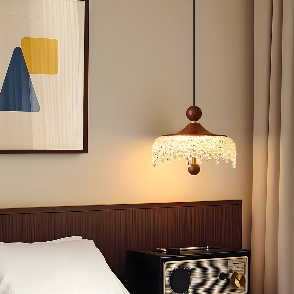 Vintage Artisan Textured Glass Walnut Handle Pendant Light