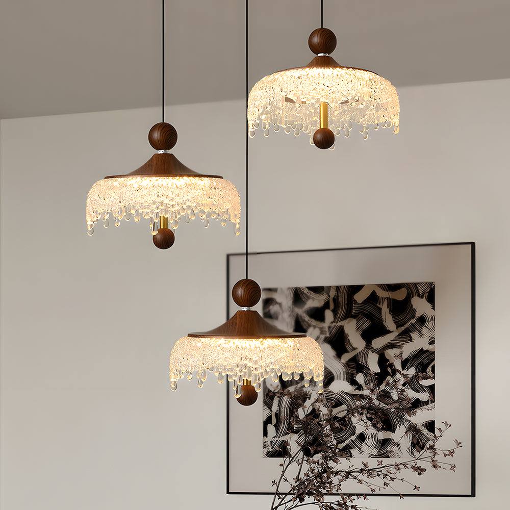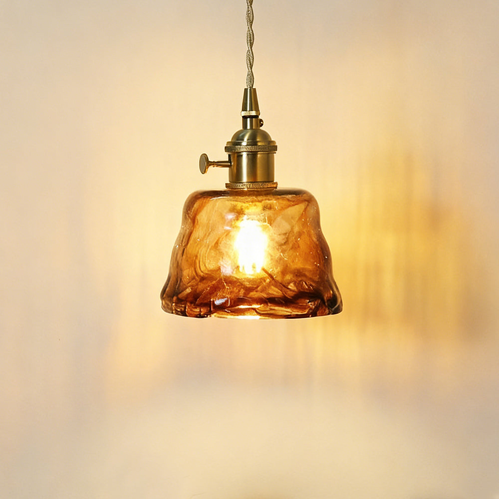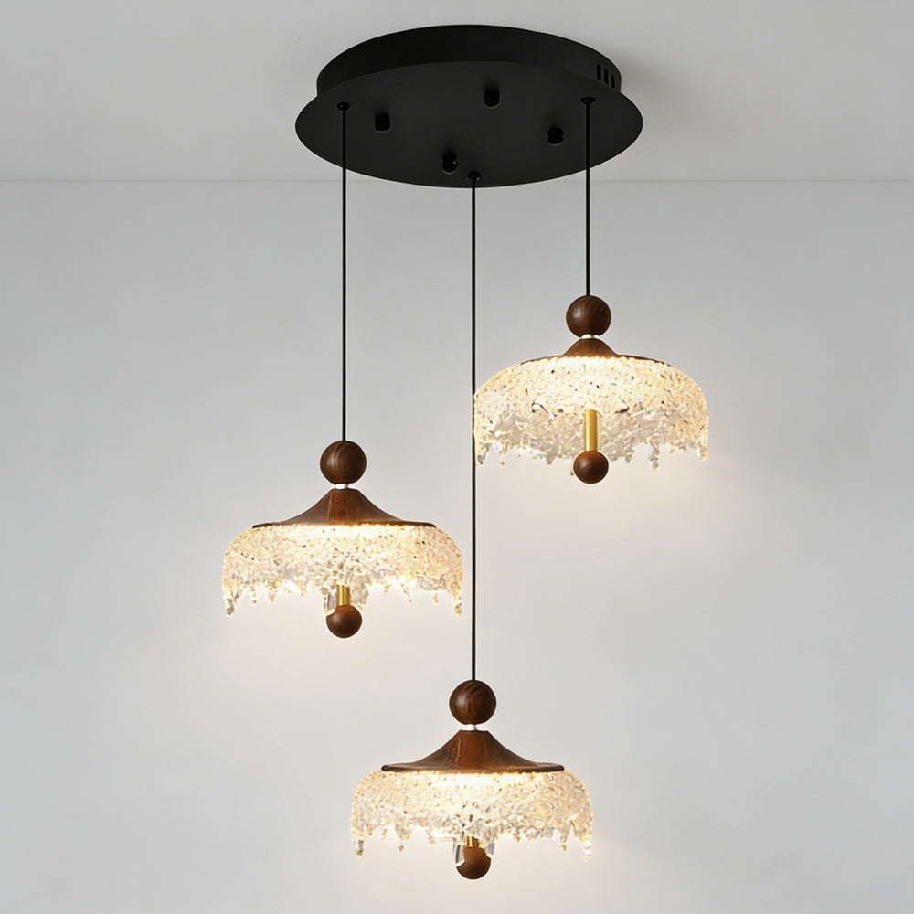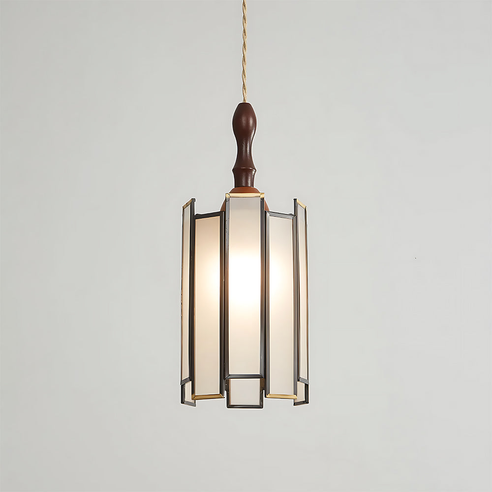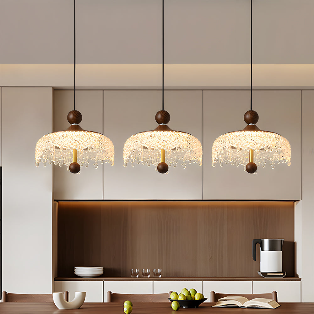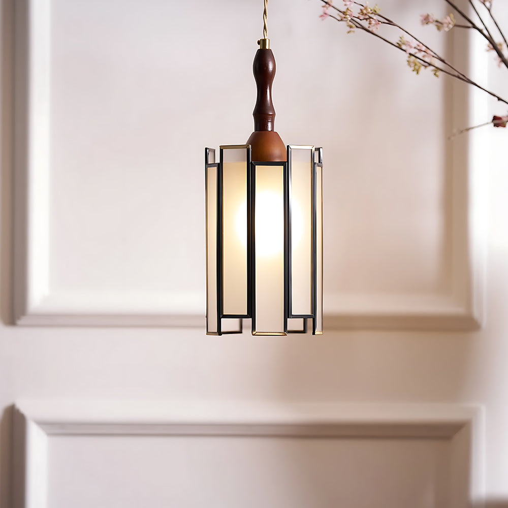 Vintage Artisan Textured Glass Walnut Handle Pendant Light