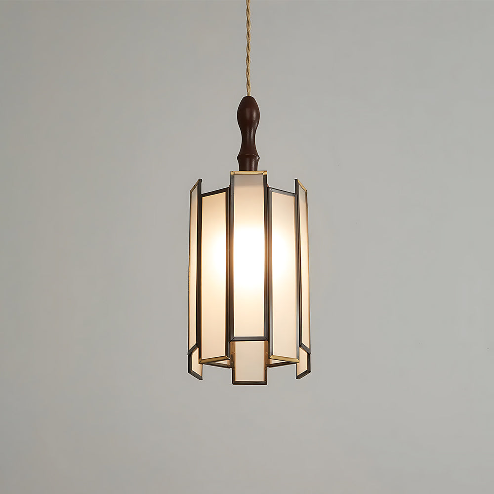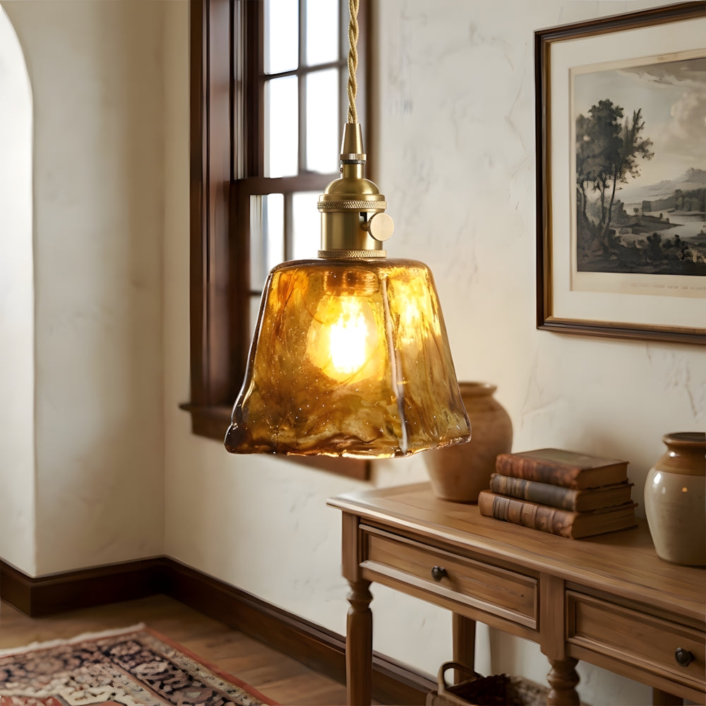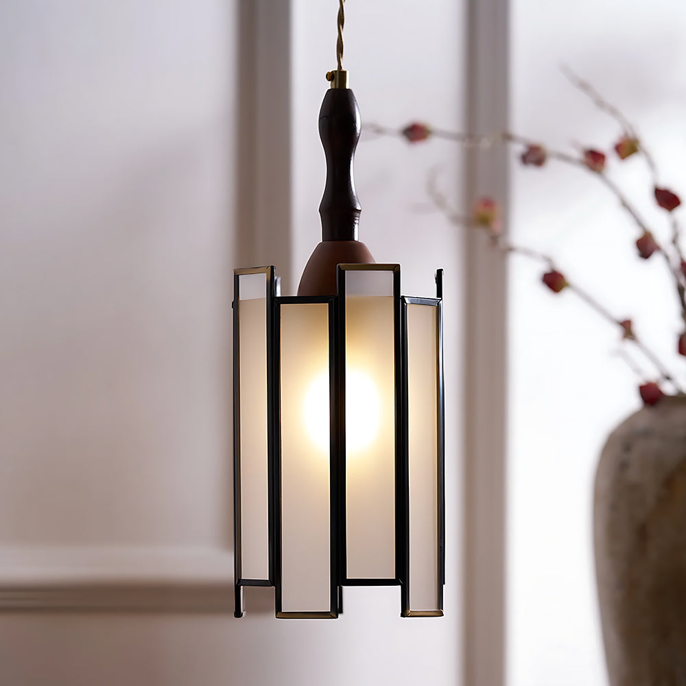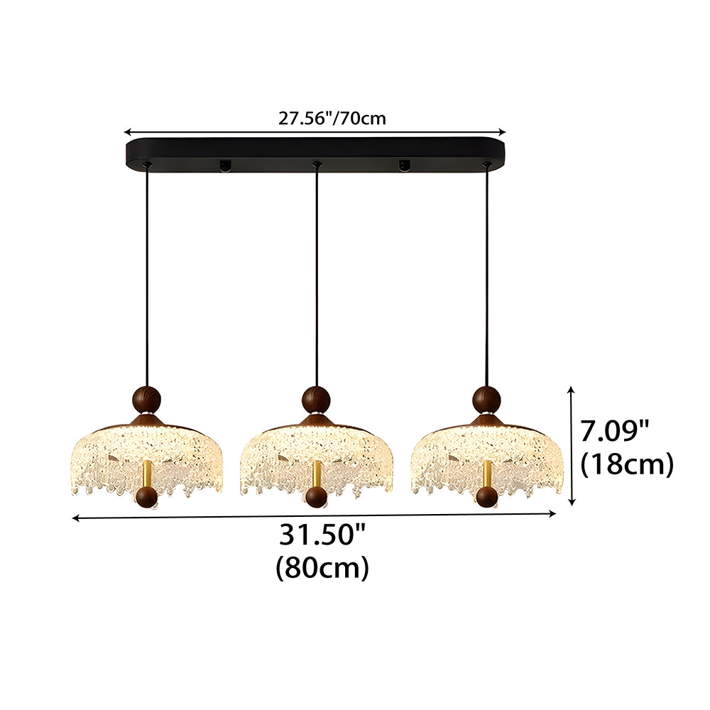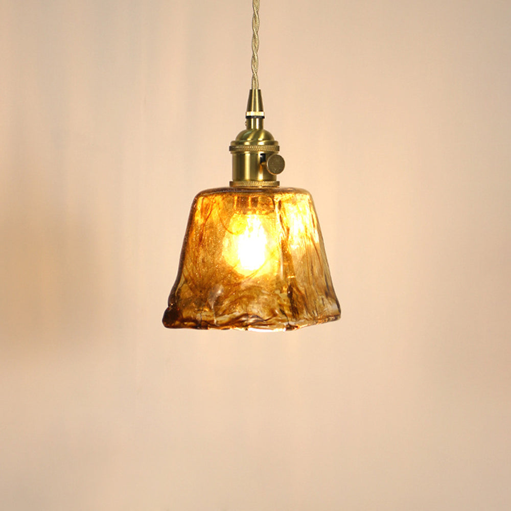 Vintage Artisan Textured Glass Walnut Handle Pendant Light