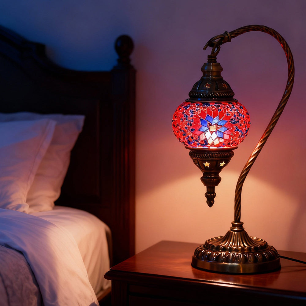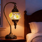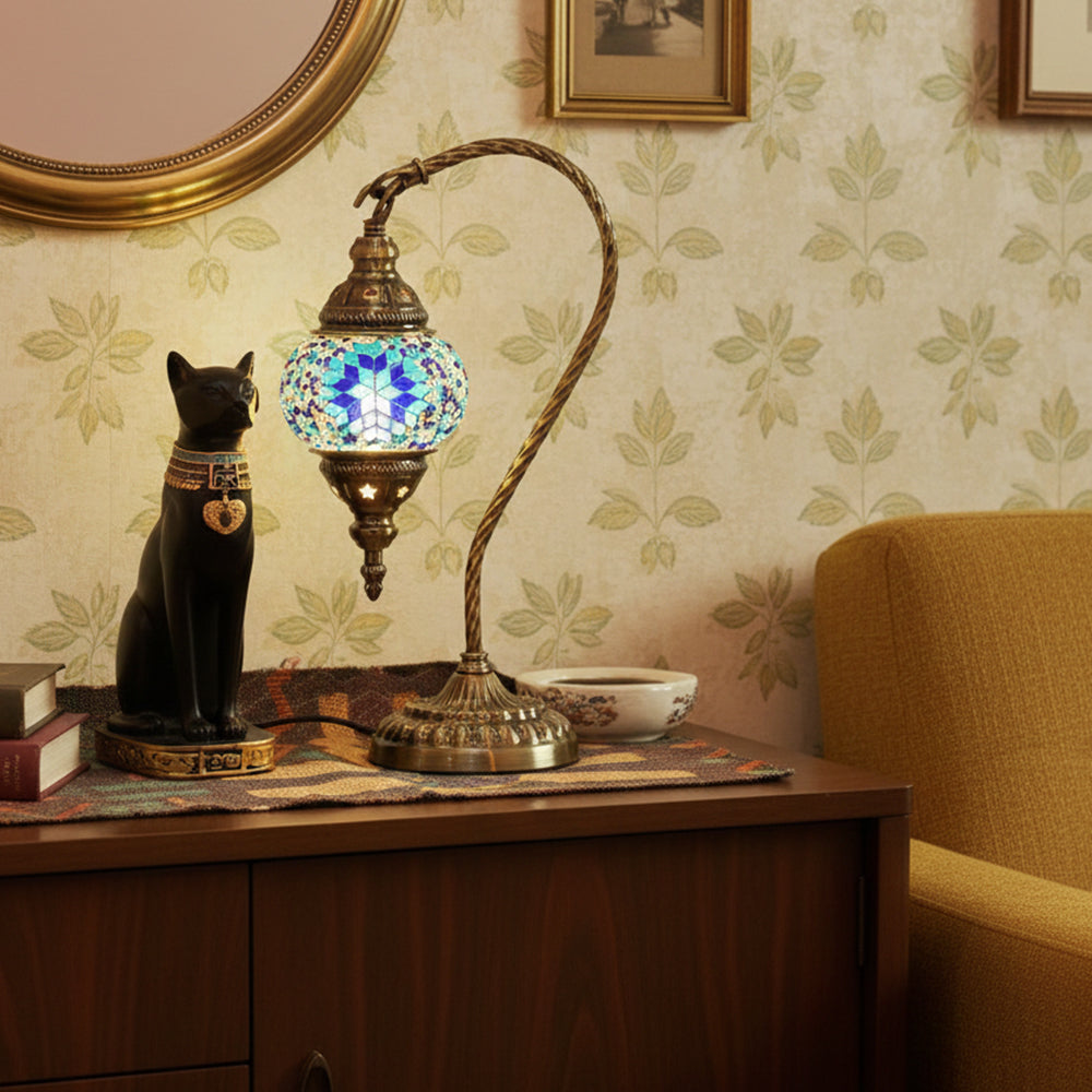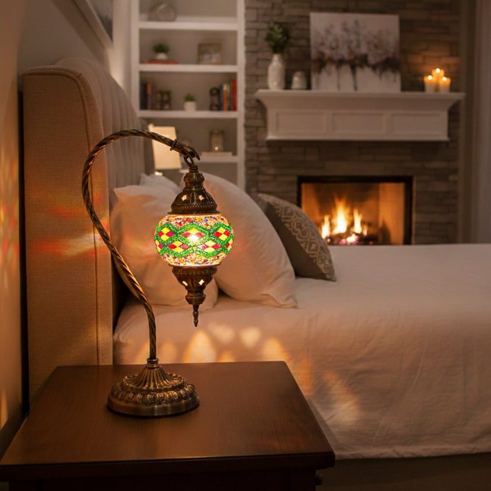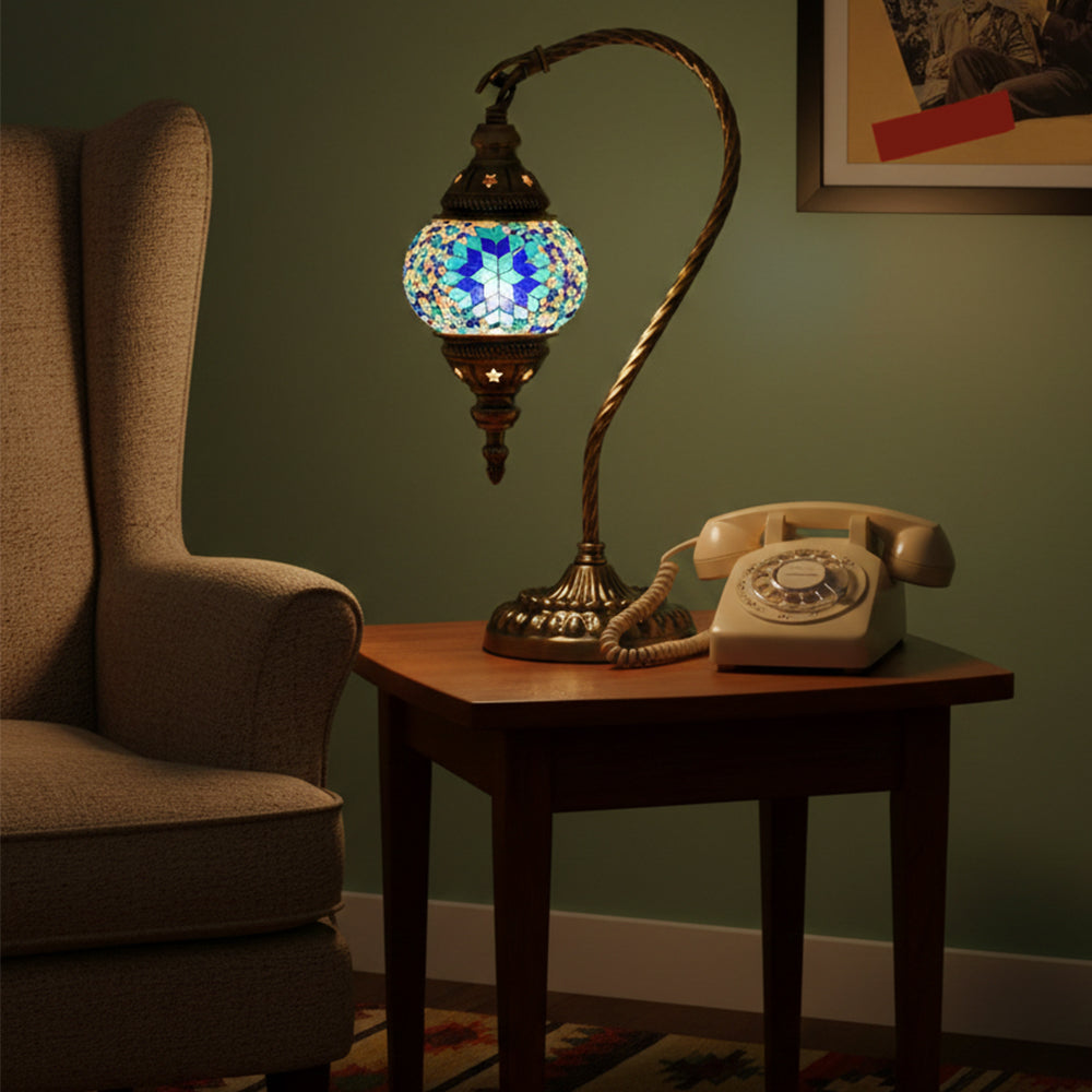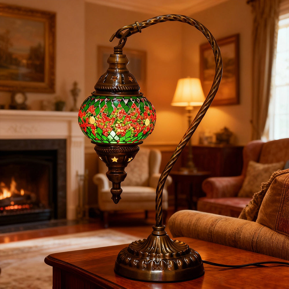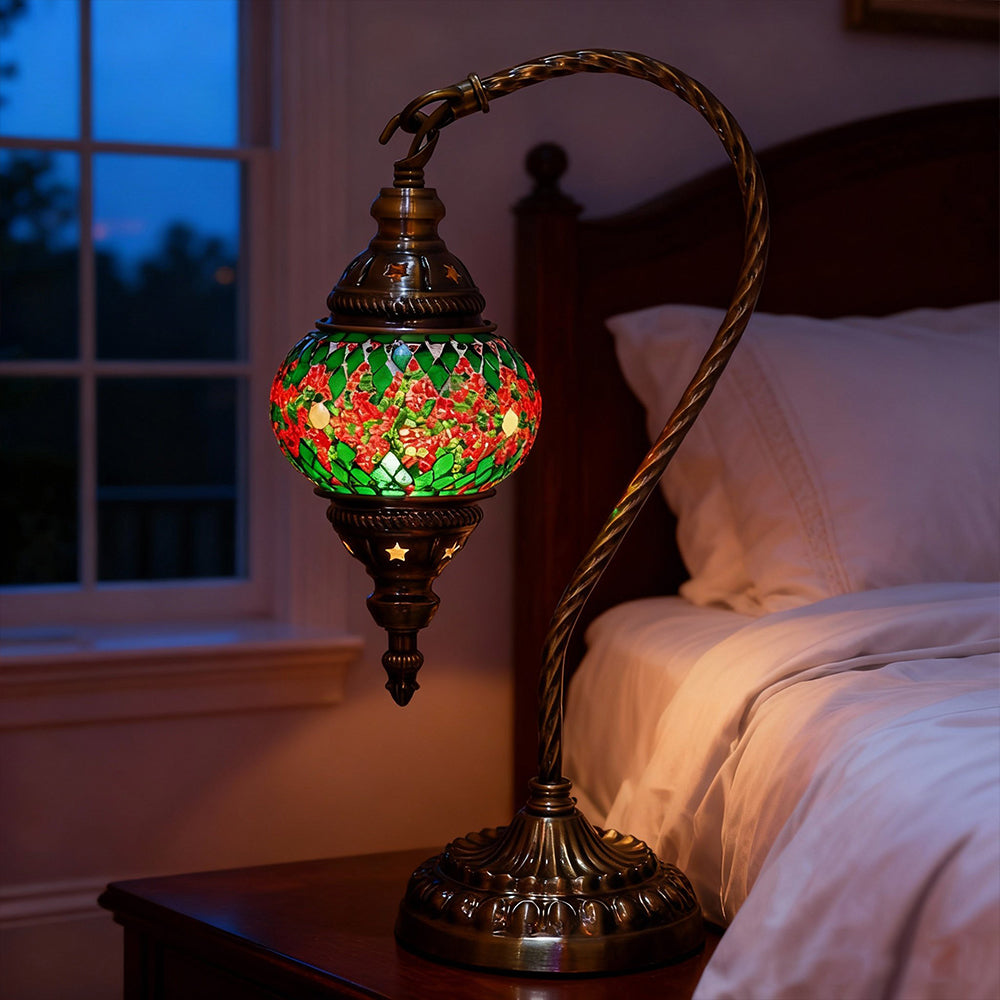 Elevate your decor with this handmade Retro Tiffany Swan Lamp. Crafted with thick inlaid glass, vibrant beads, and ornate iron filigree, this mosaic masterpiece surpasses its photos in beauty. A stunning blend of vintage artistry and quality materials, perfect for adding a timeless, warm glow to any room.